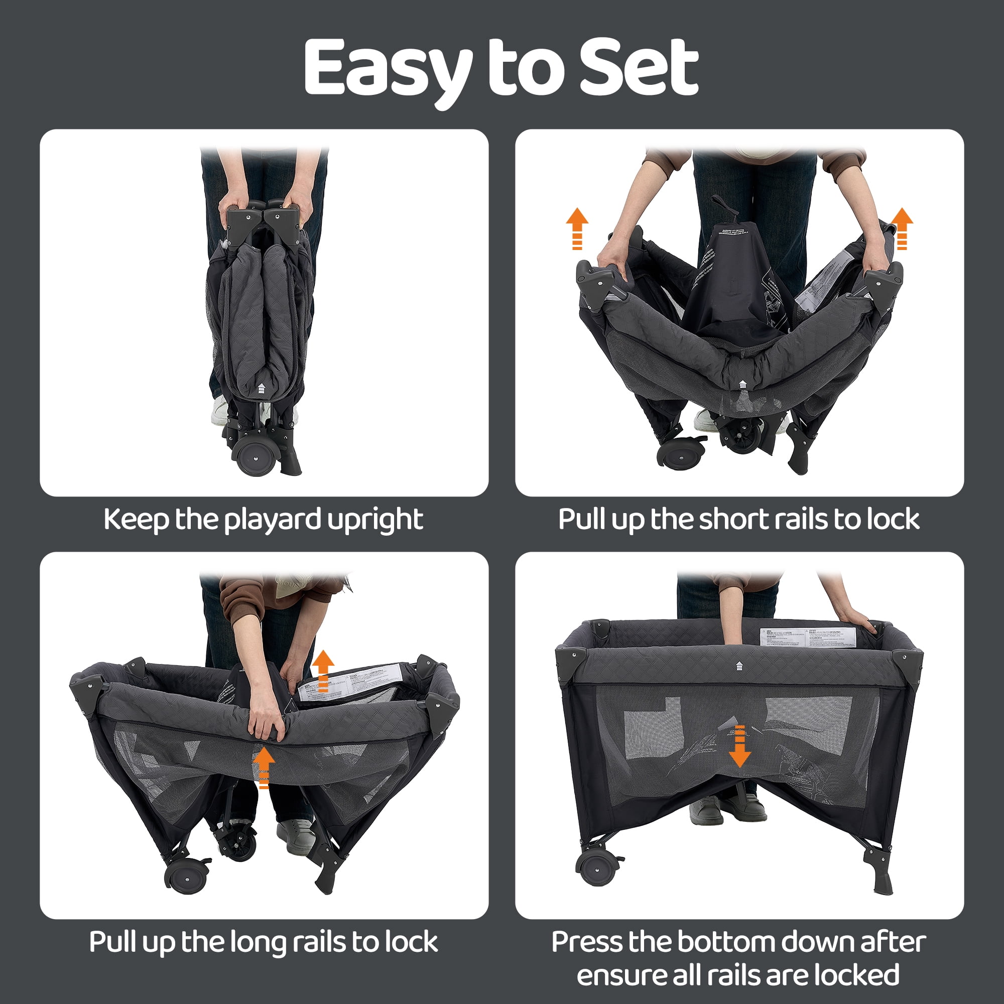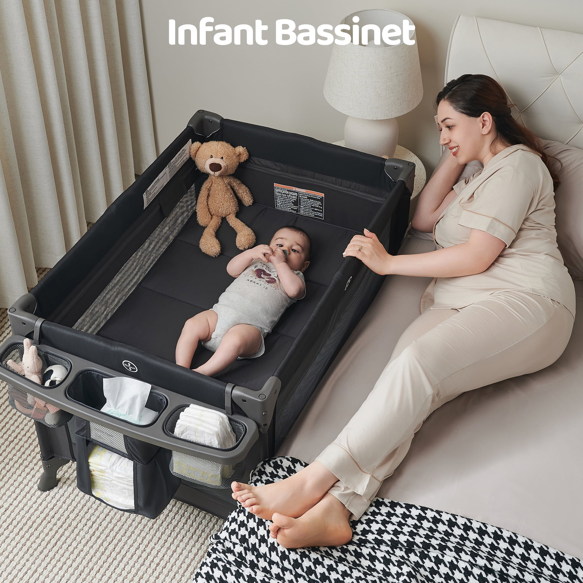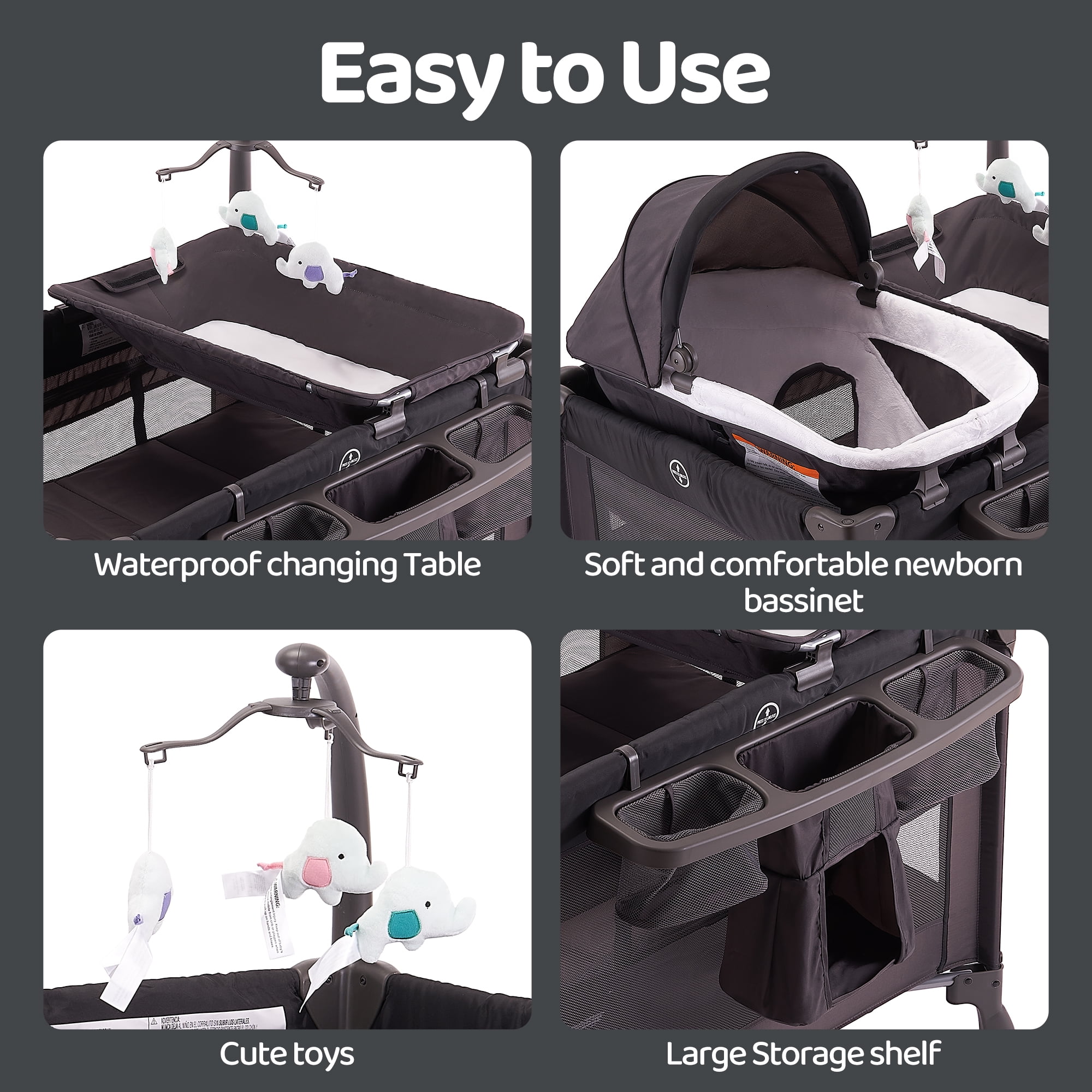 Removable full bassinet and napper with canopy , lots of storage pocket. Large caster wheels with brakes let you move the playard around the house with ease. Easy to put the playard together and fold it. And it’s a portable playard with carry bag. 3 hanging toys can attract the baby’s attention, not only promoting the baby’s visual development but also improving the grasping ability. 7-point supporting structure on the bottom comes with more steadiness. High quality metal pipe make the whole baby bed strong and durable, providing your baby with safe protection. The Pamo Babe Unisex Playard with an incline less than or equal to 7 from horizontal while in using.