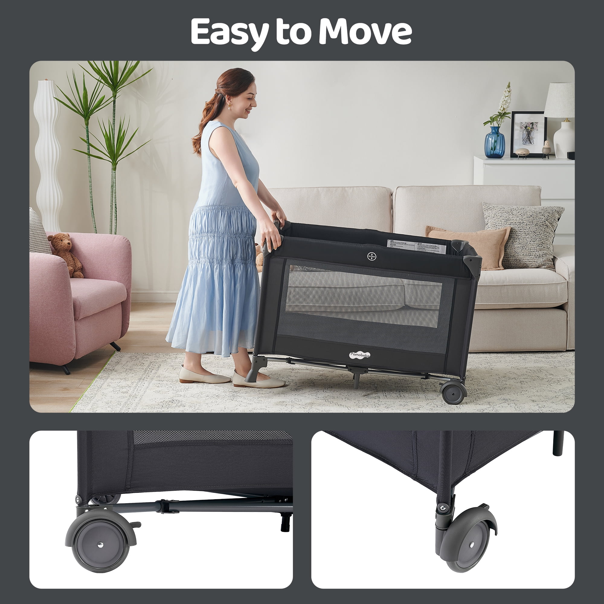 About Pamo Babe Pamo Babe is a professional manufacturing enterprise specializing in baby product design, research and development. About this playard The 4 Panels playard includes a removable full bassinet, sleep nest, changing table. Easy locking mechanism makes the playard stable and it can be moved from place to place with large wheels and secured with brakes. Also included is a convenient travel tote bag. The Newborn Unisex Playard with an incline less than or equal to 7ð from horizontal while in using. What’ s in the box: Playard Assembly X1 Baby Bassinet X1 Mattress for Playard X1 Changing Table X1 Sleep Nest Frame X1 Diaper Organizer X1 Carry Bag X1 Toys Bar X1 Toys X3 Specifications: Unfolded Dimensions:39.4*27.6*27.6 inch folded Dimensions:28*14*10.23 inch Mattress Dimensions: 36.2*24.5 inch Assembled Product Weight:31 Pounds Age/Weight Capacity: Birth to 3 Years Age group:Newborn