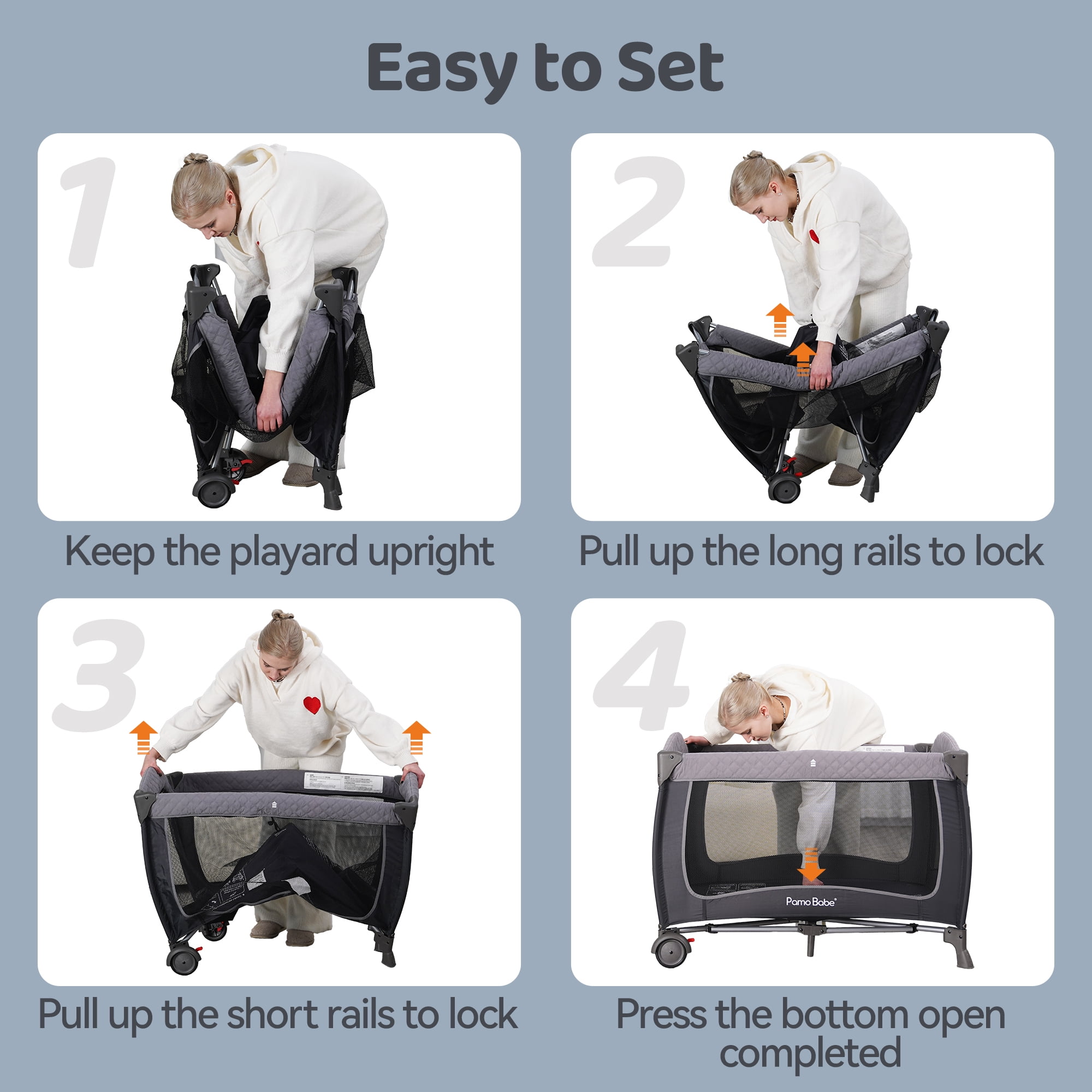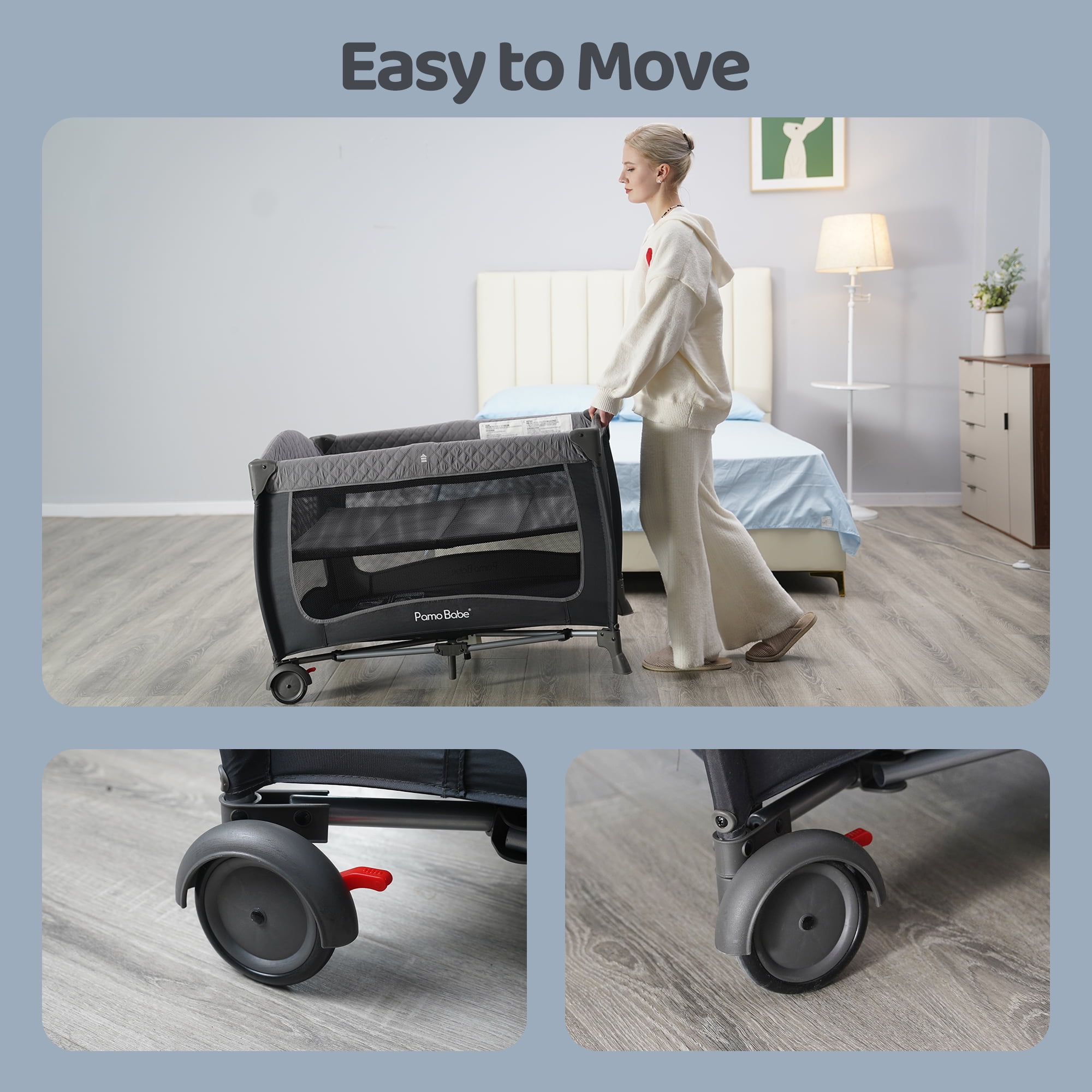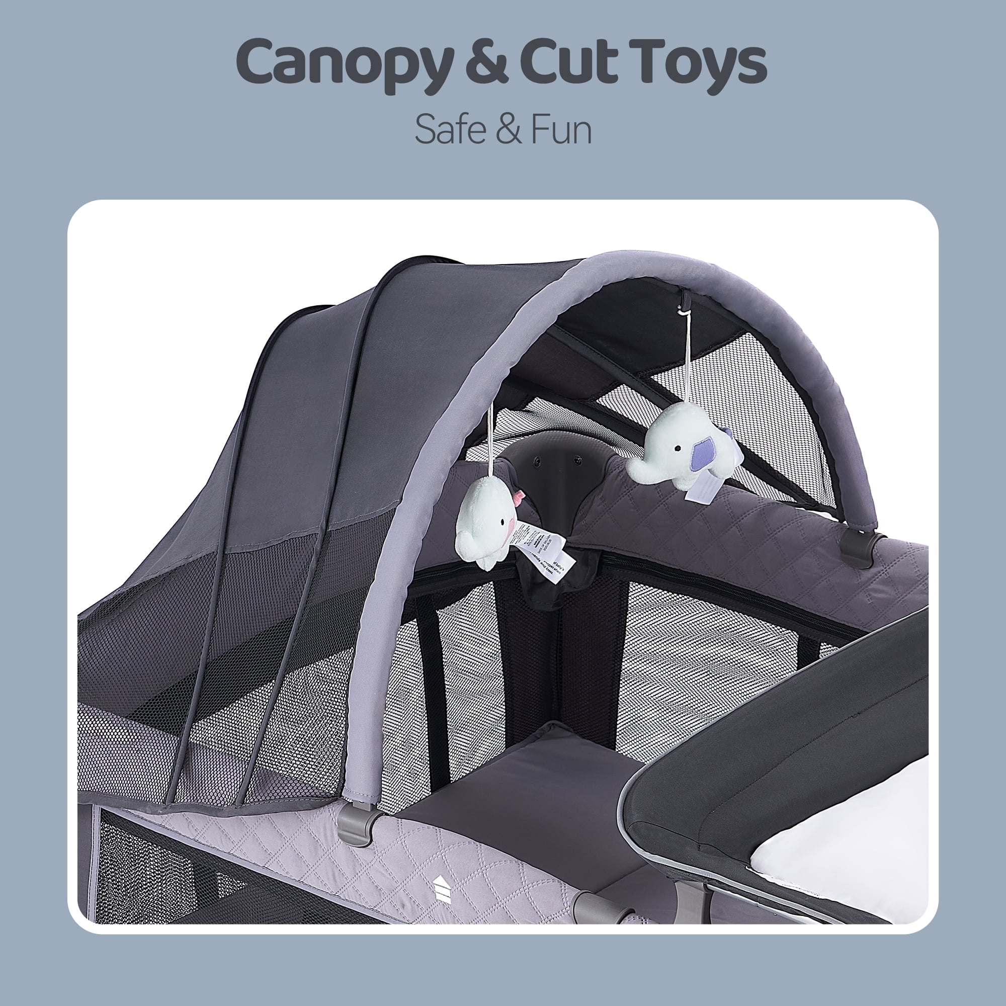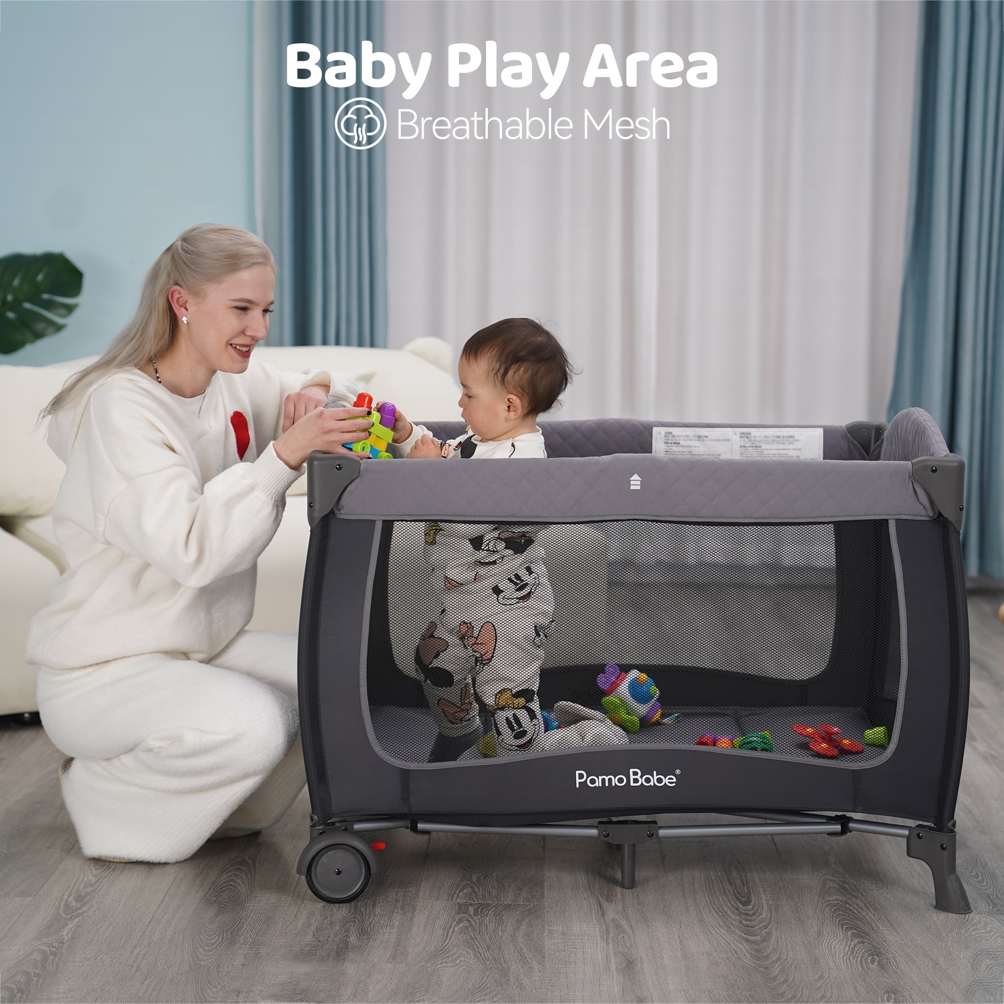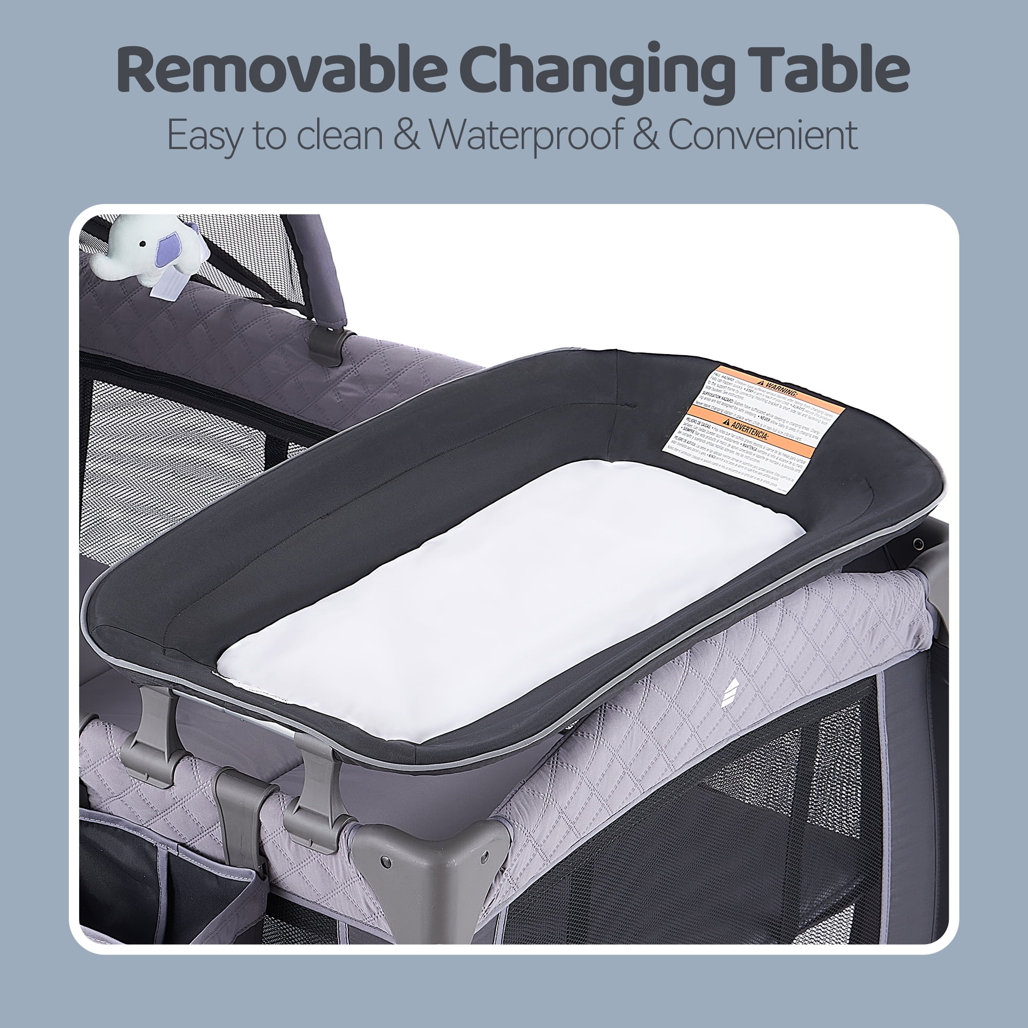 MULTI-PURPOSE PLAYARD–The design of the changing table allows the mother to easily change diapers, and the comfortable bassinet provides a place for the baby to rest. The storage bag will provide you everything when you are ready to change diaper for your baby; CONVENIENT & DURABLE NURSERY CENTER–There are two wheels with brakes at the bottom of the baby playard so that it can move flexibly. This nursery center is composed of strong frame and thick fabric so that it can hold the baby weights up to 33lbs; DETACHABLE; FOLDABLE DESIGN–The changing table, storage bag, bassinet and canopy can be easily removed from the baby playard. And the playard can be quickly folded up without extra tools. The handbag helps you store the folded crib and take the crib out for travel.; DETACHABLE CANOPY with 2 TOYS– The detachable canopy can protect your child’s eyes from strong light. The two hanging toys can attract the baby’s attention, not only promoting the baby’s visual development but also improving the grasping ability; EASY TO ASSEMBLE Easy to put the playard together without any tools. The mesh design provides a better visibility for parents to observe the baby at any time. The wide space allows the baby to practice standing and playing after removing the bassinet. Safety Playard The Playard with an incline less than or equal to 7 degree from horizontal while in using.