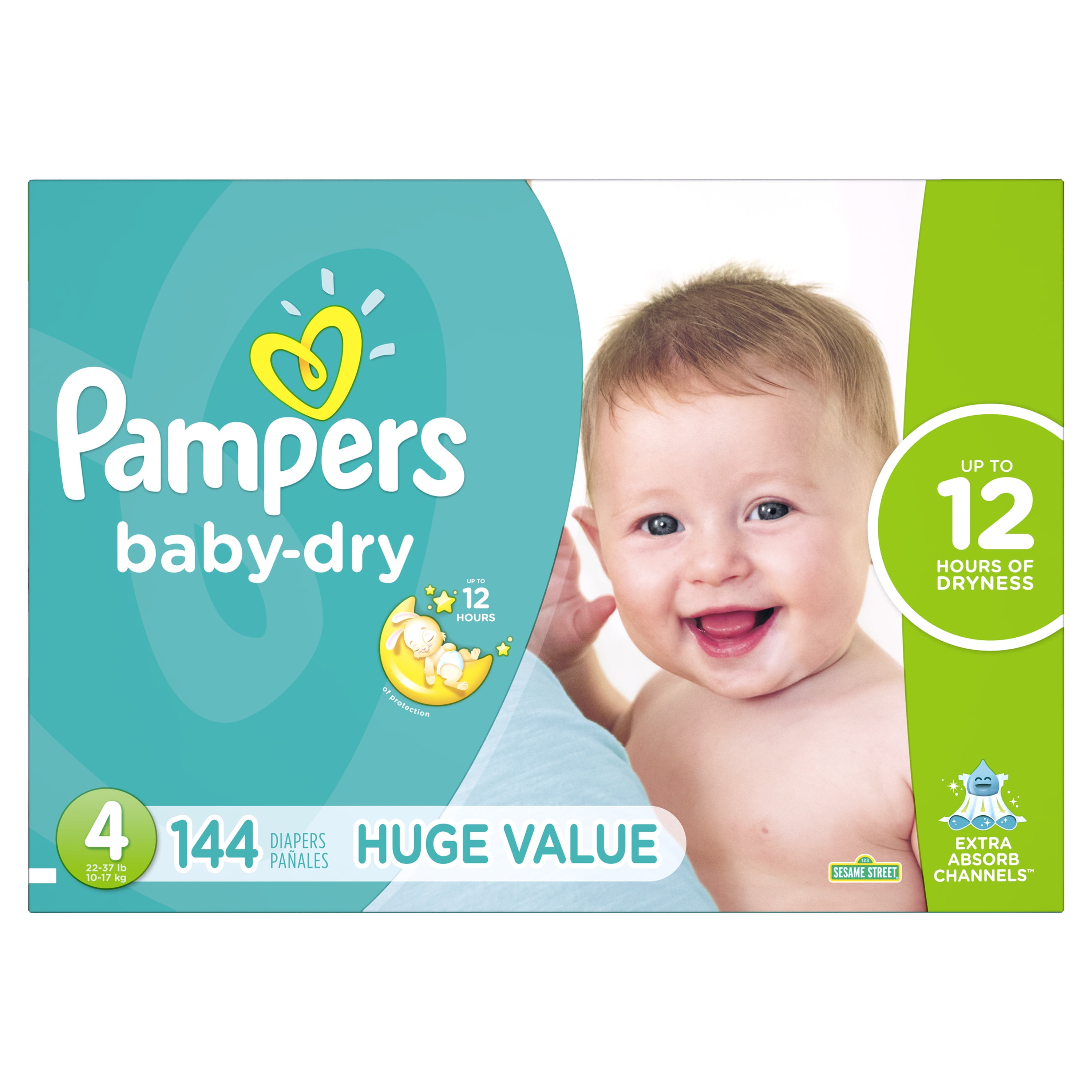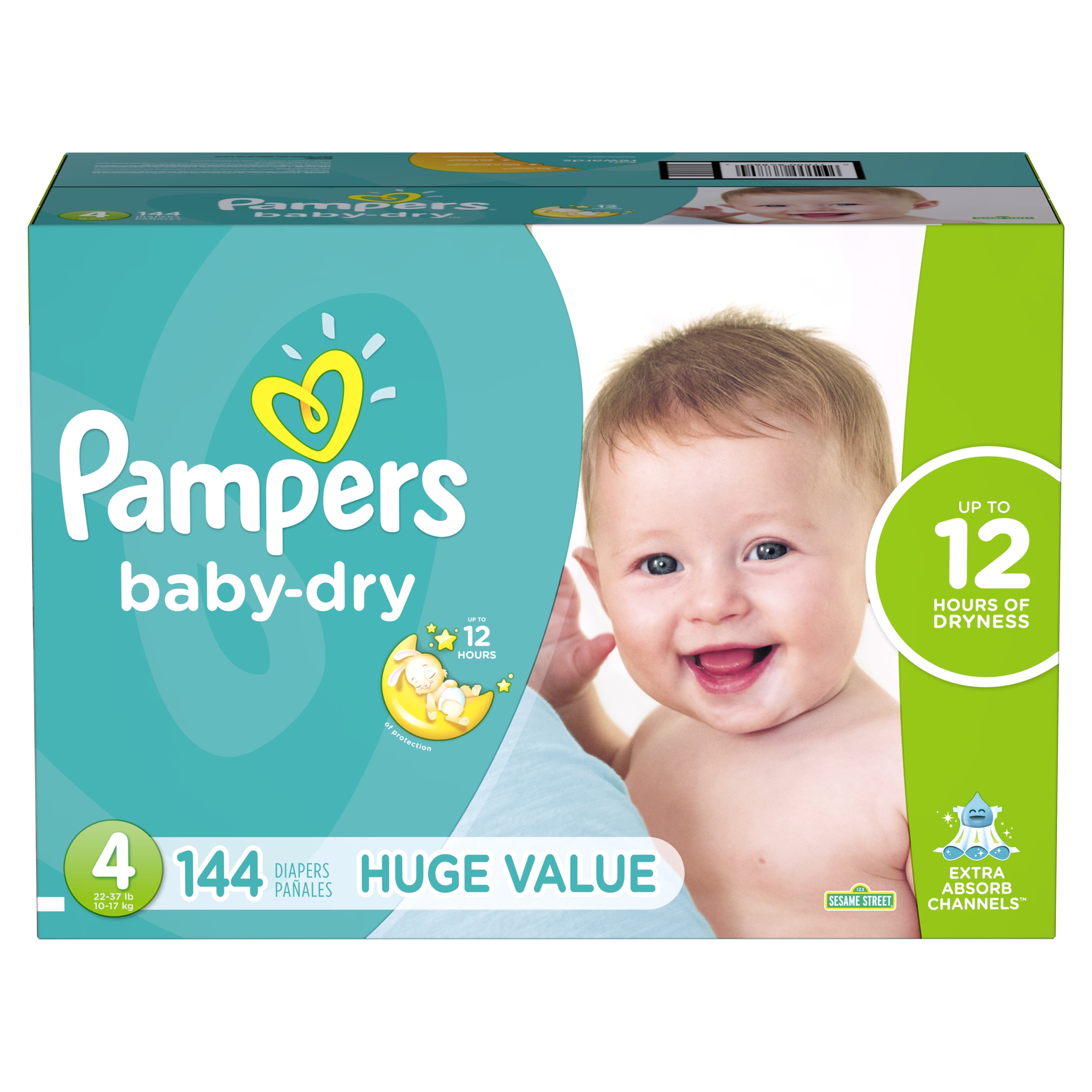 Pampers Baby-Dry Diapers Size 4 144 Count: Up to 12 hours of overnight dryness Locks away wetness into 3 Extra Absorb Channels 3 layers of absorbency pull liquid away and keep your baby dry 3x drier* for all-night sleep protection *Based on size 4 vs. the leading value brand. Average of 0.19 grams less after 3 typical wettings over 15 min. All-around stretchy sides for a comfortable fit Wetness Indicator shows when your baby might need a change (available on sizes N, 1, and 2) Soft like cotton Breathable layers keep your baby dry and happy