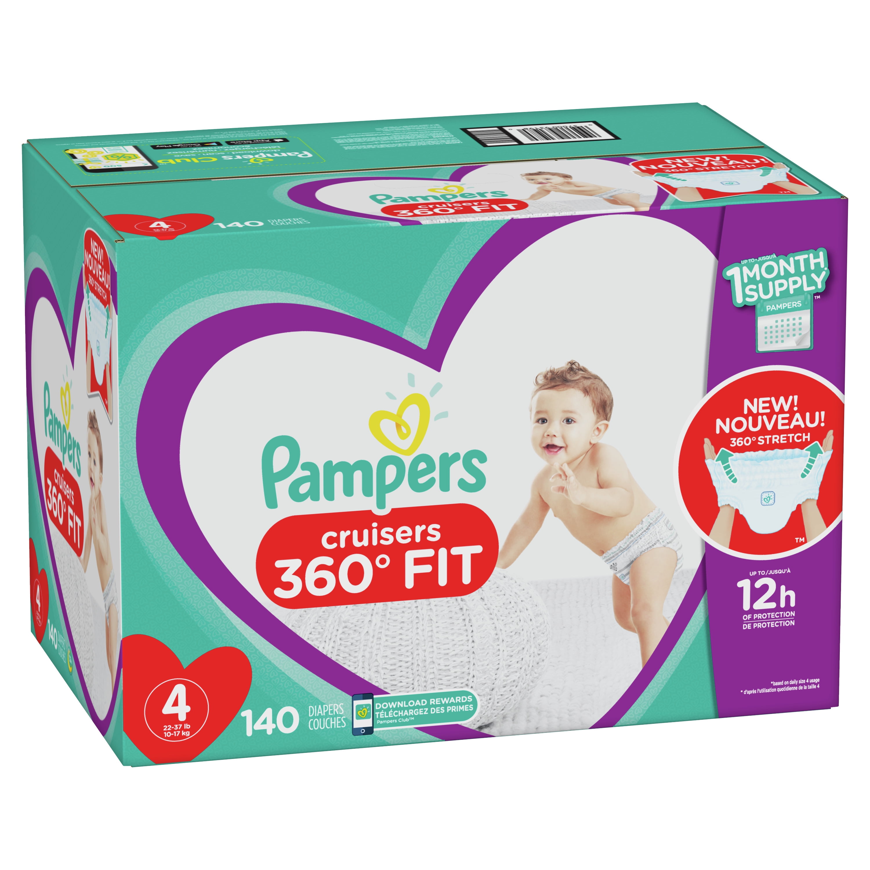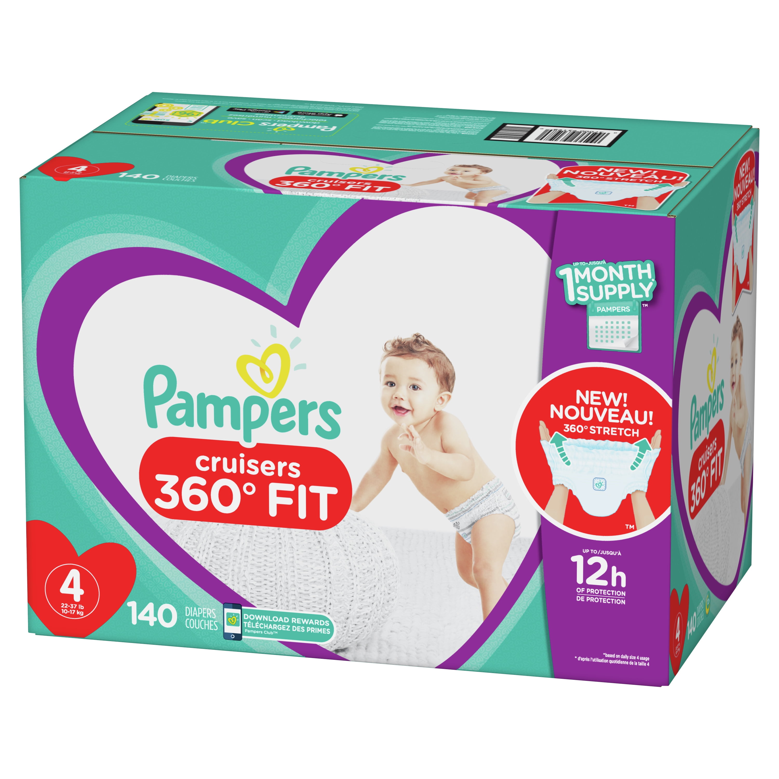 Pampers Cruisers 360 Fit Diapers, Active Comfort, Size 4, 140 Ct: Pampers Cruisers 360˚ FIT is our best fitting diaper for your active baby 360º STRETCHY WAISTBAND adapts to every move for a comfortable fit that keeps up with your active baby Easy to pull on and remove with EASY-TEAR SIDES and ROLL & TOSS TAPE. Simply tear the sides, roll the diaper up and secure with disposal tape on back SUPER SOFT like cotton to help protect your baby’s delicate skin, even during active play LOCKAWAY CHANNELS absorb wetness and lock it away from skin for breathable dryness DUAL LEAK-GUARD BARRIERS gently seal around baby’s legs to protect where leaks happen most Packaging may vary