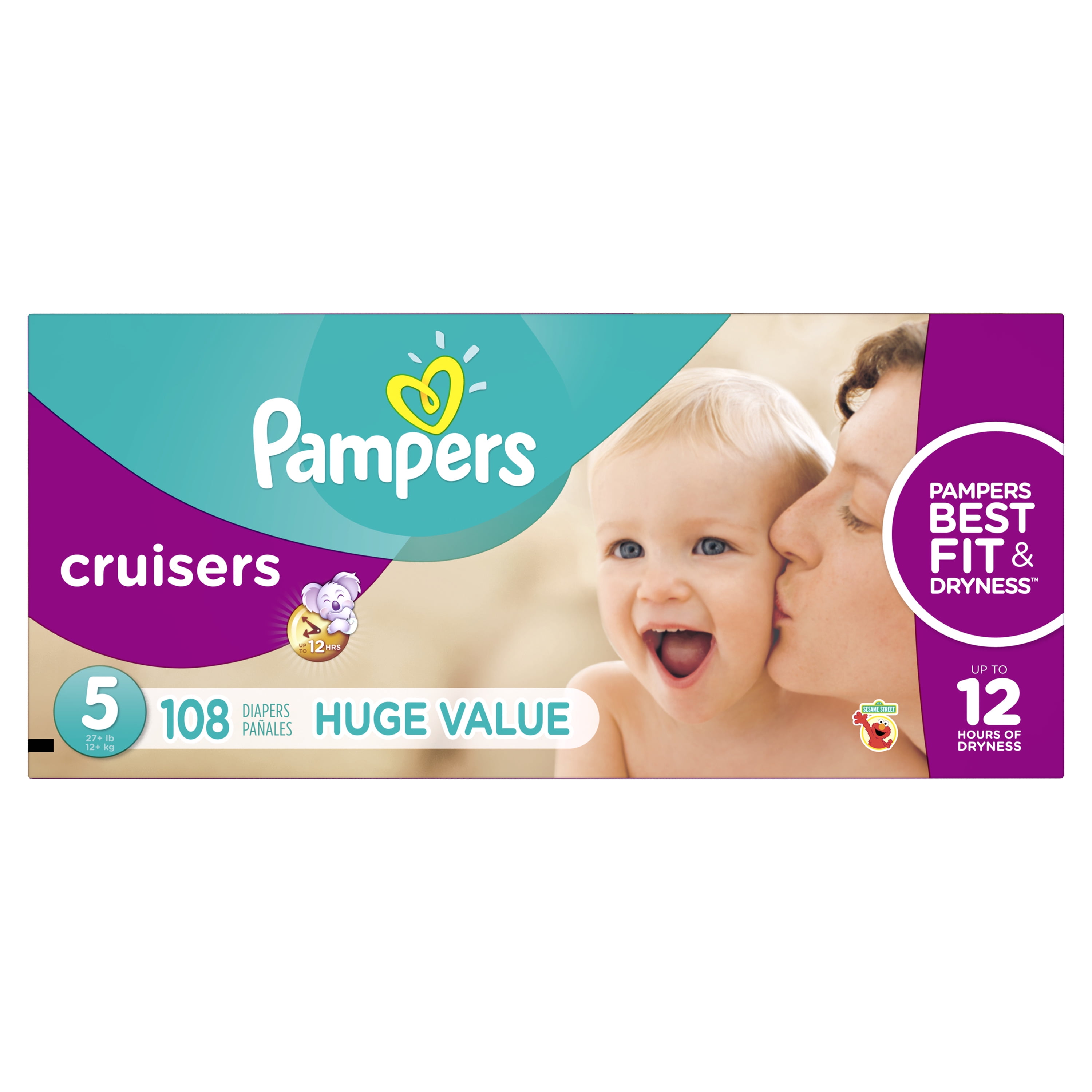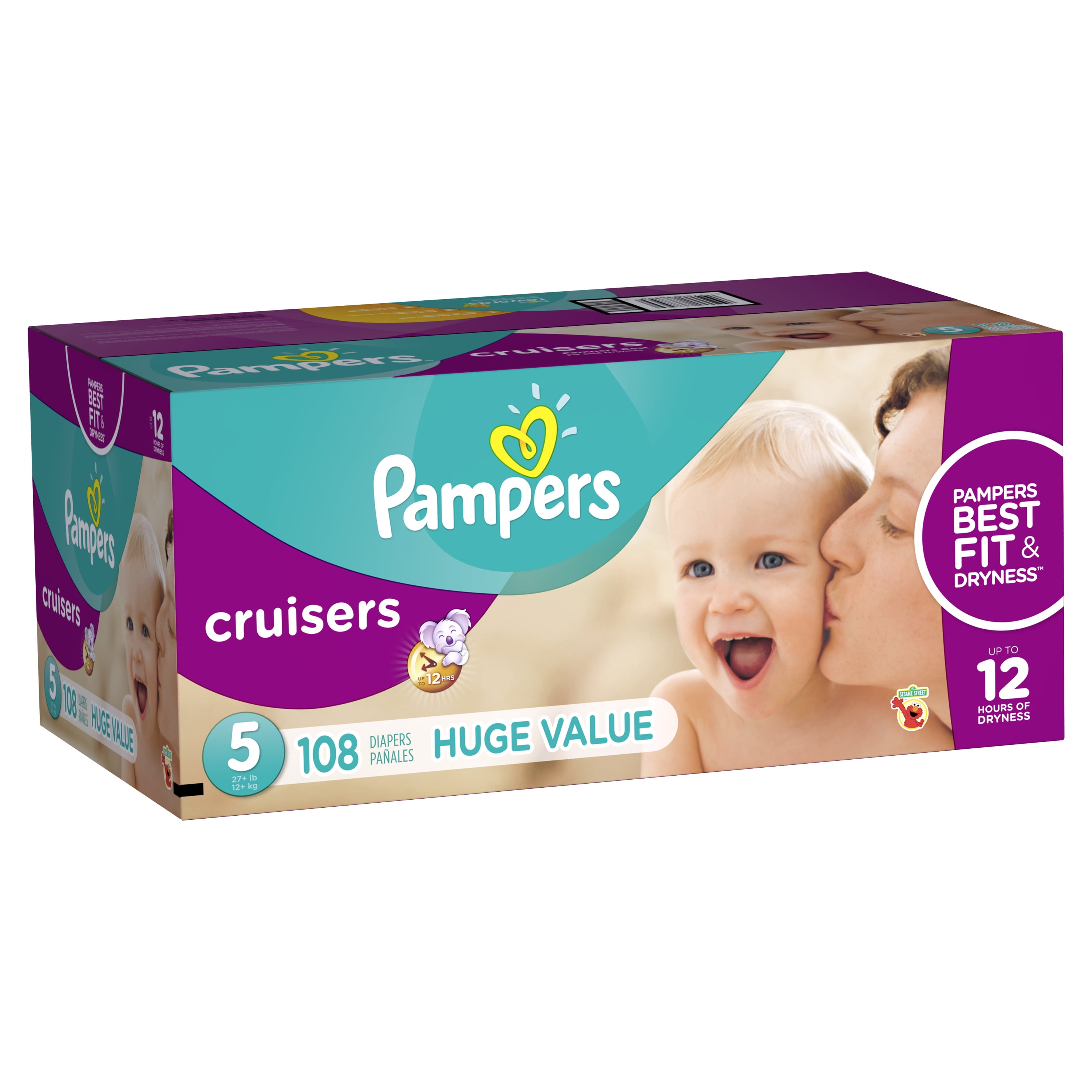 Pampers Cruisers Diapers Size 5, 108-Count: Extra Absorb Channels help distribute wetness evenly Doesn’t sag like ordinary diapers (based on size 4 vs. a leading value brand) Pampers best fit and dryness Pampers Cruisers diapers provide up to 12 hours of protection Unique 3-way fit adapts at the waist, legs and bottom so babies have the freedom to play their way Available sizes: 3, 4, 5, 6 and 7 Pampers size 5 108-pack have Wetness Indicator to let parent know when it’s time for diaper change Features fun Sesame Street designs Made of petrolatum, stearyl alcohol, aloe barbadensis leaf extract to be easy and gentle on baby’s skin Also available in Swaddlers (sold separately)