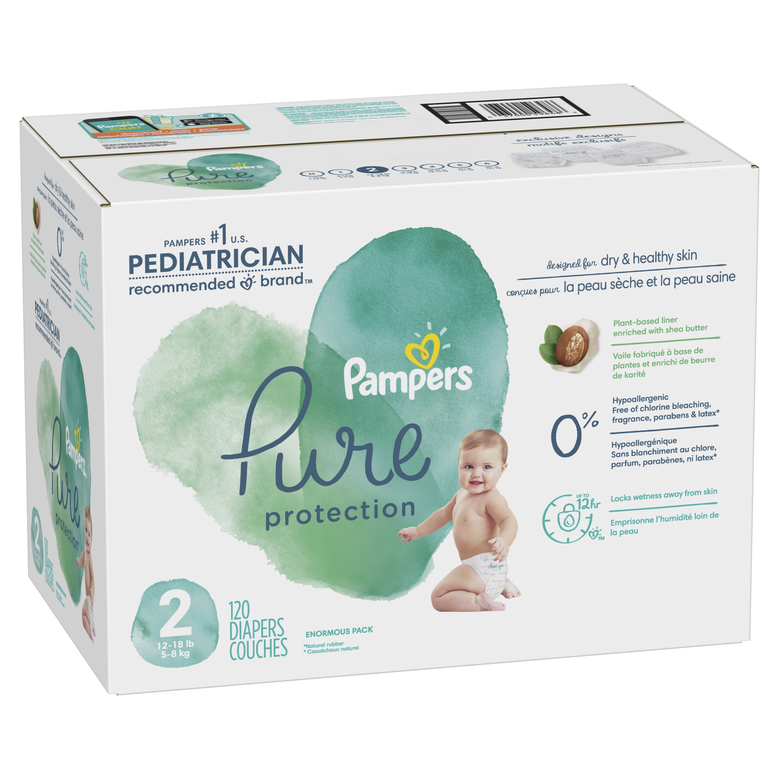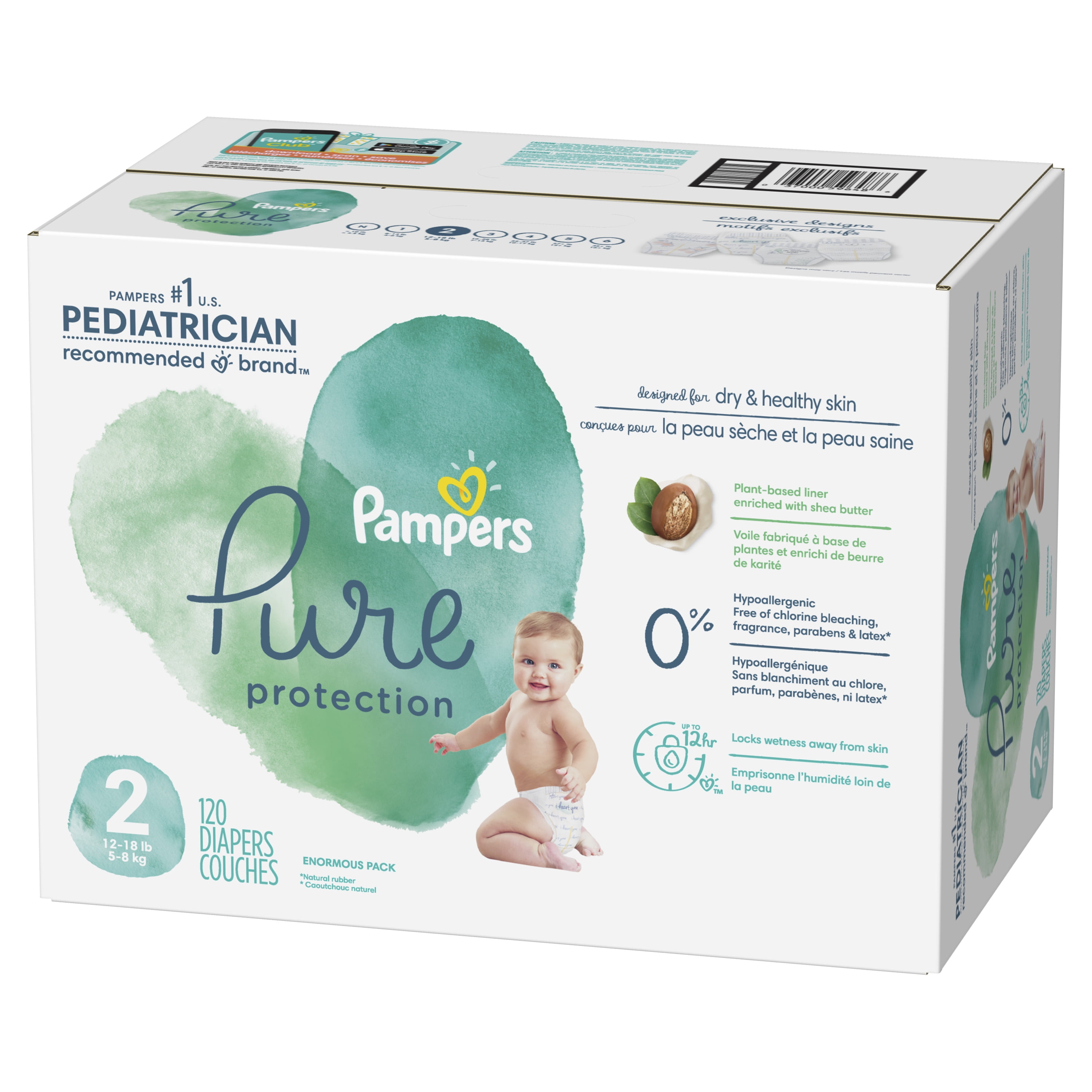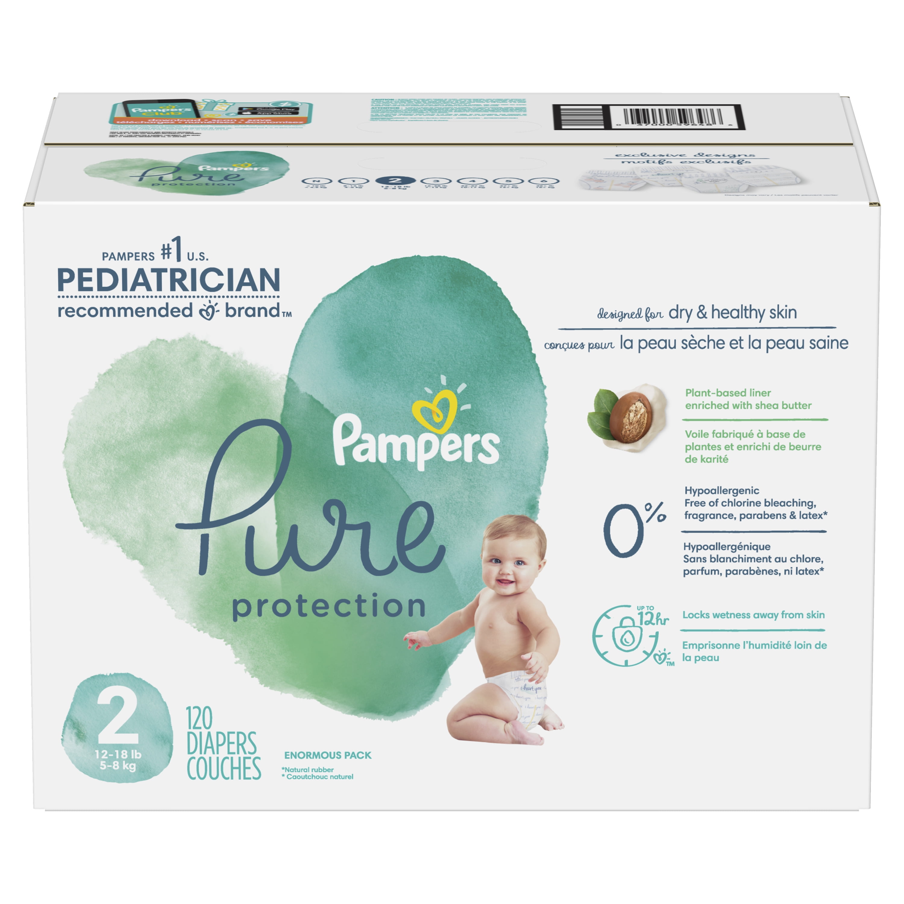 Pampers Pure Protection Diapers Size 2 120 Count: Pampers Pure Protection diapers are crafted with thoughtfully chosen materials for dry and healthy skin Absorbent plant-based liner. Plant-based and polypropylene fiber, enriched with shea butter to protect skin Hypoallergenic and free of chlorine bleaching, fragrance, parabens, and latex* (*Natural rubber) Locks away wetness from skin up to 12 hours Designer prints that make Pampers Pure the complete package of style and protection Made with premium cotton for a soft outercover and breathability Pampers reassuring Wetness Indicator lets you know when your baby might need a change Packaging and products may vary Buy 1 Pampers Pure, Get $10 Gift Card Get Offer ✕