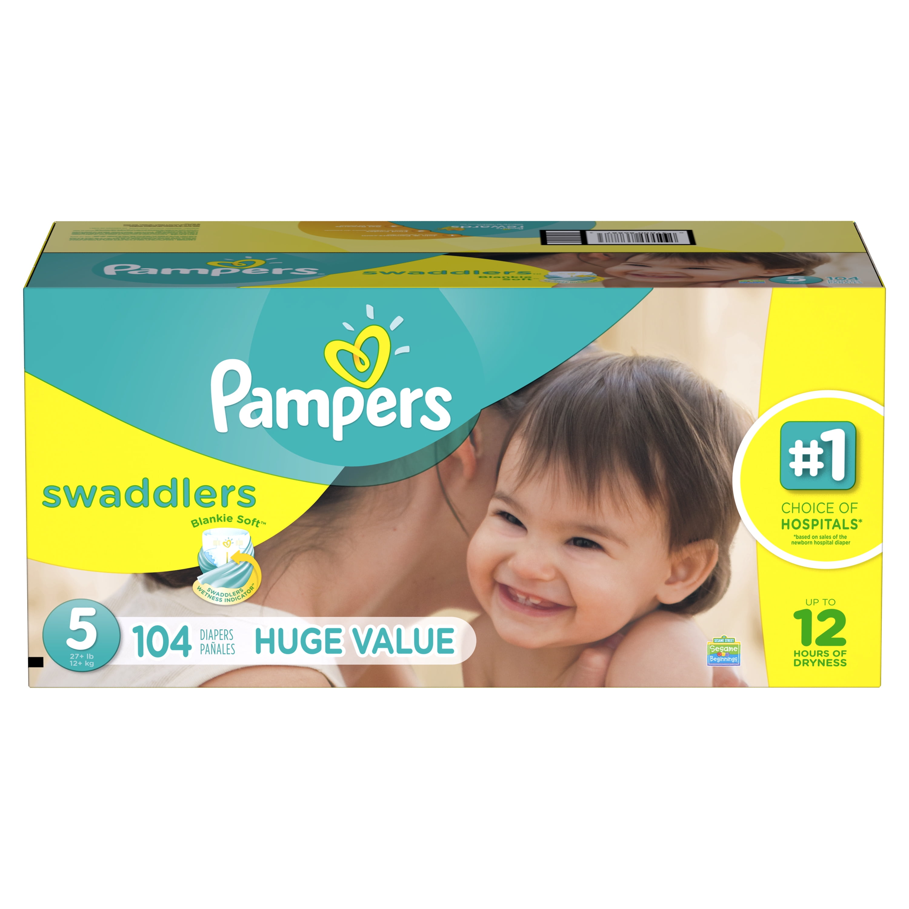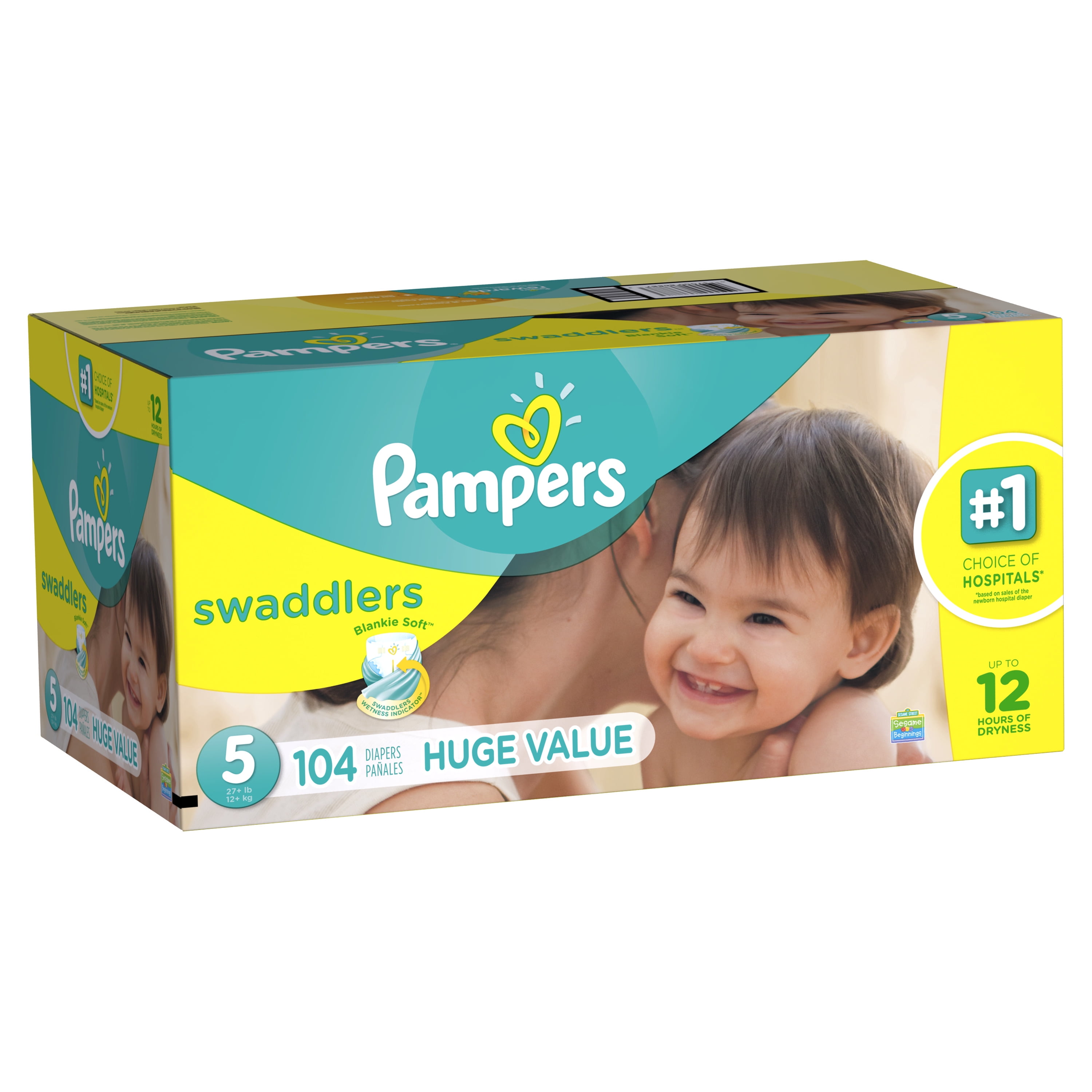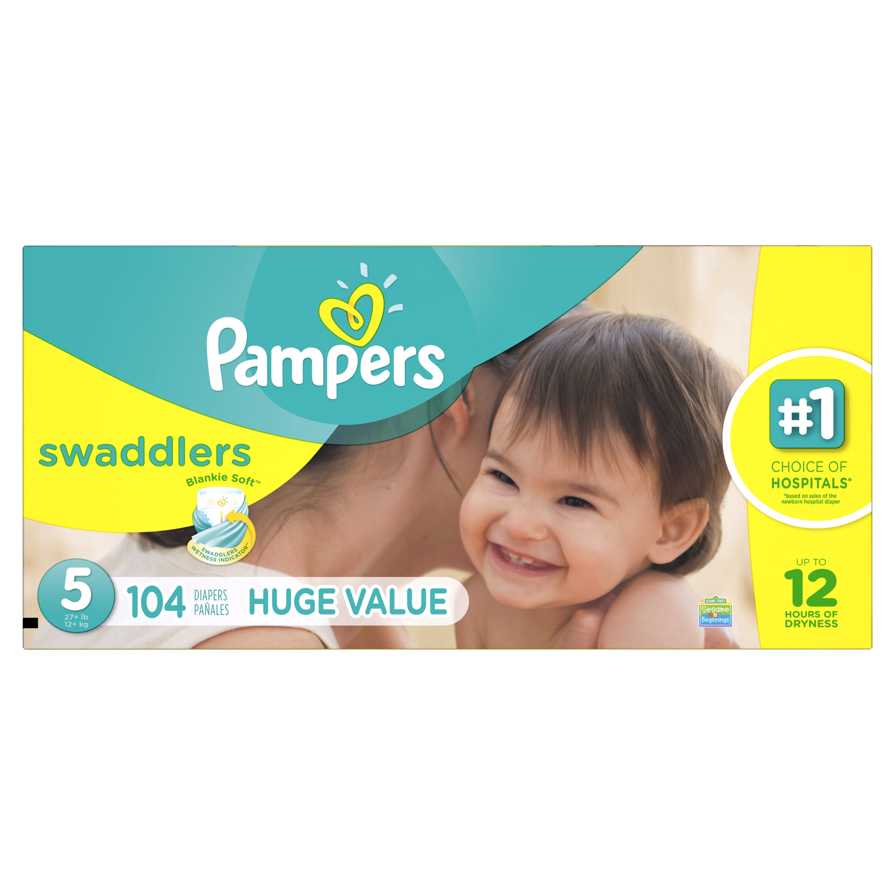 Pampers Swaddlers Diapers Size 5 104 count: Pampers Blankie Soft comfort and protection Pampers Swaddlers diapers are the #1 Choice of US Hospitals (based on sales of the newborn hospital diaper) Swaddlers wetness indicator tells you when your baby might need a change Our unique Absorb Away Liner pulls wetness and mess away from your baby’s skin Extra Absorb Channels to help distribute wetness evenly for up to 12 hours of protection Soft, stretchy sides to flex with your baby’s every move