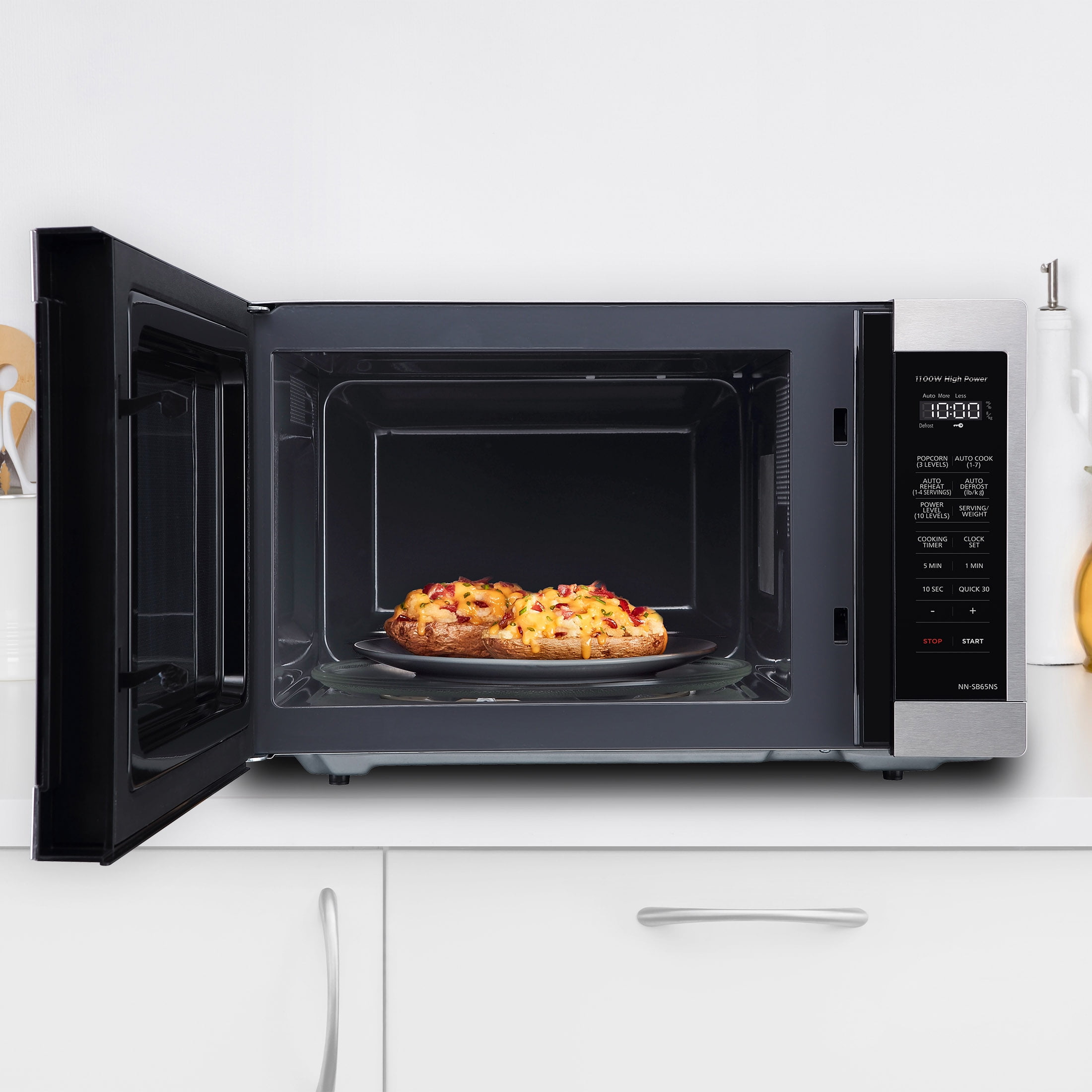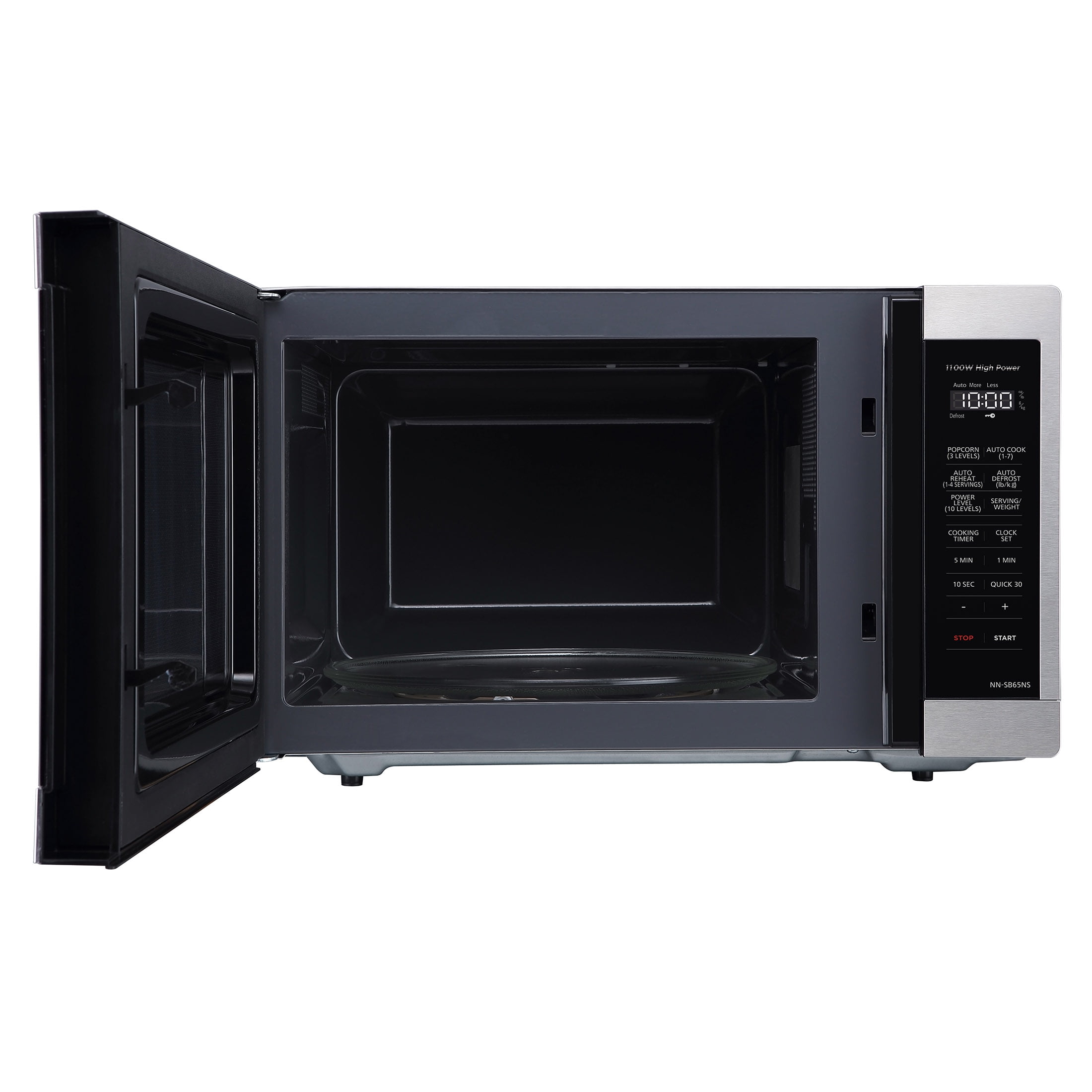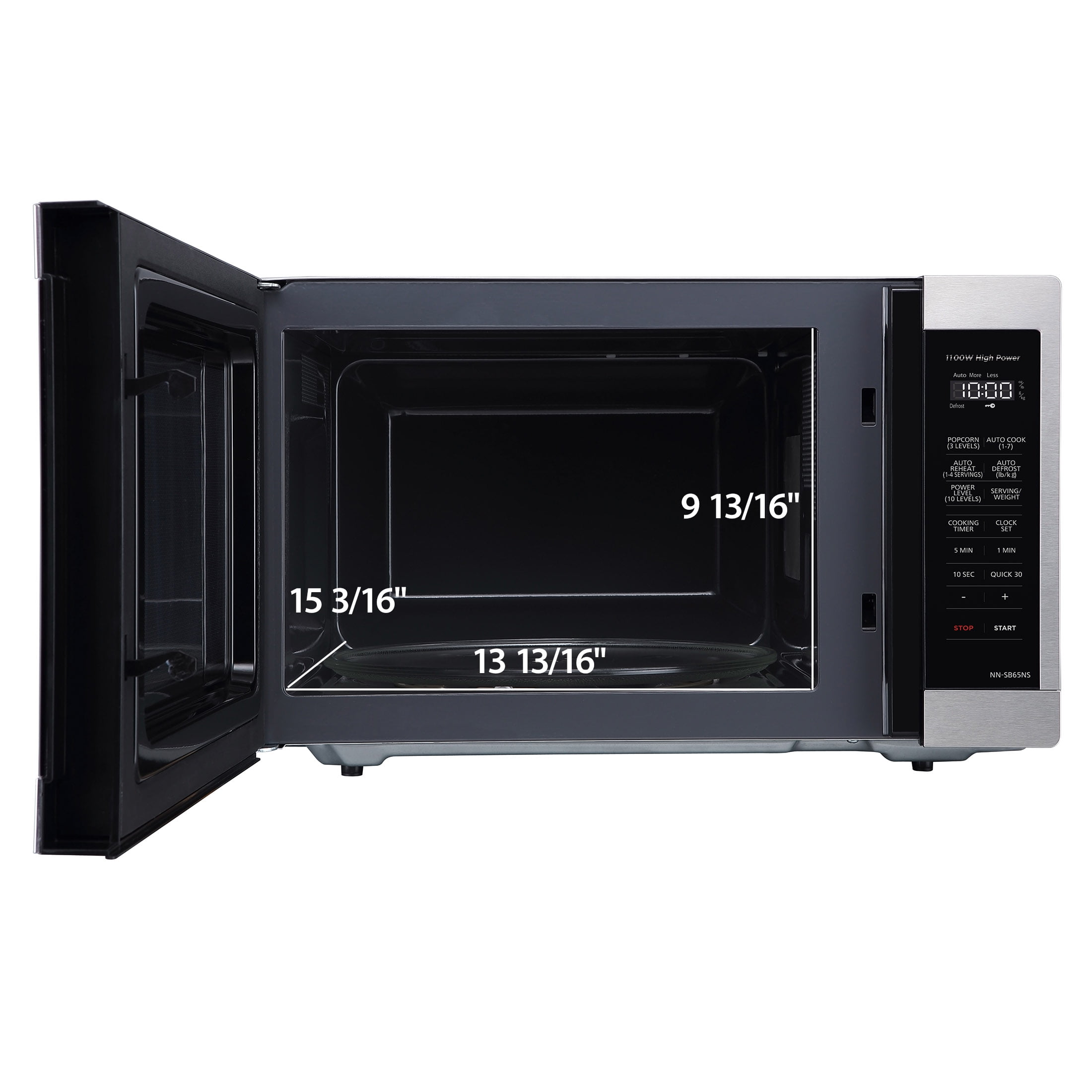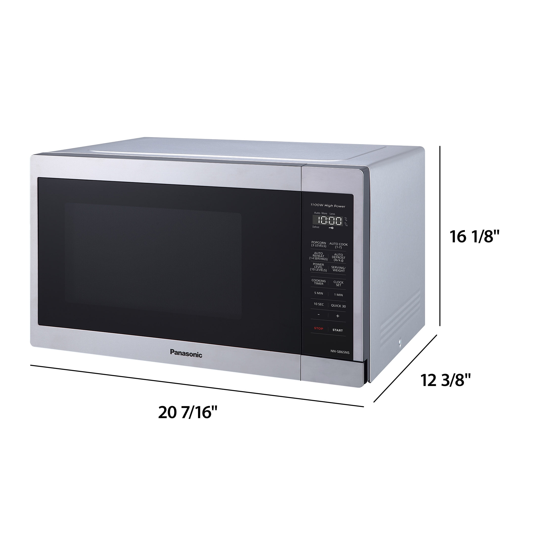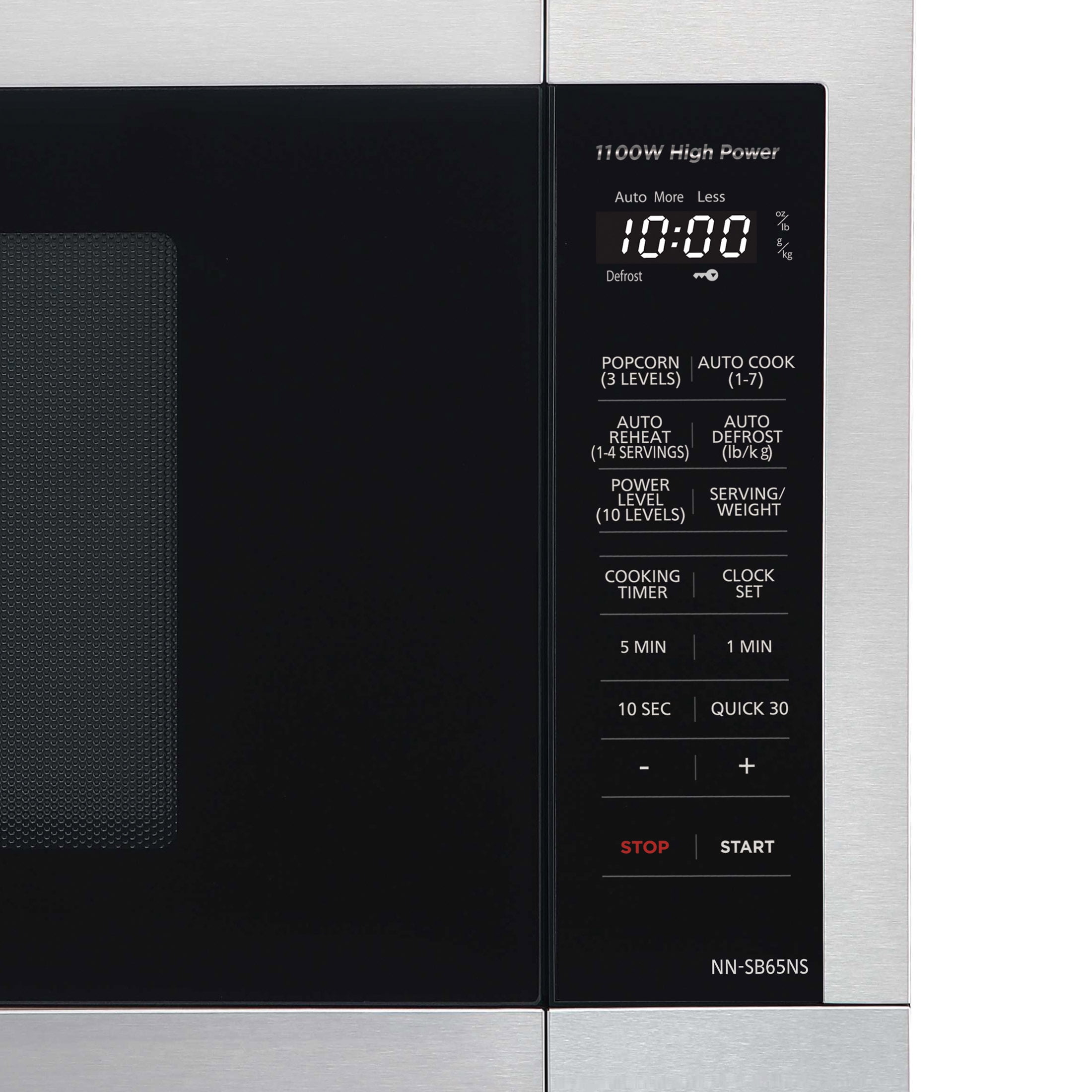 Smart Touch Controls – A exclusive, the Panasonic NN-SB65NS microwave features a streamlined, numberless control panel that includes auto reheat and defrost, delay start timer, 10 power levels and Auto Cook. Minimal Footprint – The microwave oven’s minimal exterior footprint helps maximize limited countertop space. 1100-Watt Cooking Power – Enjoy faster cooking times with 1100 Watts high power to cook flavorful foods while maintaining natural nutrients. Adaptable Glass Turntable – Dishwasher-safe 12-13/32-in. glass turntable accommodates a variety of dish and plate sizes, including a moderate-size casserole dish. Easy Clean Interior – Improved 1.3 cu. ft. interior surface material enables quick, easy oven cleanup. Turbo Defrost – A dedicated sensor makes quick, even thawing easier with no frozen centers or overheated edges. 3-Level Popcorn Button – Select the optimal popping temperature and time for different microwave bag capacities (3.2, 2.7, or 1.5 oz.). 30-Second Heating – A quick 30-second timer lets you set cooking and reheating times in convenient 30-sec. intervals, or add a half-minute or two when needed.
