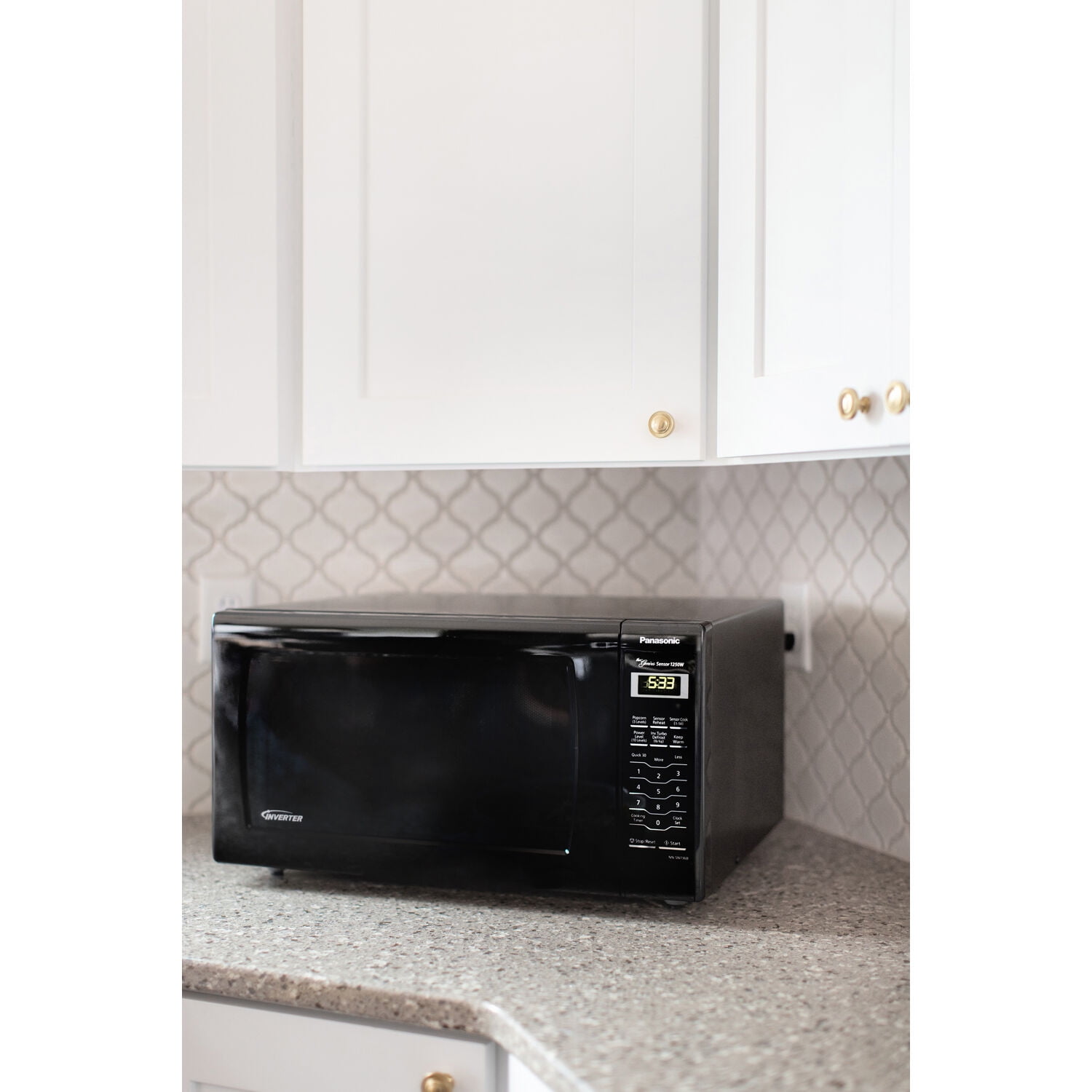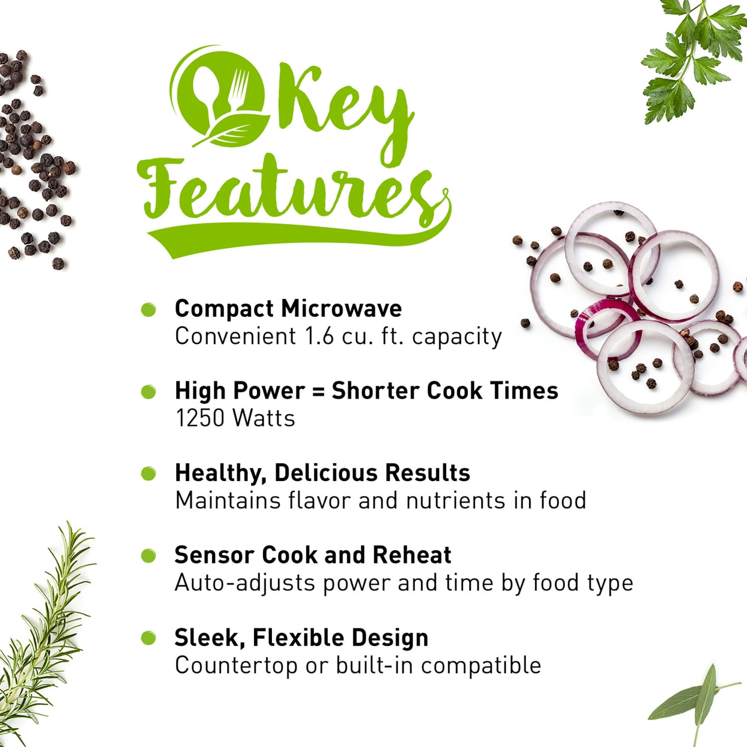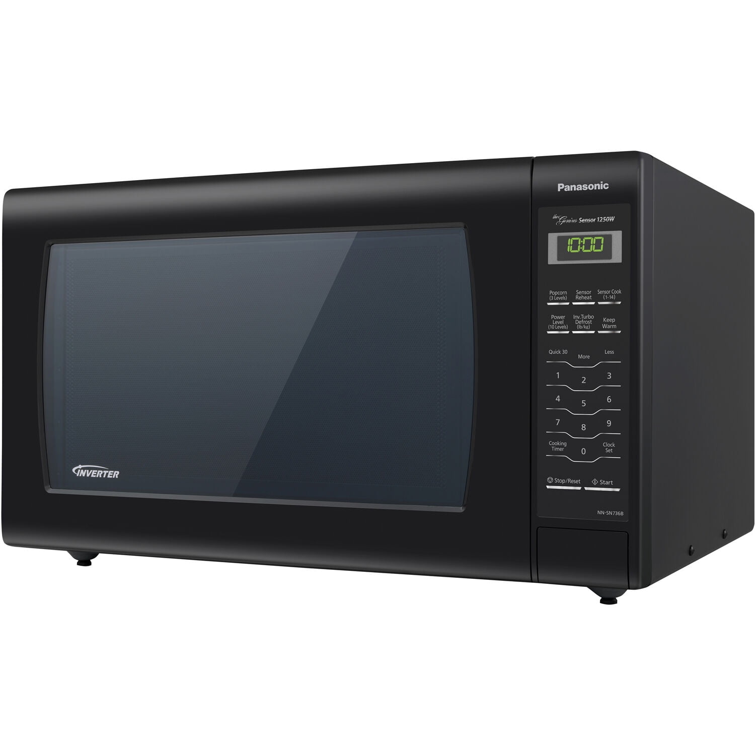 Full-size 1.6 cu. ft. capacity microwave oven for countertop 1250 watts of cooking power with 10 power levels Removable 15-inch glass revolving turntable Full-tactile membrane plus button control panel with green 4-digit display Push open door release Inverter technology delivers a seamless stream of power for precision cooking Inverter turbo defrost for fast, even defrosting Genius one-touch sensor cook and reheat eliminates guesswork 14 preset auto-cook/sensor cook menu items Multi-stage cooking up to 3 stages Programmable features include Popcorn, Keep Warm and Delay Start Clock, kitchen timer, standing time, Quick :30, and more/less Child lock feature Complies with 2016 DOE Energy Conservation Standards