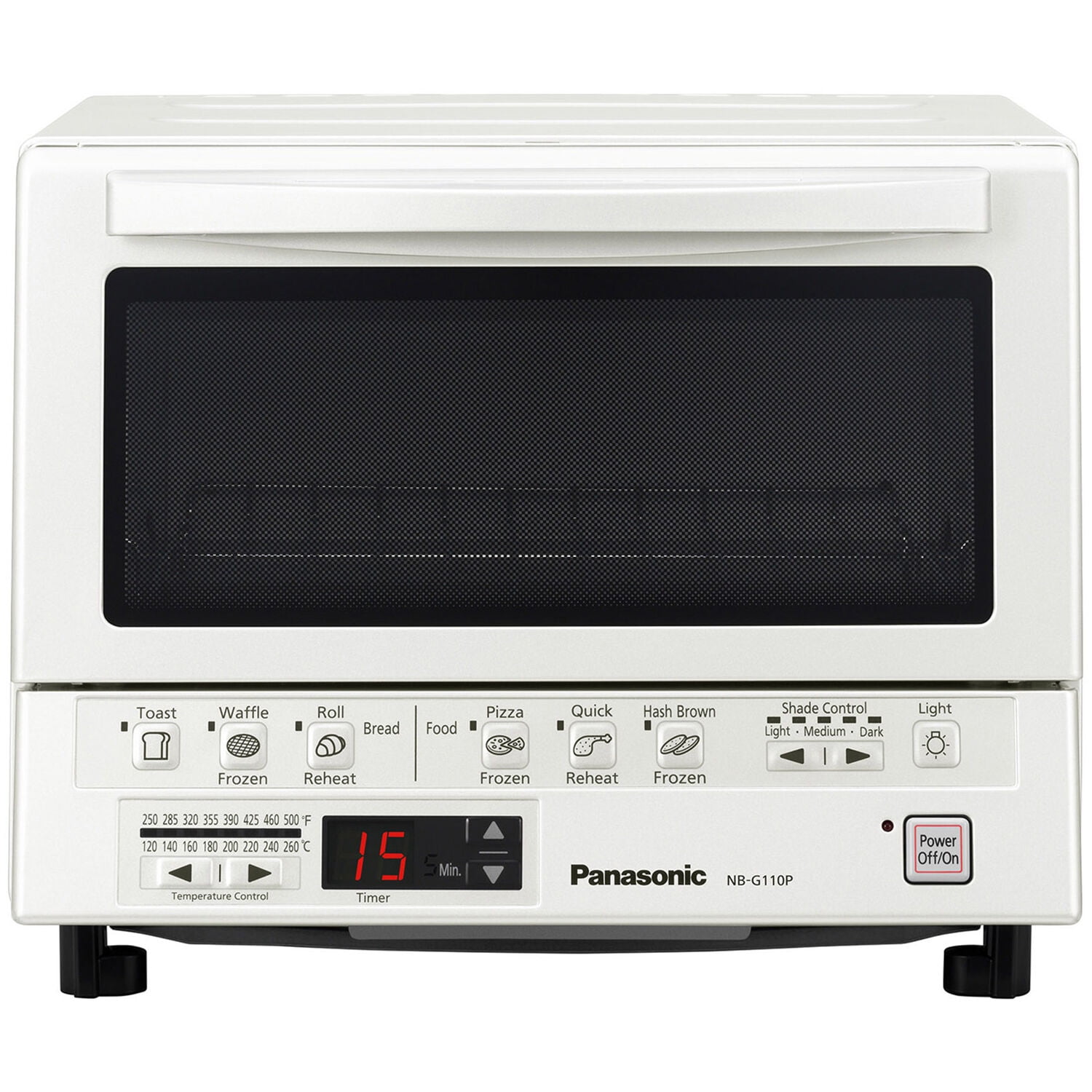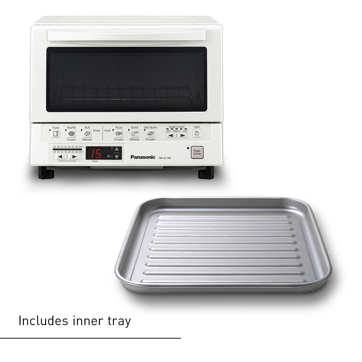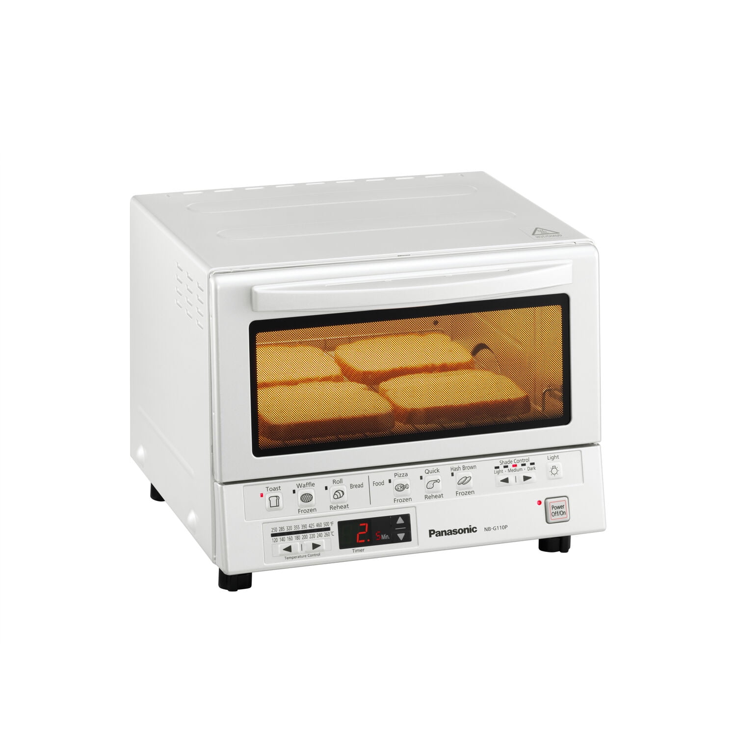 Panasonic FlashXpress compact toaster oven technology featuring double infrared ray heater for cooking up to 40% faster than conventional toaster ovens, instant heat eliminates preheating, 6 cooking menus with illustrated preset buttons, automatically calculates the cooking time for a variety of foods: bread (toast, waffles, bagels), frozen food (pizza, hash browns) and reheat (rolls, breads, leftovers), digital Timer (up to 25 minutes and temperature settings (250 Degree F to 500 Degree F), square shaped inner tray which is perfect for pizza up to 9-Inch in diameter of 4 slices of bread, removable crumb tray for easy cleaning, reminder beep lets you know when food is done, interior light allows you to view your food while cooking, internally measures 4.1-inch (H) by 10.2-inch (W) by 9.8-Inch (D), 7. 5-Pound, white fire hazard safety warnings do not place any of these materials or foods in this toaster oven, as they can ignite and cause a fire: paper, plastic, cardboard, taco shells, tostada shells, tortilla chips, buttered bread or bread with jam. Raw fish or meat should always be wrapped in foil. Do not put oil in the crumb tray, cook with a dirty crumb tray or cook without the crumb tray in place. Never leave the toaster oven unattended when in use. If food begins to smoke or catch fire, first turn off the oven’s power button then disconnect the power Plug. Do not open the oven door until the flame recedes. Always read and follow cooking instructions on all food packaging. The FlashXpress G110P compact toaster oven externally measures 10.2-inch (H) x 13-inch (W) x 12-inch (D). Disclamier: Before using this toaster oven appliance, move it 10 to 15cm (4 to 6 inches) away from wall or any object on the countertop. Remove any object that may have been placed on top of the toaster oven appliance. Do not use on surfaces where heat may cause a problem.