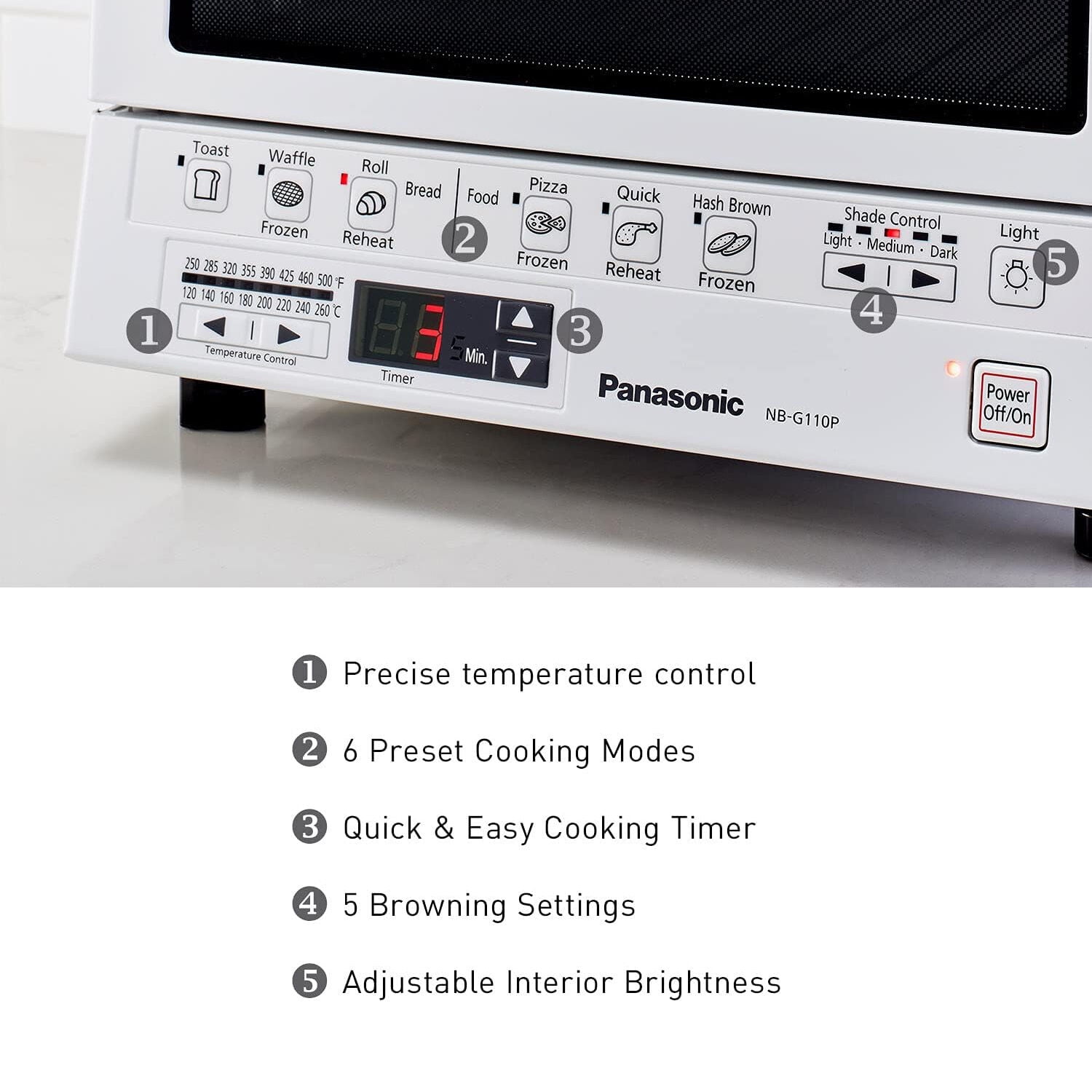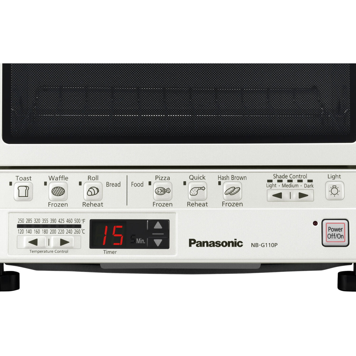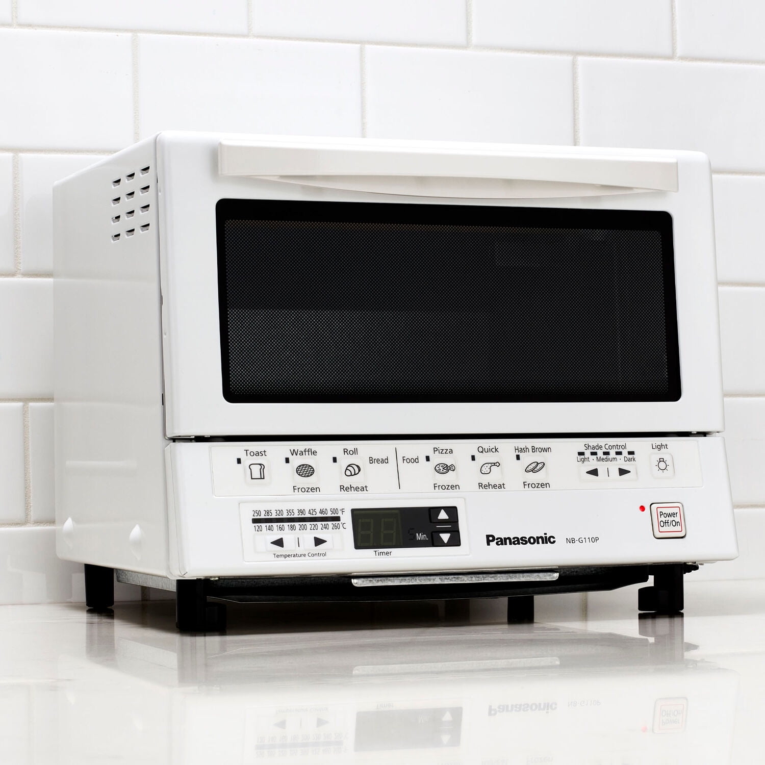 Panasonic FlashXpress compact toaster oven technology featuring double infrared ray heater for cooking up to 40% faster than conventional toaster ovens, instant heat eliminates preheating, 6 cooking menus with illustrated preset buttons, automatically calculates the cooking time for a variety of foods: bread (toast, waffles, bagels), frozen food (pizza, hash browns) and reheat (rolls, breads, leftovers), digital Timer (up to 25 minutes and temperature settings (250 Degree F to 500 Degree F), square shaped inner tray which is perfect for pizza up to 9-Inch in diameter of 4 slices of bread, removable crumb tray for easy cleaning, reminder beep lets you know when food is done, interior light allows you to view your food while cooking, internally measures 4.1-inch (H) by 10.2-inch (W) by 9.8-Inch (D), 7. 5-Pound, white fire hazard safety warnings do not place any of these materials or foods in this toaster oven, as they can ignite and cause a fire: paper, plastic, cardboard, taco shells, tostada shells, tortilla chips, buttered bread or bread with jam. Raw fish or meat should always be wrapped in foil. Do not put oil in the crumb tray, cook with a dirty crumb tray or cook without the crumb tray in place. Never leave the toaster oven unattended when in use. If food begins to smoke or catch fire, first turn off the oven’s power button then disconnect the power Plug. Do not open the oven door until the flame recedes. Always read and follow cooking instructions on all food packaging. The FlashXpress G110P compact toaster oven externally measures 10.2-inch (H) x 13-inch (W) x 12-inch (D). Disclamier: Before using this toaster oven appliance, move it 10 to 15cm (4 to 6 inches) away from wall or any object on the countertop. Remove any object that may have been placed on top of the toaster oven appliance. Do not use on surfaces where heat may cause a problem.