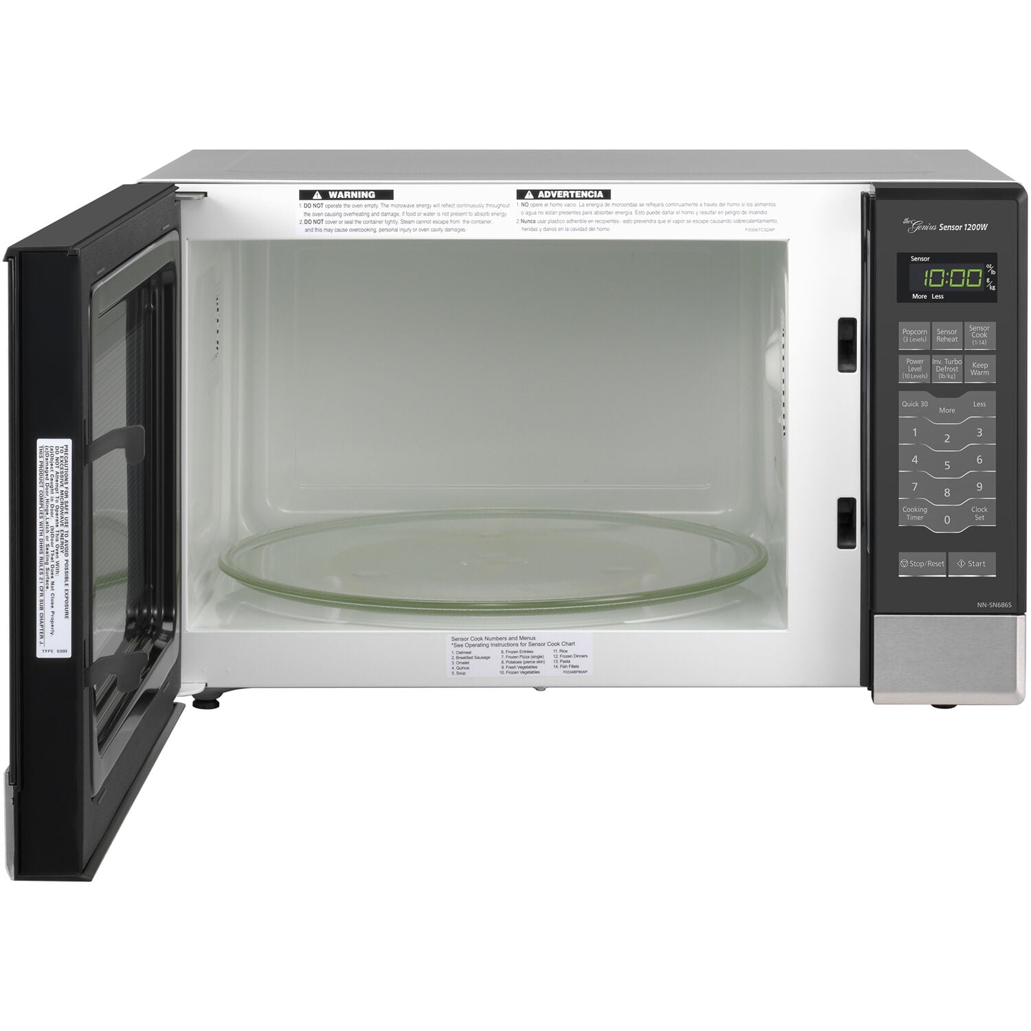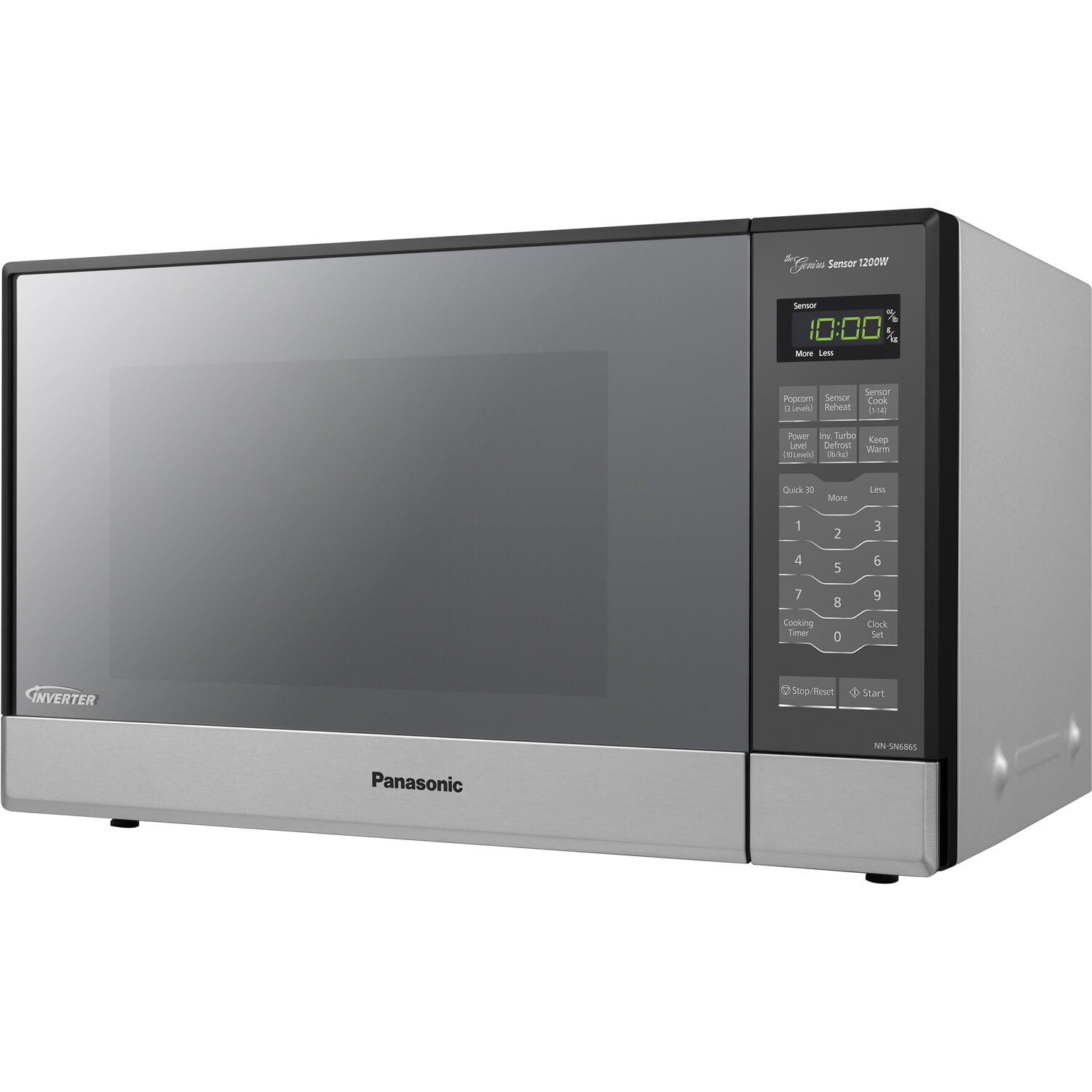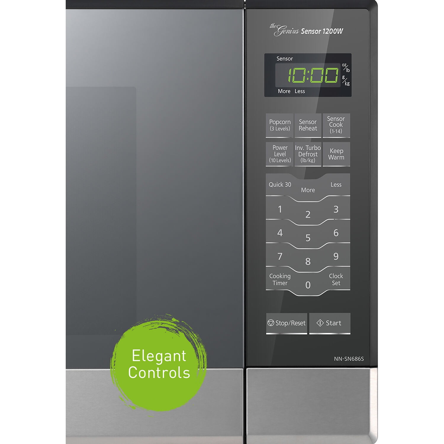Family-size 1.2 cu. ft. capacity microwave oven for countertop or built-in installation 1200 watts of cooking power with 10 power levels Removable 13.4-inch glass revolving turntable Emboss-look membrane control panel with green 4-digit display Stainless and half-mirror door with push open door release Inverter technology delivers a seamless stream of power for precision cooking Inverter turbo defrost for fast, even defrosting Genius one-touch sensor cook and reheat eliminates guesswork 14 preset auto-cook/sensor cook menu items Multi-stage cooking up to 3 stages Programmable features include Popcorn, Keep Warm and Delay Start Clock, kitchen timer, standing time, Quick :30, and more/less Child lock feature Optional trim kit sold separately Complies with 2016 DOE Energy Conservation Standards Color: Stainless Steel front with Silver body