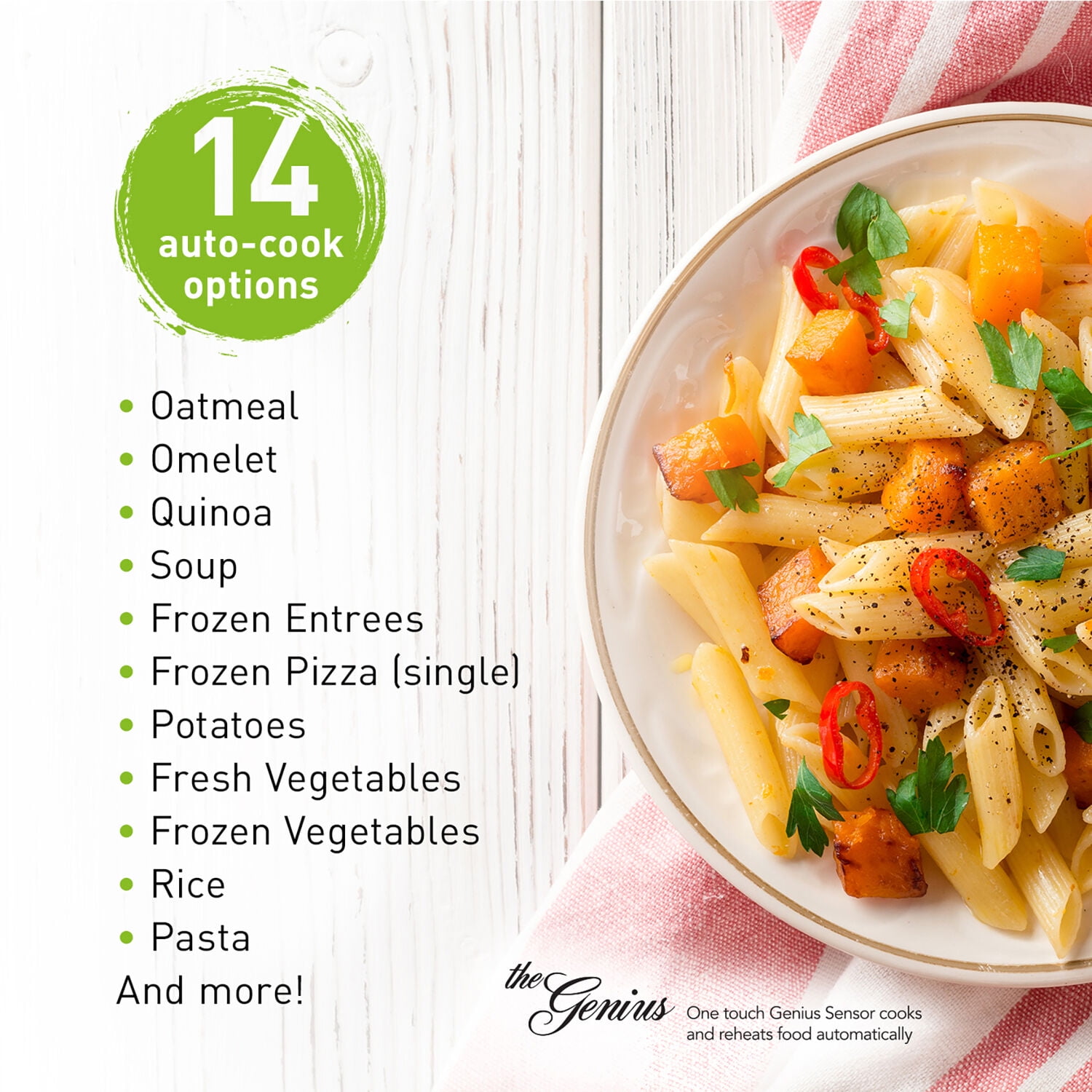 The Panasonic 1.2 cu. ft. 1200-watt Genius Sensor microwave oven with Inverter Technology is perfect for the countertop or built-in installation. Unlike other microwave ovens, Inverter technology delivers a seamless stream of cooking power, even at lower settings, for precision cooking that preserves the flavor and texture of your favorite foods. With Inverter, you can poach, braise and even steam more delicate foods, all with the speed and convenience of a microwave! With the touch of our Genius Sensor cooking button, this microwave takes guesswork out of creating a great meal by automatically setting power levels and adjusting cooking or defrosting time. The sensor measures the amount of steam produced during cooking and signals the microprocessor to calculate the remaining cooking time at the appropriate power level. Plus with Turbo Defrost, you can thaw foods faster than ever!