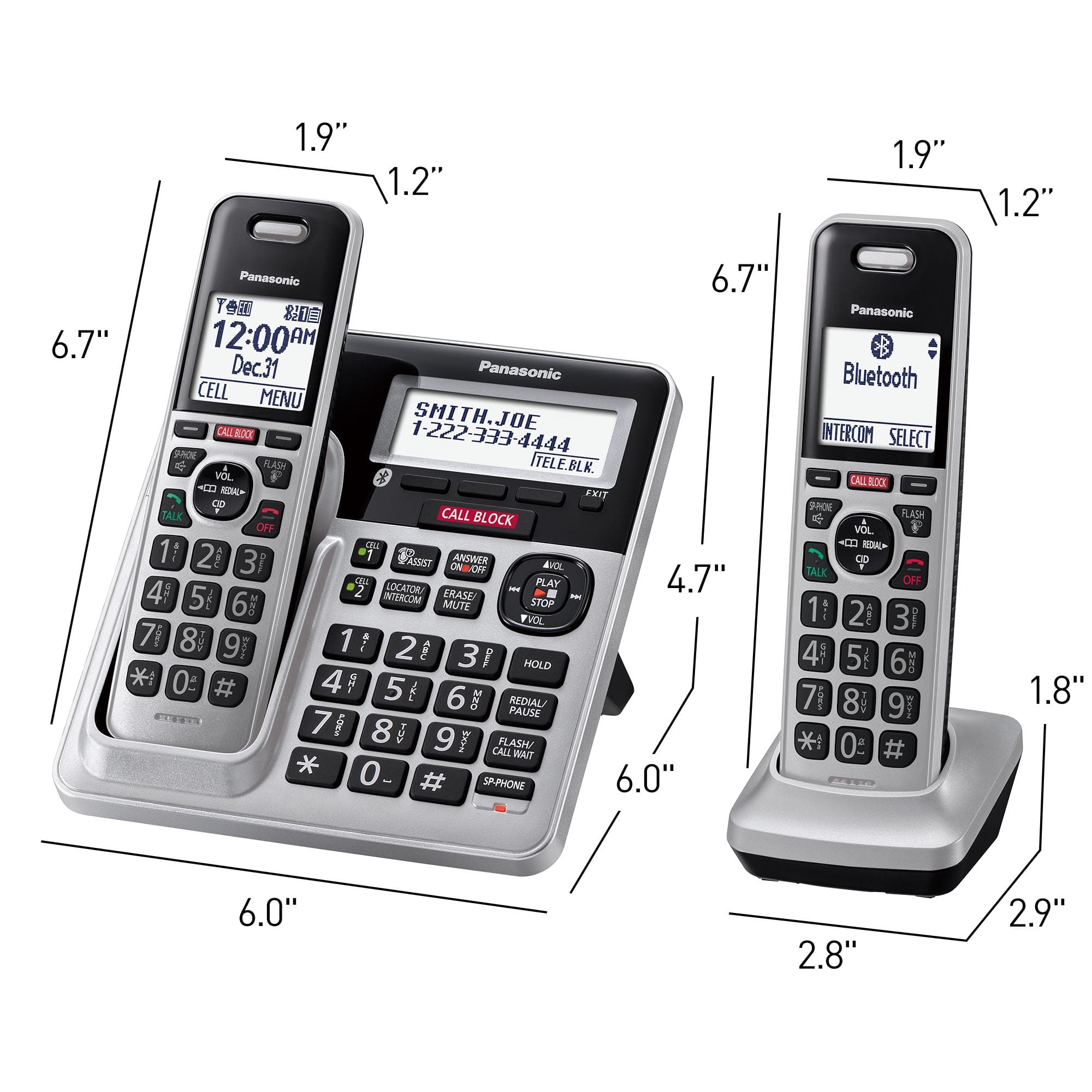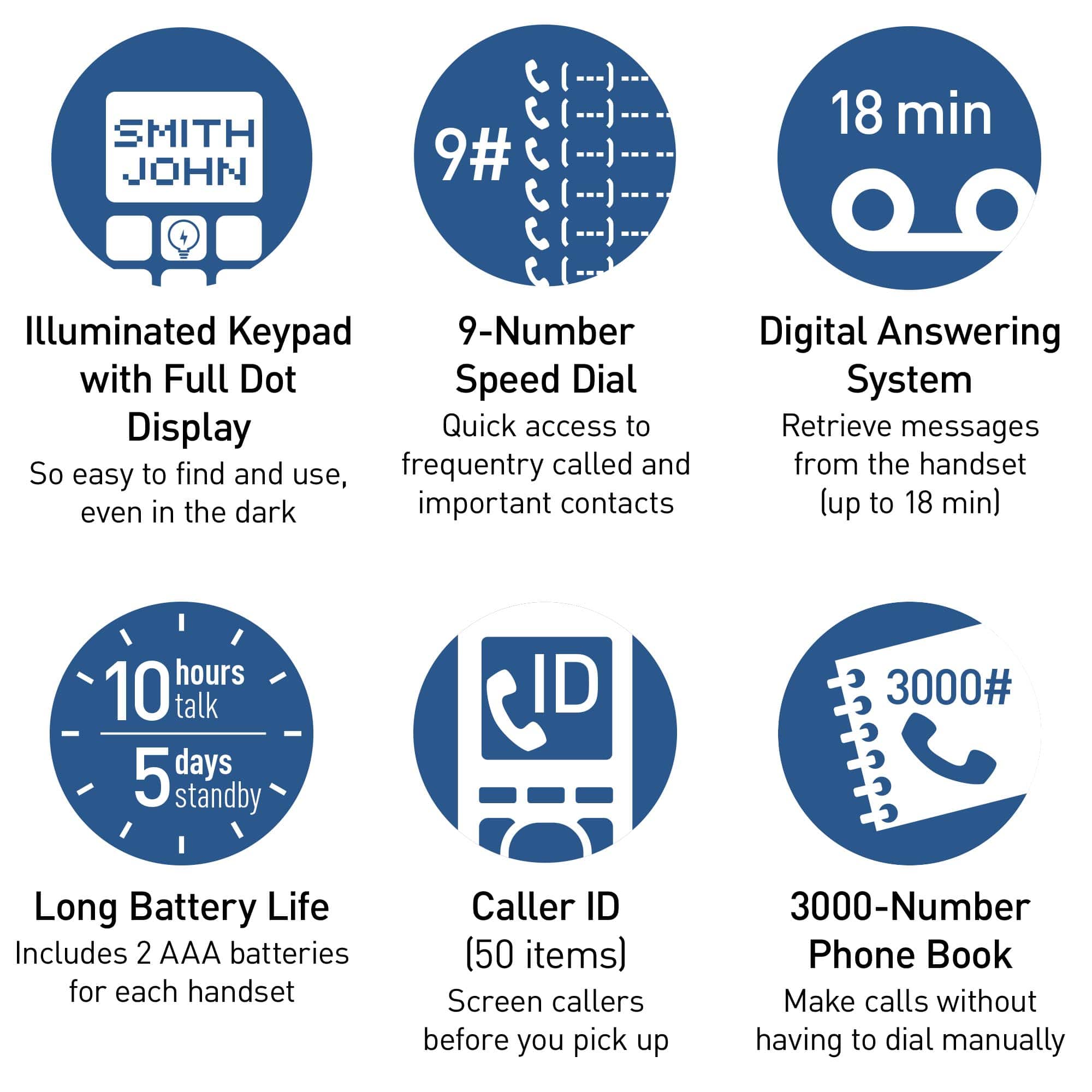 Large 2.5” backlit LCD screen on telephone base & 1.8-inch high-contrast LCD on handsets let you easily read phone numbers, text alerts, & more; backlit keys allow for easy dialing. Store up to 3,000 items in the phonebook or add important numbers into the 9-speed dial settings.