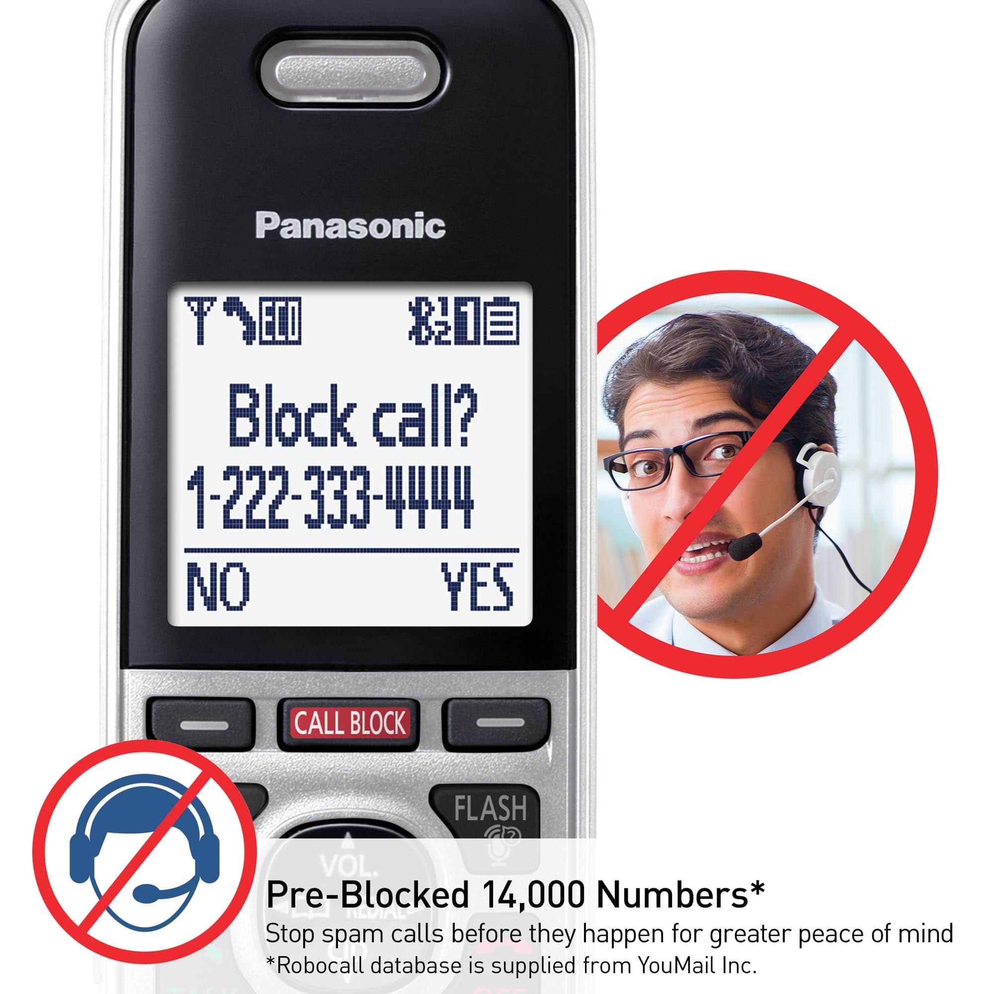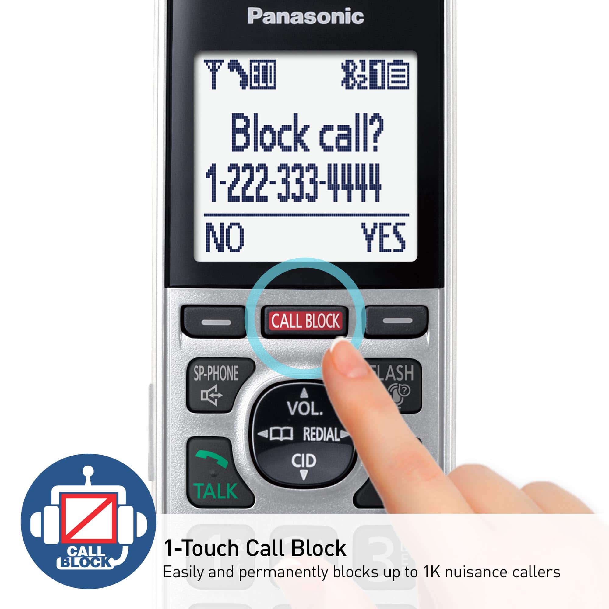 Automated Call Block blocks robocalls before phone rings with 14,000 pre-loaded numbers; Telemarketing Call Block lets you block announced callers; block an additional 2,000 numbers with the 1-touch Call Block Button; One-Ring Scam Alert helps protect you from one-ring scams.