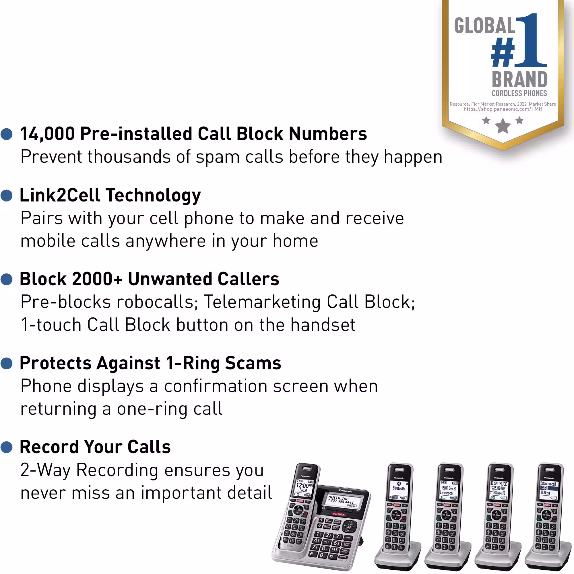 Panasonic Cordless Phone KX-TGF975S has 5 cordless handsets and answering machine for your home or office. Smart Call Block features makes it easier than ever to block and avoid nuisance callers and Link2Cell connects cell phones via Bluetooth to make and receive mobile calls on your home phone handsets for call clarity even in cell dead zones.