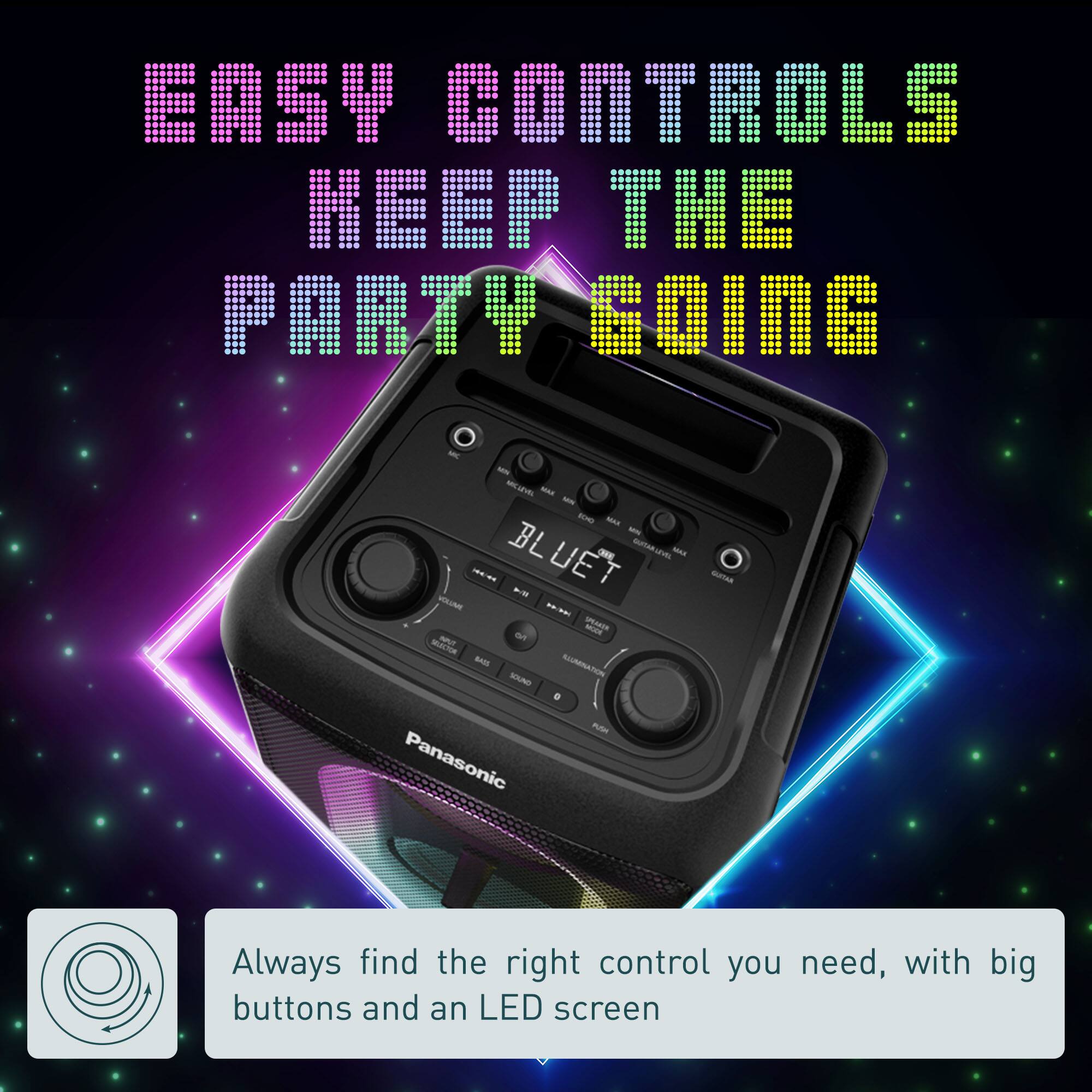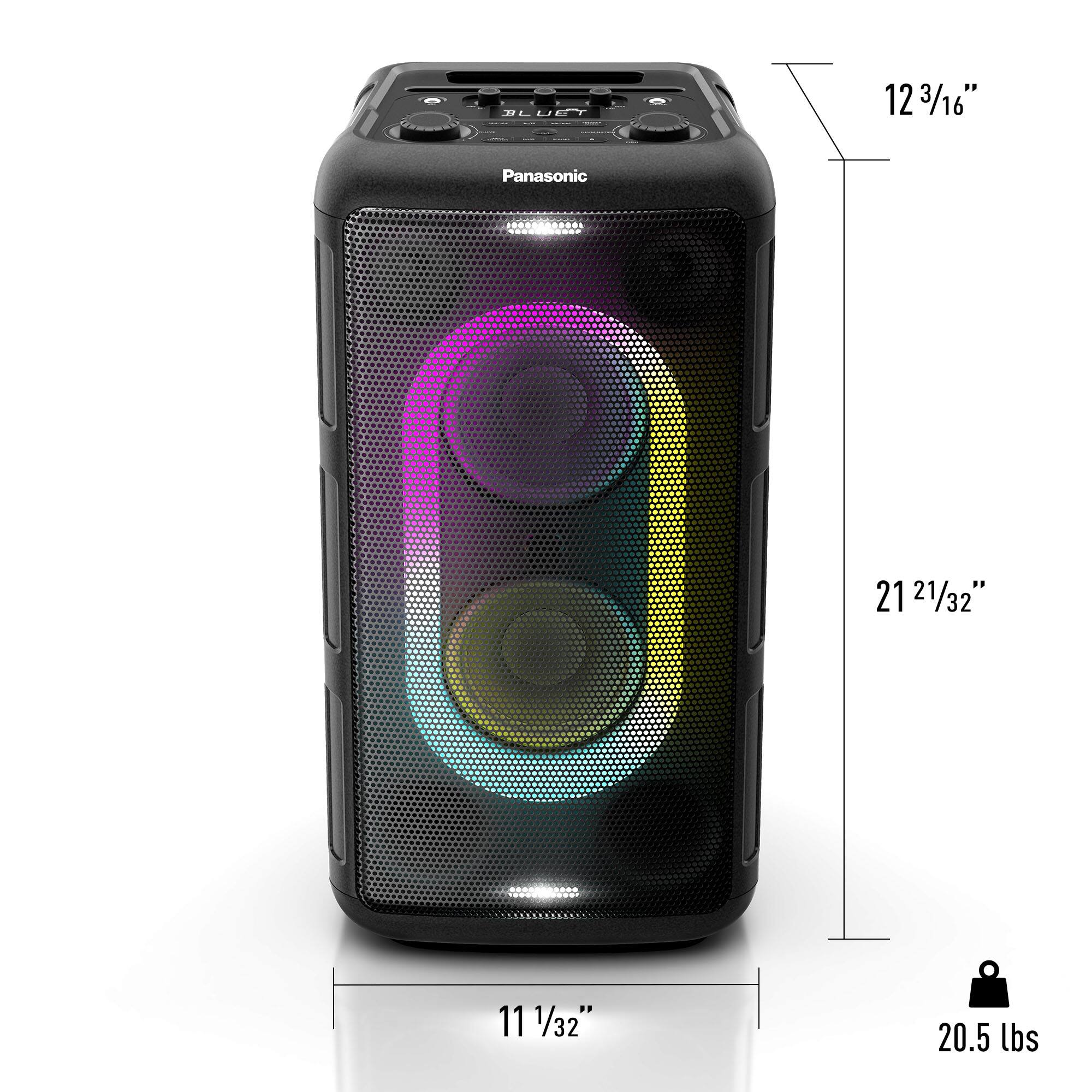 Perfect for the beach, park, or home, the Panasonic BMAX10 party box boasts booming sound and a vibrant light show. Wired and wireless connections let you tream music from your phone or TV, plug in your guitar or mic, or host a karaoke party with a Bluetooth microphone. Easy-to-use cordless design with a built-in rechargeable 15-hour battery keeps the good vibes going wherever you are.
