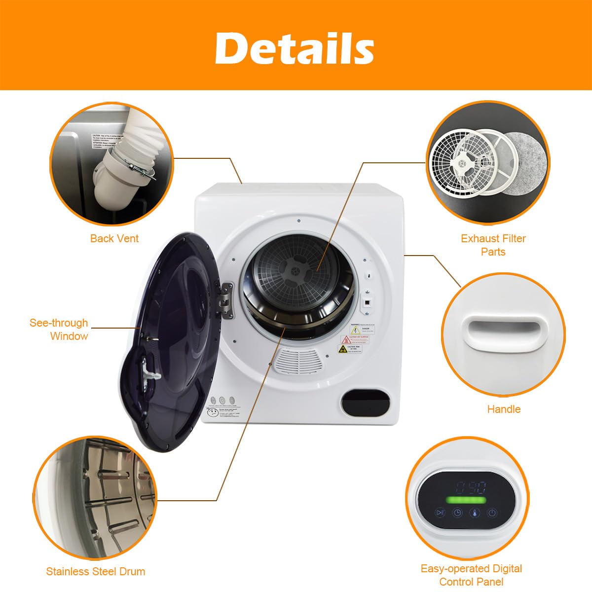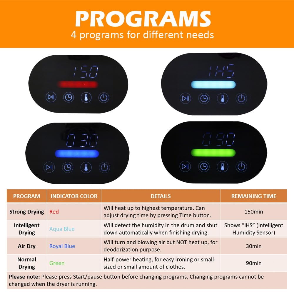 Compact & Space-Saving- Panda compact dryer (19.5” L x 16.1” W x 23.8” H) is perfect for apartments or other small living spaces, such as condominium, dorms, or RVs. And you can use it as the secondary one in your laundry room. Smart laundry choice- Panda mini laundry dryer meets your various needs by providing four drying programs-Strong drying, Intelligent drying, Air drying and Normal drying. With the forward and reverse drum movements, our 1.5 cu. ft clothes dryer is tangle free and it effectively removes wrinkles and restores fluffy and soft fabrics. High Performance-With a powerful motor rate of 850 Watts, our Panda 1.5 cu. ft portable dryer is ideal for drying baby’s clothes, underwear, Pajama, yoga suit, T-shirts, towel, handkerchief, socks, etc. To drying clothes quickly, we recommend not putting more than 5.5 pounds of clothes at one time. Portable and Electricity-Saving- Featuring digital touch screen controls with a modern design, this Panda mini vented dryer comes with a removable lint filter, and a mounting bracket kit is also included. It saves your electricity bill and with a regular 3 prongs 110-120Volt means it can be plugged anywhere. Durable and Quiet-The high-quality stainless-steel interior tub of our Panda small laundry dryer is durable, and it resists rust and chipping. It uses a built-in sensor which enables it automatically to shut off when the clothes inside reach optimal dryness.