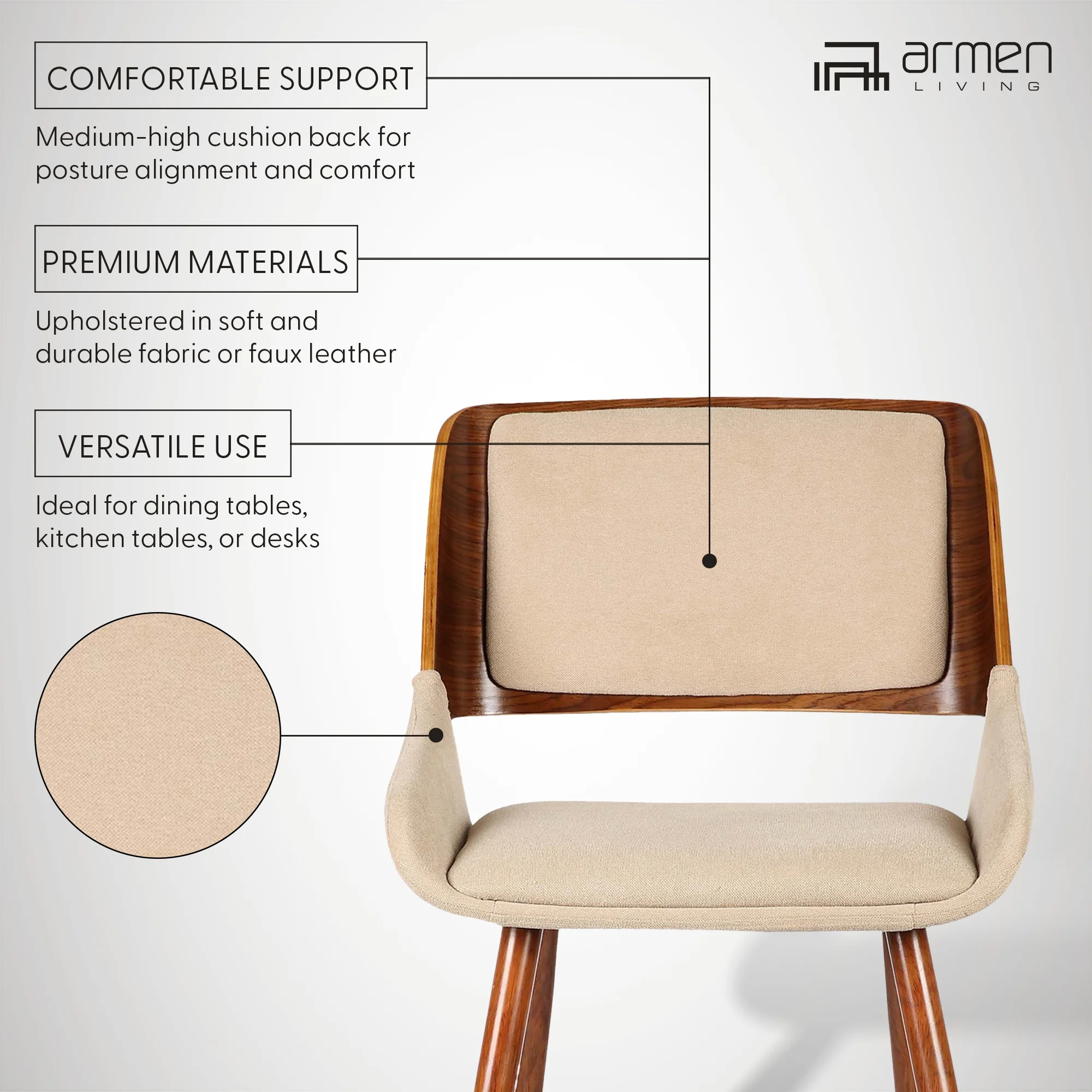The Armen Living Panda mid-century dining chair is a great way to bring the comforts of yesteryear into your modern life. The sleek design of this contemporary marvel combines a softly curved hardwood walnut frame with an elegantly padded back. The seat is wide and accommodating as well, making this side chair a wonderful comfort piece for the living or dining room. The plush medium firm density cushion seat and back will provide you with all day comfort. The medium high open lower back is ideal for posture alignment and an unmatched support for days on end. The box style with walnut accent along the exterior of the chair is both unique and eye catching any where in your home. The foundation of the product is supported by solid walnut wood and metal for a sturdy and stylish aesthetic without comprising practicality and functionality of this item. This product ships in one box with easy and quick set up. We stand by the quality, the craftsmanship and the integrity of our product by offer 1-year warranty for all our products. The Panda’s sturdy metal legs are rounded off and tapered with a stylish walnut wood finish. The Panda is upholstered in your choice of exquisite fabric, available in gray and brown, or black faux leather. Product Dimensions: 20″W x 25″D x 31″H SH: 18″