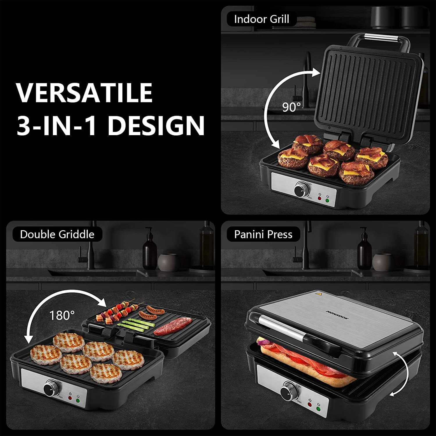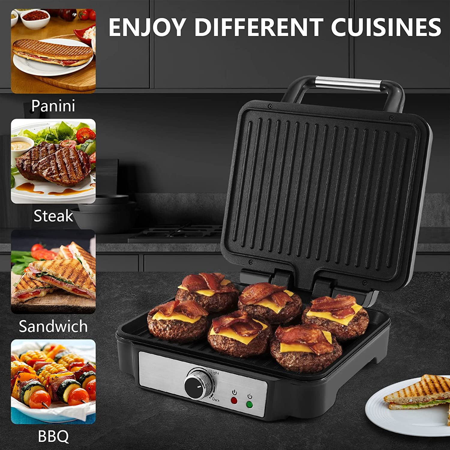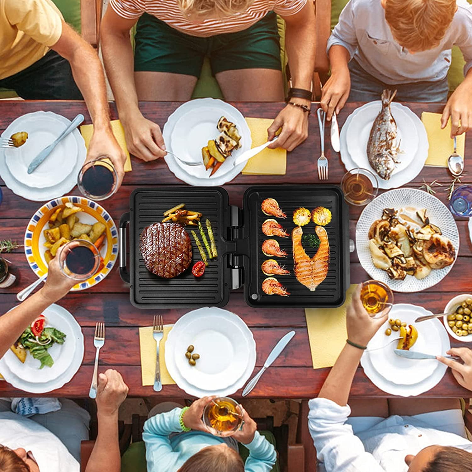 Versatile 3-in-1 Design: More than just a panini maker, when turned on at 180° it will act like a large electric grill (2 large 11.02×9.06 inch cooking plates) for grilling steaks, sandwiches, paninis, vegetables, and more for any indoor grilling needs Efficient Cooking: With a high power output of 1400 watts and double-sided heating technology, this sandwich maker panini press ensures quick and even cooking. The thermostatic control of the press grill allows you to adjust the temperature of the grill between 410°F and 482°F depending on the cooking requirements of different foods Easy to Use: The panini grill has a simple control system with a red light for the power indicator and a green light for the preheat indicator. When the panini maker is plugged in, both lights will come on at the same time. When the set temperature is reached, the green light will come on. Bring you a convenient and fast cooking experience Healthy Cooking and Easy Cleaning: Configured with a grease drain as well as a drip cup, there is a grease drainage channel between the double plates so that the drip cup catches excess grease and food residue, making food healthier as well as less of a cleaning hassle. The non-stick pan plate made of food-grade aluminum ensures reliable use, releasing food quickly and allowing for quick and easy cleanup without effort. Simply wipe with a damp cloth after the non-stick plate has cooled Compact and Safe: The compact size of only 12.64×12.44×4.84 inches takes up very little counter or cabinet space, making your grill easy to store. The electric panini press grill’s cool touch handle and non-slip feet keep you safe while in use. Ideal for small kitchen spaces, dorm rooms, and offices