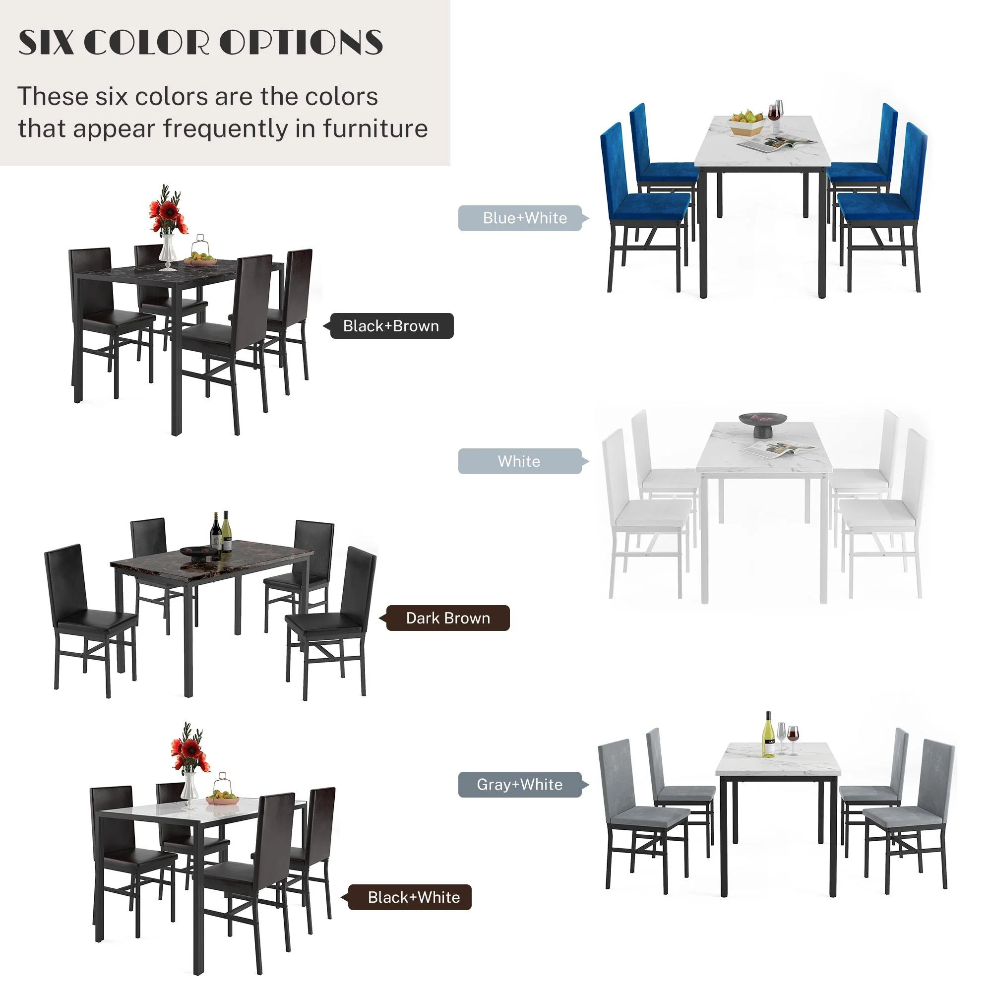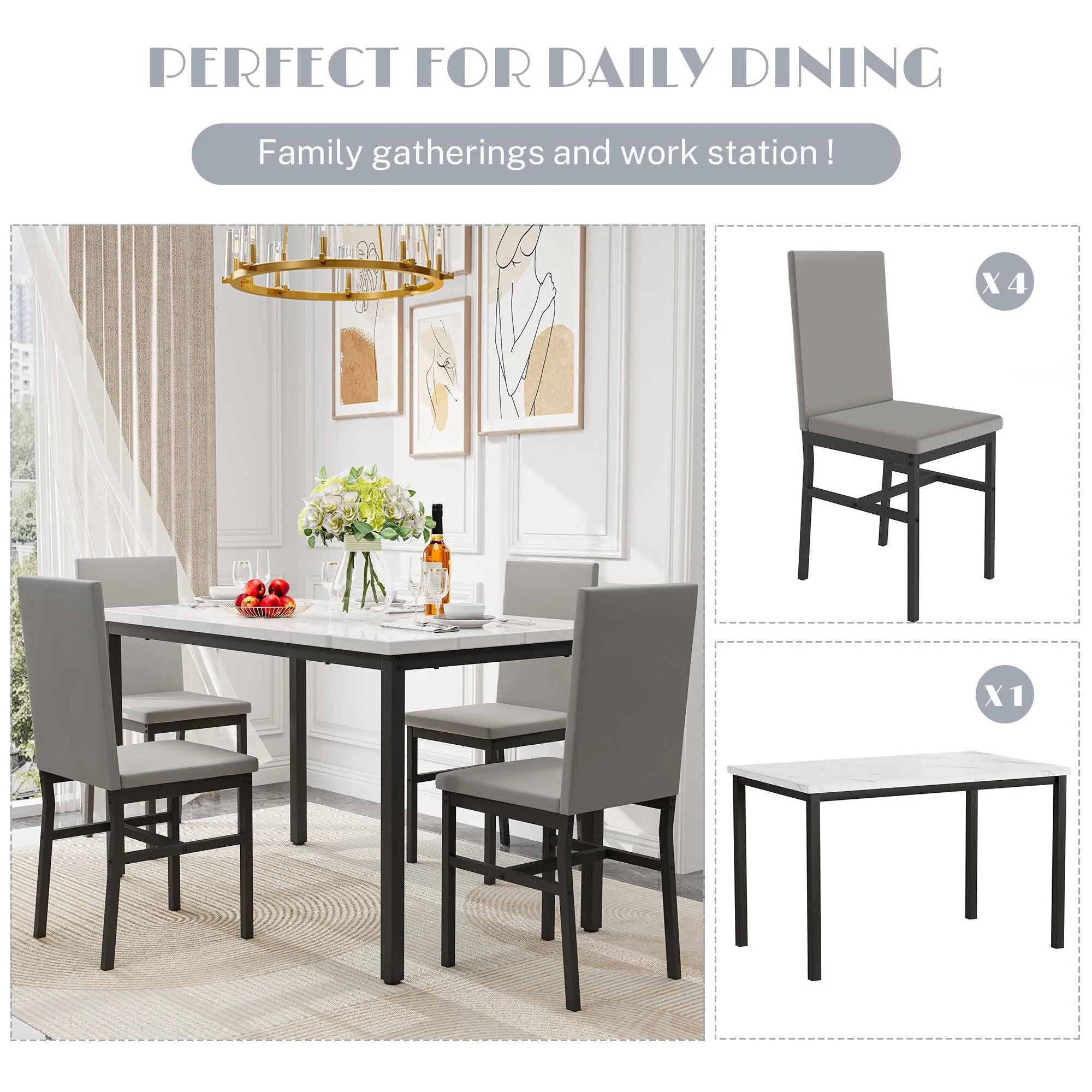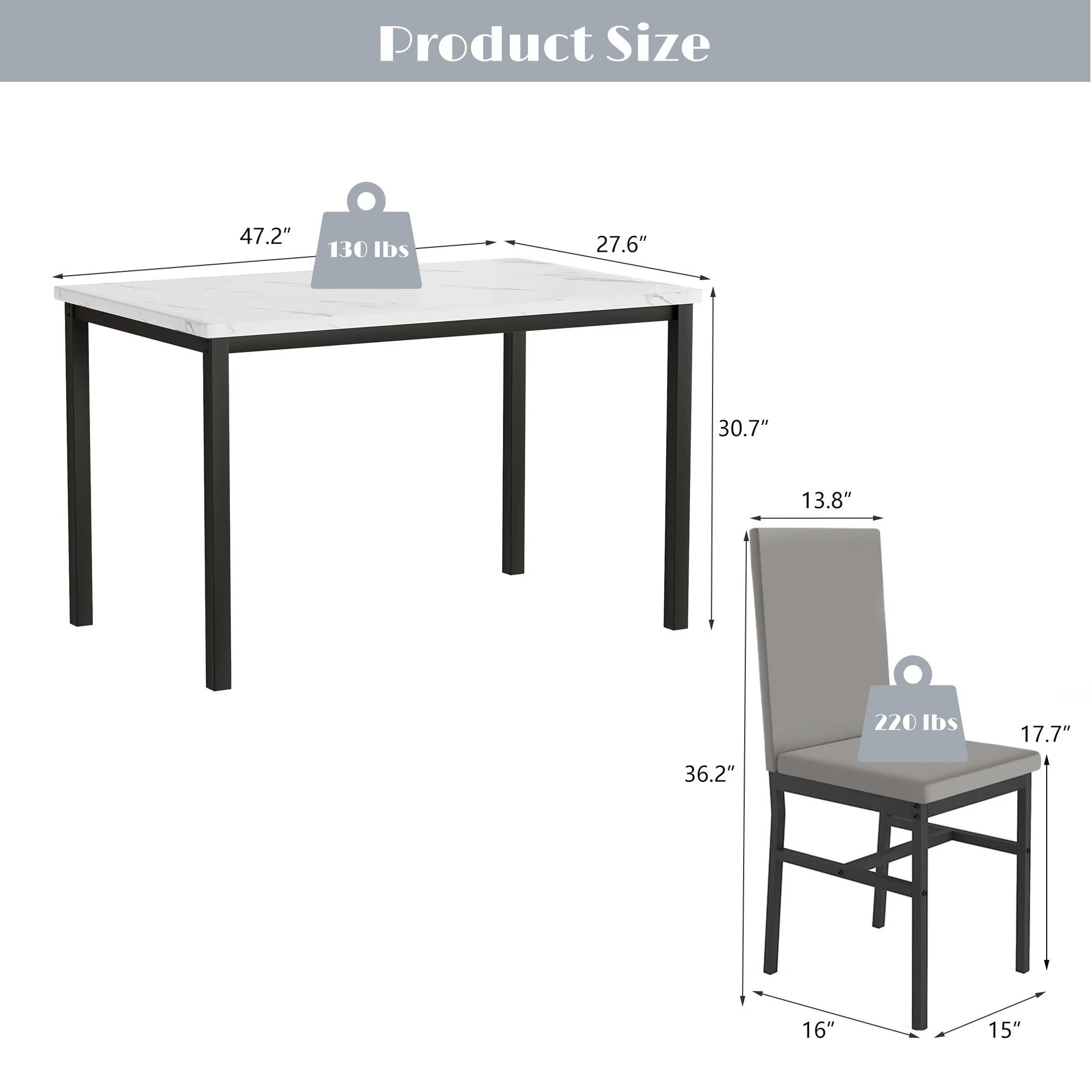 [High-End Kitchen Table Set] – The Imitation marble surface and straight lines, with a bright shiny appearance. The chair is decorated with soft cushions and durable leather to provide a comfortable seating experience. In addition, the ergonomically designed chair is also equipped with a high backrest, which can maintain your body support when you lean back, thereby increasing comfort. [Space-Saving Design] – The dining table and chairs set contains space saver table and chairs 4, you don’t need to worry about occupying big space in your dining room or kitchen room, the 4 dining chairs can be stowed away under the dining table completely, which is compact in design and very space-saving, it is really suitable for your kitchen, dining room or other small space. [Easy to Clean] – The waterproof marble table top and the leather surface can be cleaned most easily when sprinkling or drinking water. Just wipe them clean in a few seconds! [Enjoy a Wonderful Dinner] – 4 velvet dining chairs seat with the solid metal frame offers durability that you can enjoy for many years. High back and armless chairs provide unexpected comfort for you and your families. Whether you are looking for extra seating in your breakfast nook or dining room or use it as an entertaining station, this 5-piece set is the best choice. [Widely Use] – The simple and elegant design makes this dining room table and chairs set suitable for various scenes, you can not only use it as a small kitchen table and chairs in your kitchen or dining room but also use it for the living room, restaurant, coffee shop or office meeting room. The spacious rectangular dining space is good for 4 people to enjoy dinner, coffee and afternoon tea, book, etc.