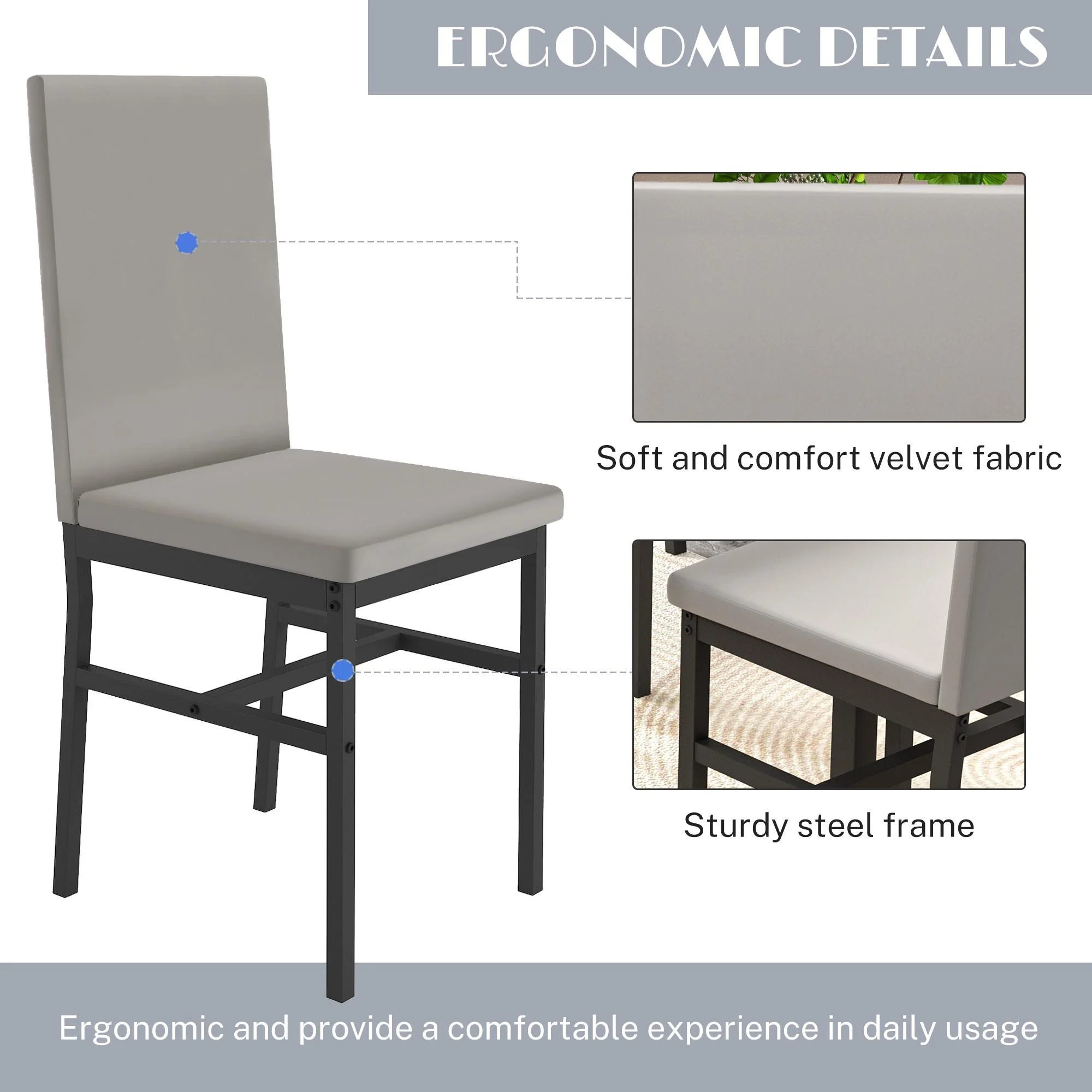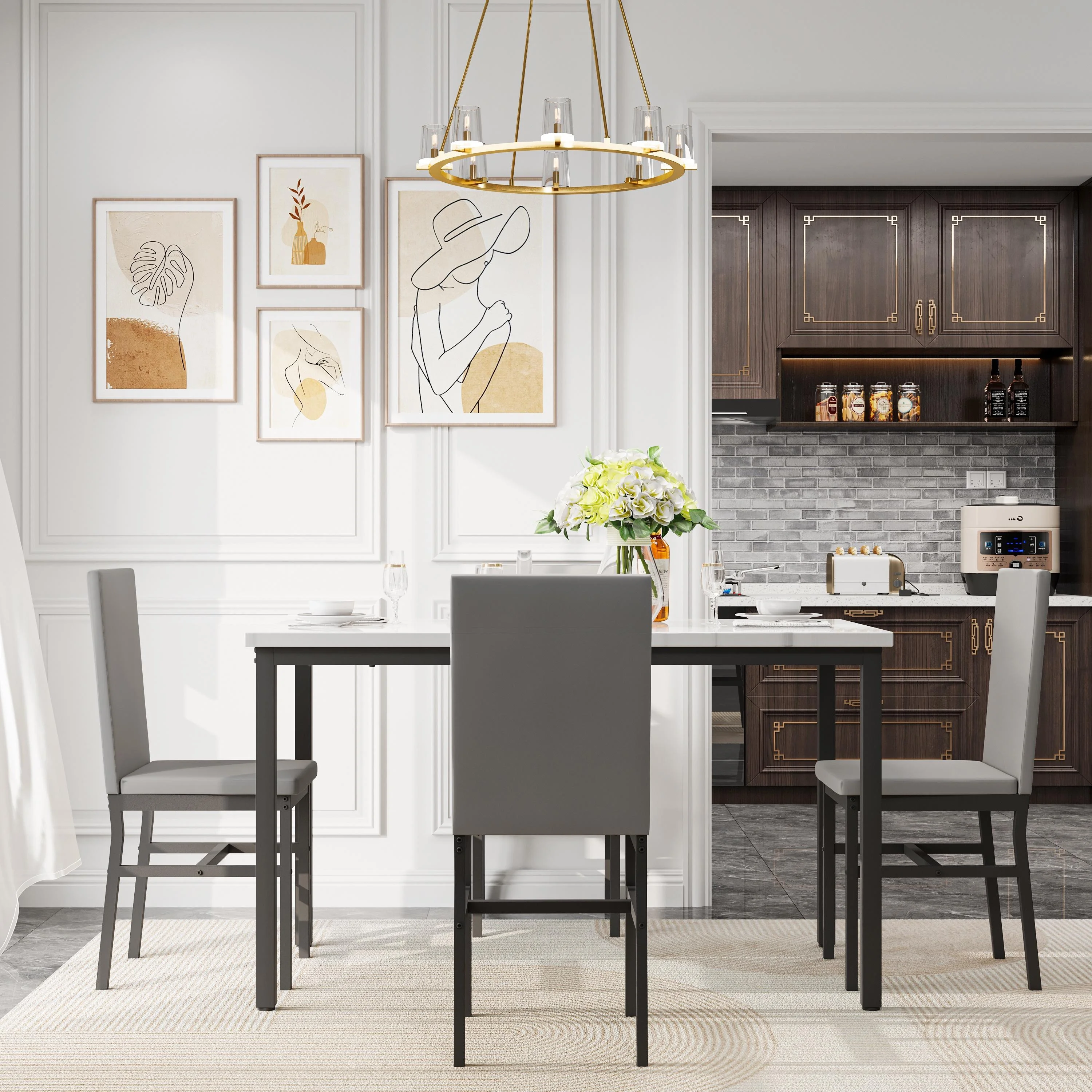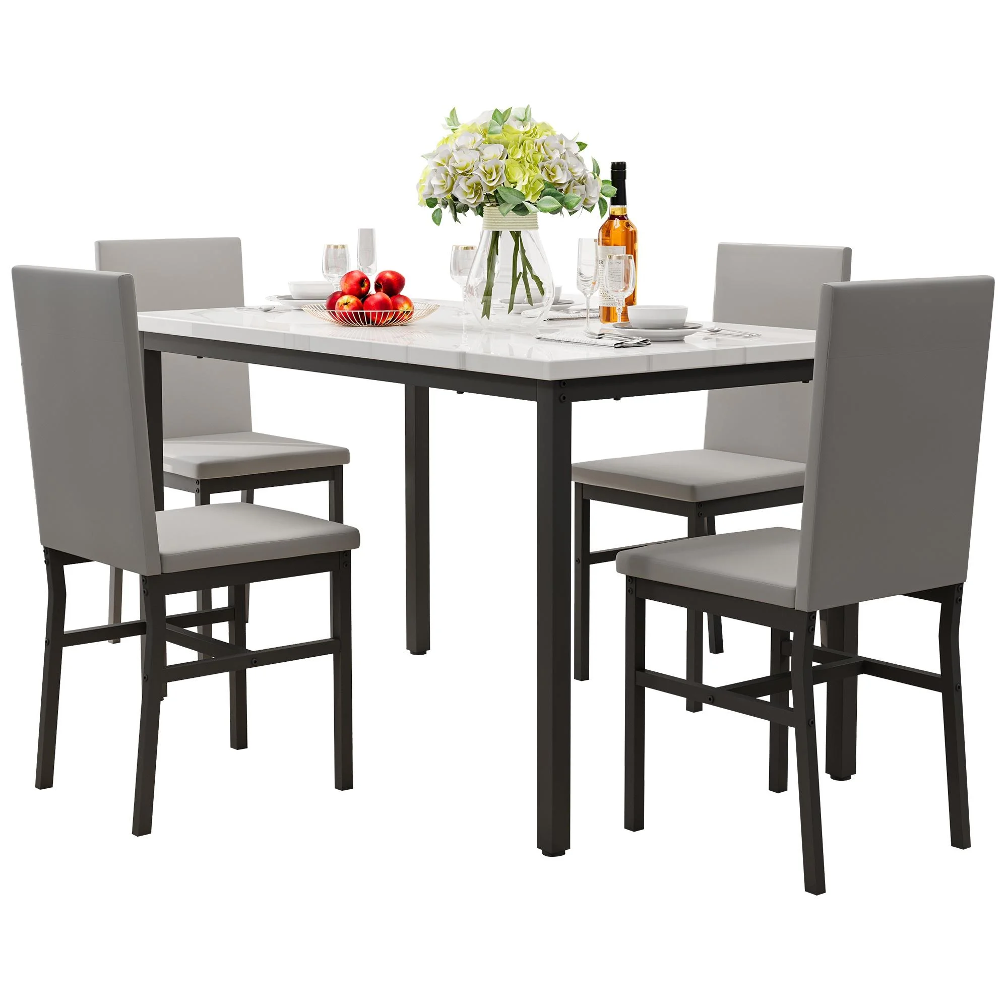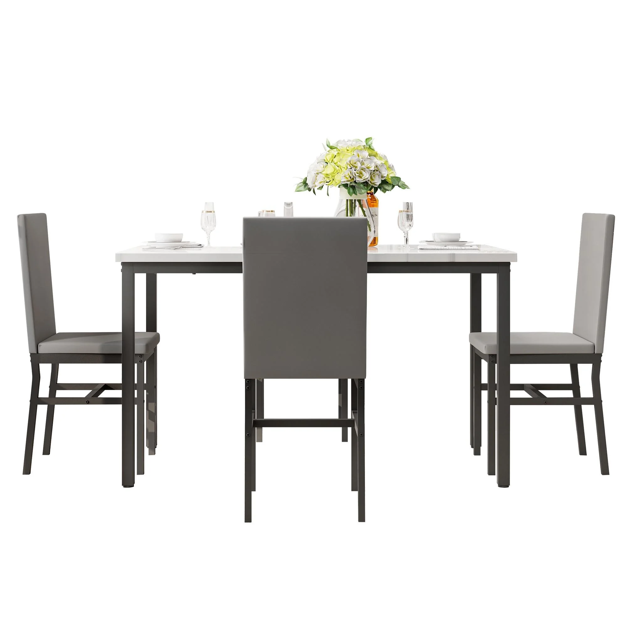 [High-End Kitchen Table Set] – The Imitation marble surface and straight lines, with a bright shiny appearance. The chair is decorated with soft cushions and durable leather to provide a comfortable seating experience. In addition, the ergonomically designed chair is also equipped with a high backrest, which can maintain your body support when you lean back, thereby increasing comfort. [Space-Saving Design] – The dining table and chairs set contains space saver table and chairs 4, you don’t need to worry about occupying big space in your dining room or kitchen room, the 4 dining chairs can be stowed away under the dining table completely, which is compact in design and very space-saving, it is really suitable for your kitchen, dining room or other small space. [Easy to Clean] – The waterproof marble table top and the leather surface can be cleaned most easily when sprinkling or drinking water. Just wipe them clean in a few seconds! [Enjoy a Wonderful Dinner] – 4 velvet dining chairs seat with the solid metal frame offers durability that you can enjoy for many years. High back and armless chairs provide unexpected comfort for you and your families. Whether you are looking for extra seating in your breakfast nook or dining room or use it as an entertaining station, this 5-piece set is the best choice. [Widely Use] – The simple and elegant design makes this dining room table and chairs set suitable for various scenes, you can not only use it as a small kitchen table and chairs in your kitchen or dining room but also use it for the living room, restaurant, coffee shop or office meeting room. The spacious rectangular dining space is good for 4 people to enjoy dinner, coffee and afternoon tea, book, etc.