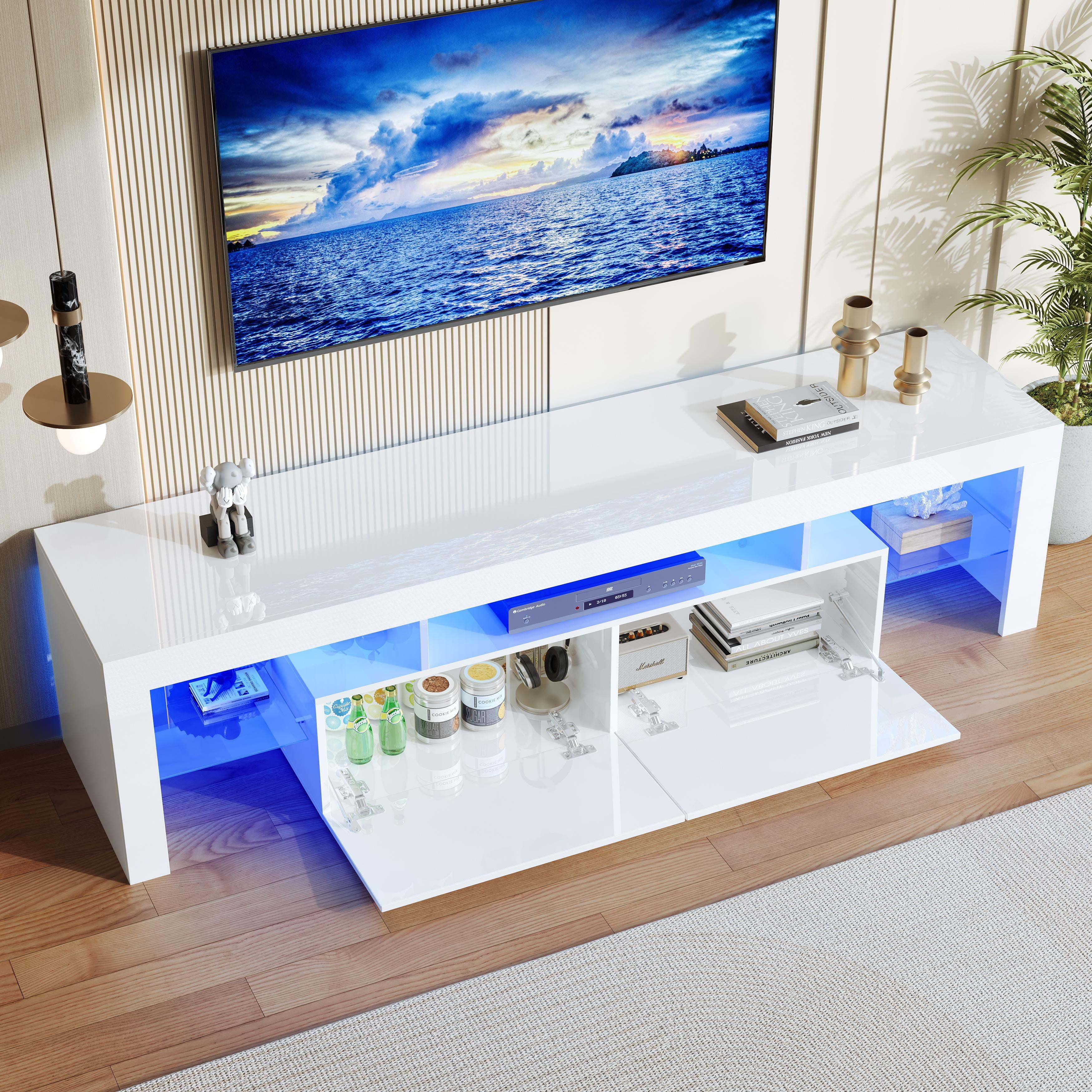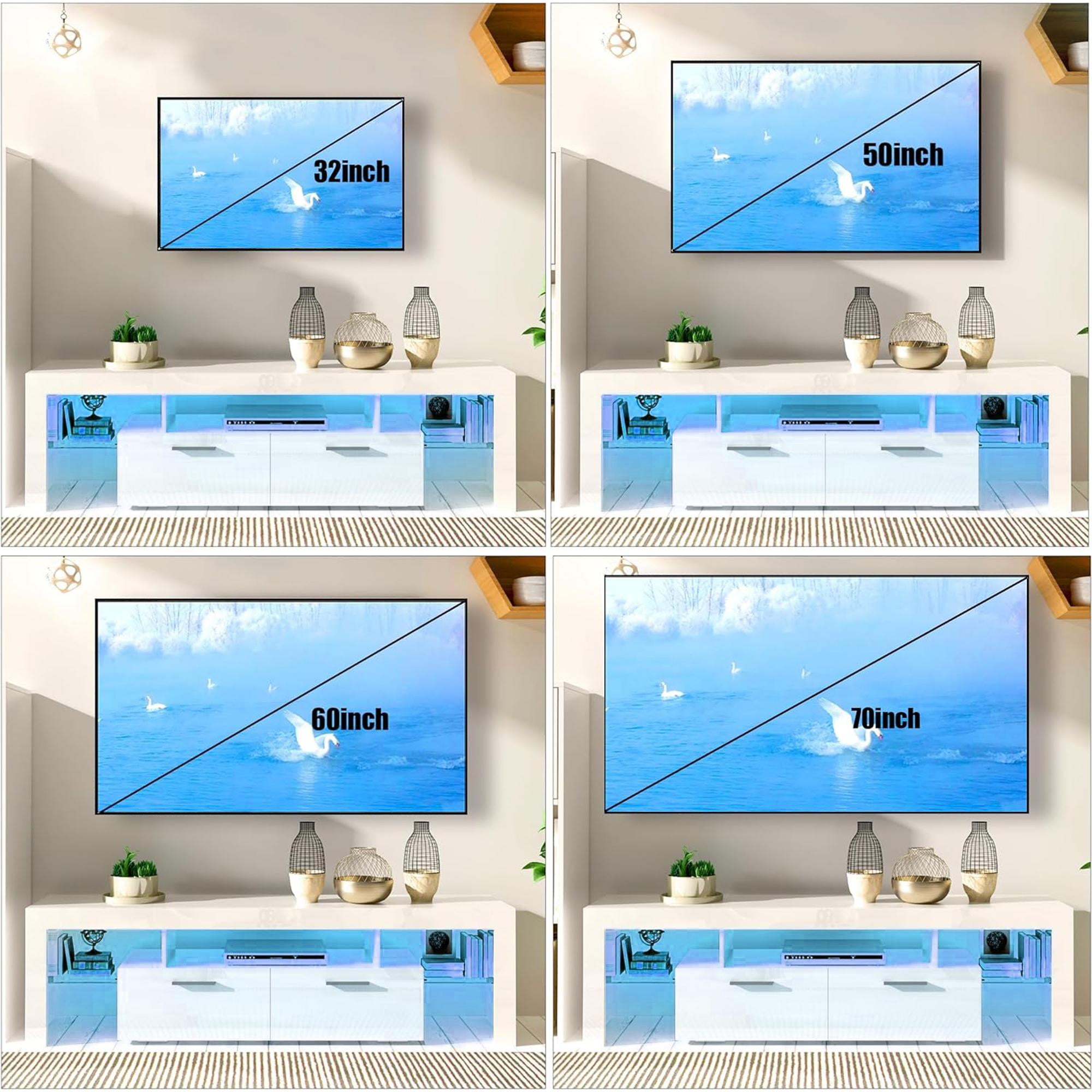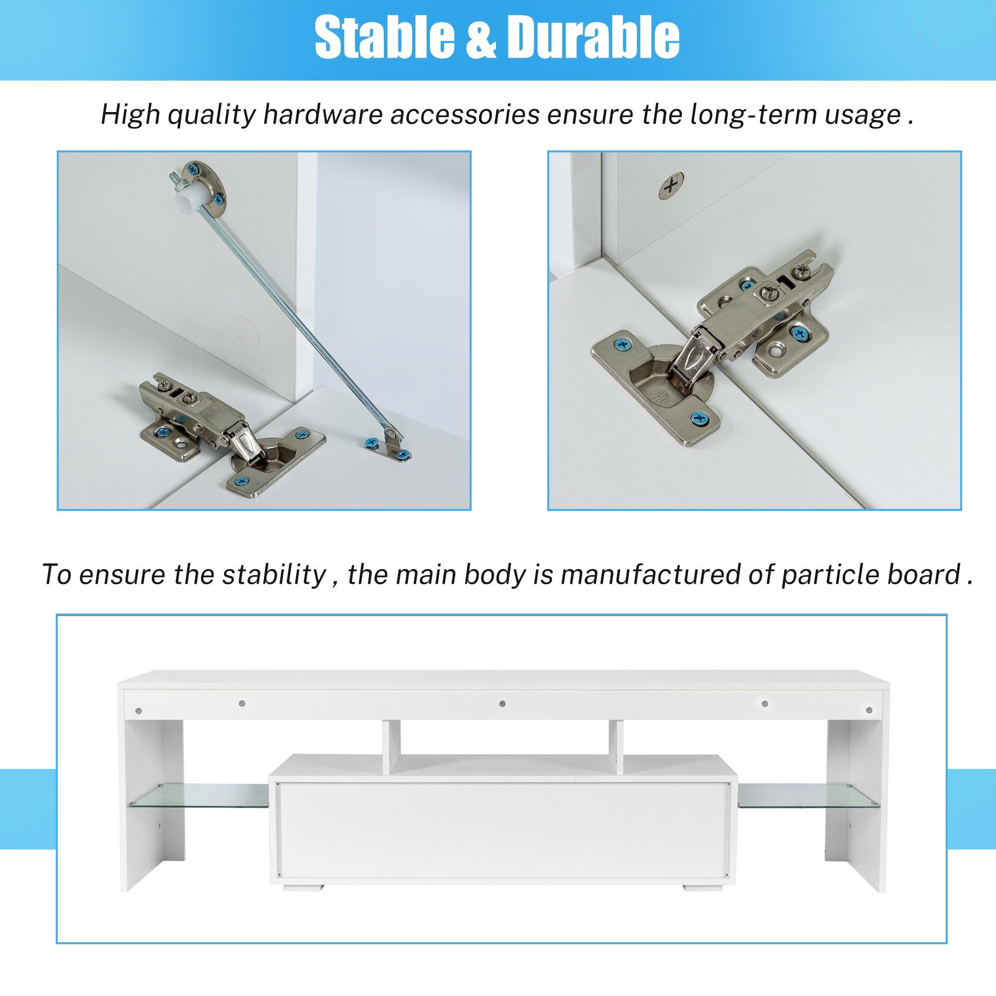 [Multiple Color LED Lights] – Our TV stand has built-in LED lighting with over 6000000 colors, 29 flashing modes, and flicker frequencies to create a beautiful ambiance that enhances your living room. [Exquisite Craftsmanship] – The TV cabinet uses high-density chipboard, quality hardware, and fine durable workmanship, and the top plate has good toughness, corrosion resistance, abrasion resistance, and good resistance to deformation. [High Gloss Surface] – This TV stand finish design takes extra energy and time in the manufacturing process, this kind of high gloss tabletop is more high-end than other materials. Besides, it is easier to clean and take care of, ensuring the TV console table is superior and graceful. [Elegant Tempered Glass Shelving] – This modern TV stand also features smooth glass shelving with rounded edges that are perfect for supporting and displaying video game consoles, DVDs, Blu-ray players, books, movies, or knick-knacks. [Large Storage Capacity] – Along with an open-layer frame, this LED TV stand features 2 big drawers perfect for storing video games, movies, remote controls, entertainment accessories, and more.