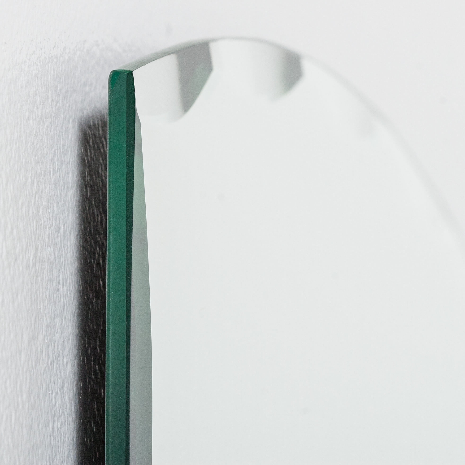 Mirror measures 31.5″ x 23.6″ Hangs vertically only Hanging brackets included This mirror is made using real silver, not aluminum. Silver mirrors last longer and provide a warmer reflection. Distortion free. We use high quality glass so you wont get that funhouse effect that is common in inferior cheap mirrors The invisible mounting hardware is designed to keep your mirror secure and keeps the hardware out of sight Mounting hardware included, comes ready to hang. Hangs vertically only. Crafted of thick, strong 3/16 float glass Bottom of mirror is 16″ wide and about 28.5″ from bottom of mirror to point of curve. Great for Bathroom mirror, Vanity mirror, Living Room mirror or Bedroom mirror