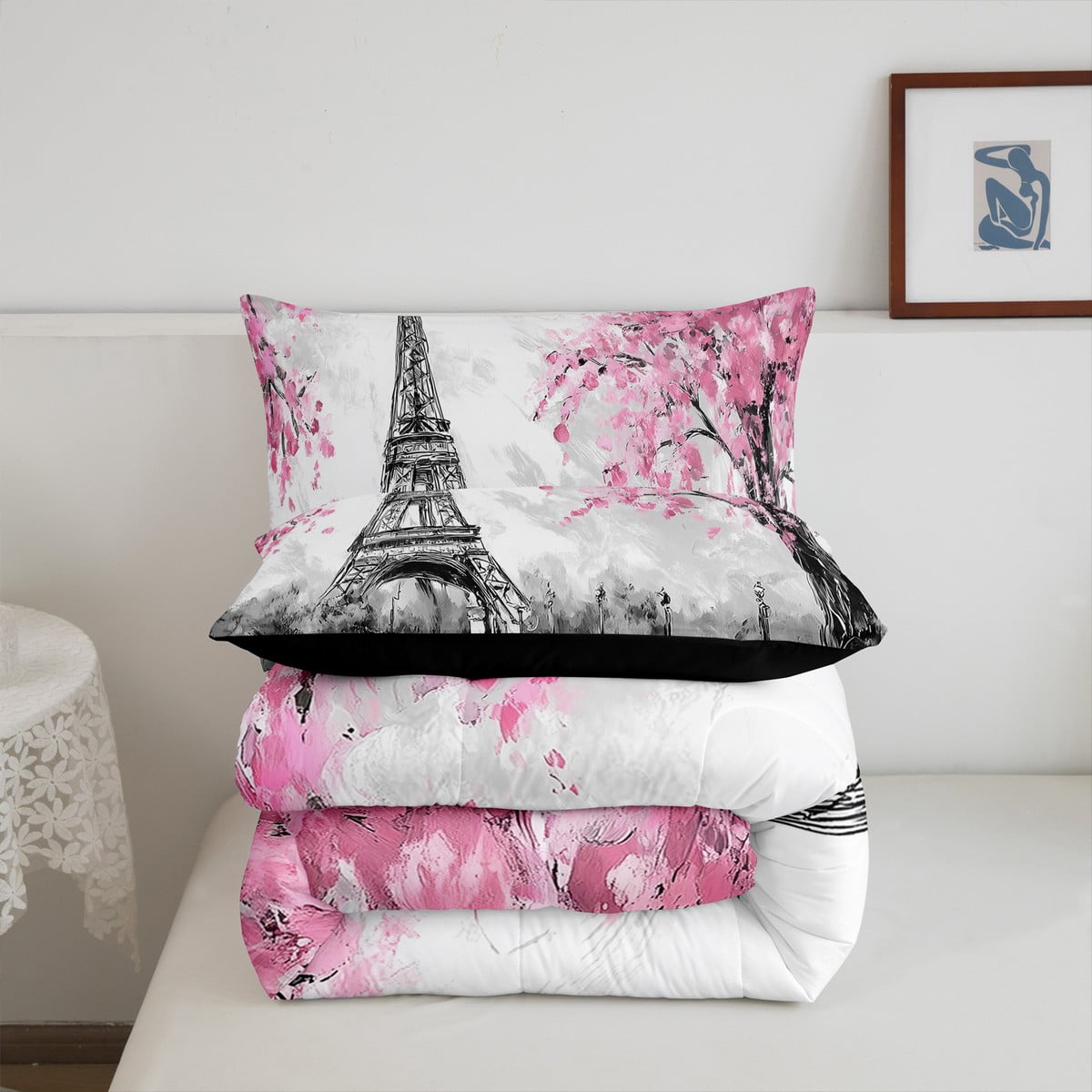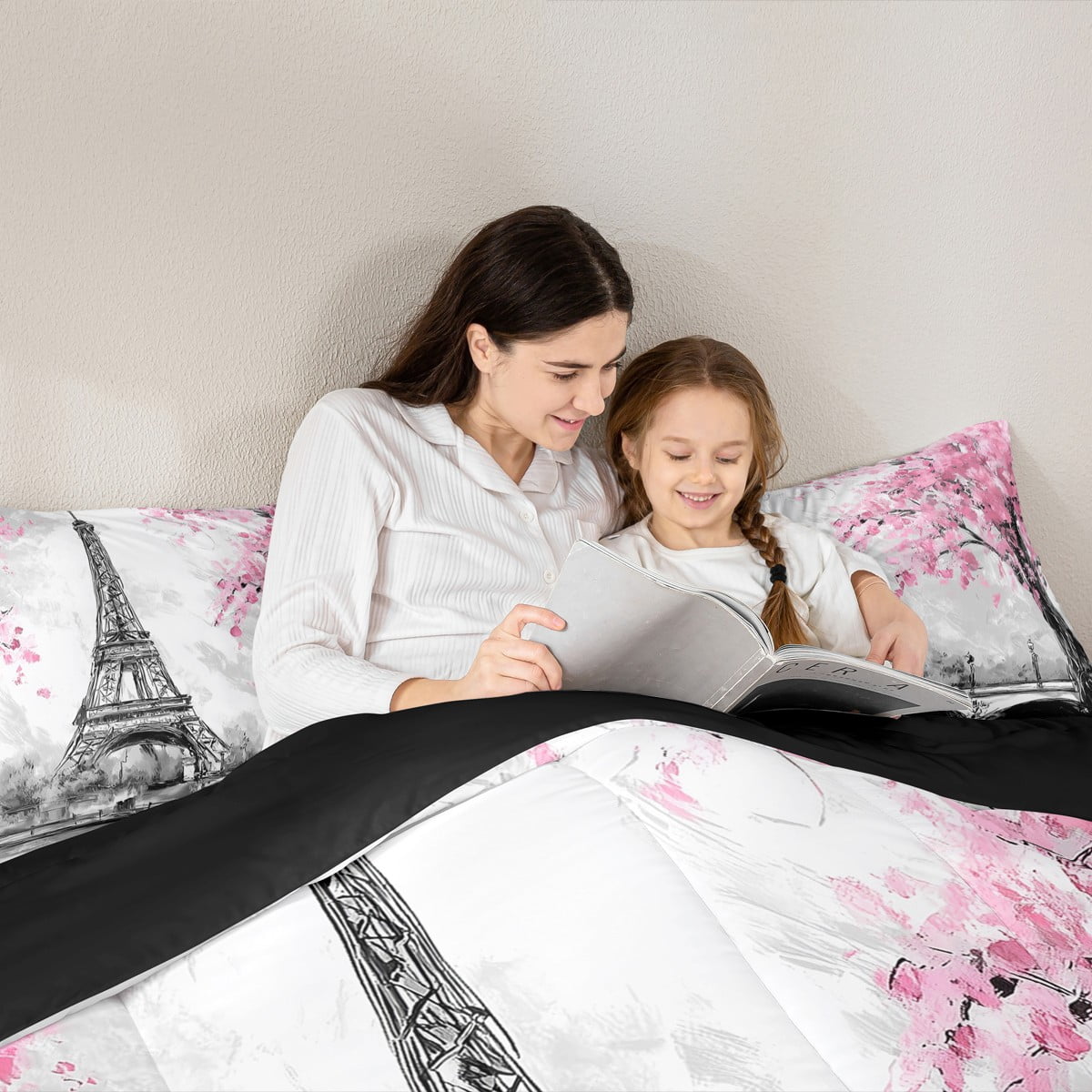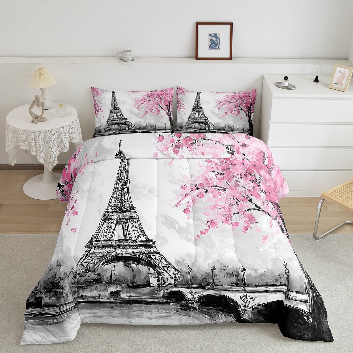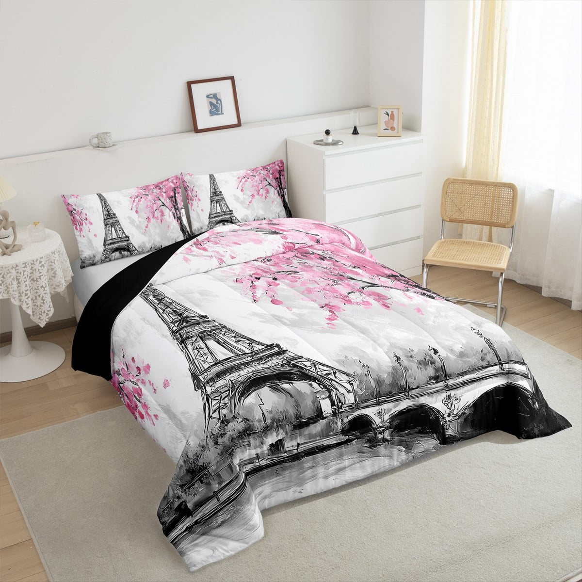 Paris Bedroom Comforter Set Twin,Eiffel Tower Bedding Sets For Teen Women Retro Romantic Pink and Grey Couple Valentine Bed Comforter Set Black Gray Room Decor 1 Comforter + 1 Pillow Case