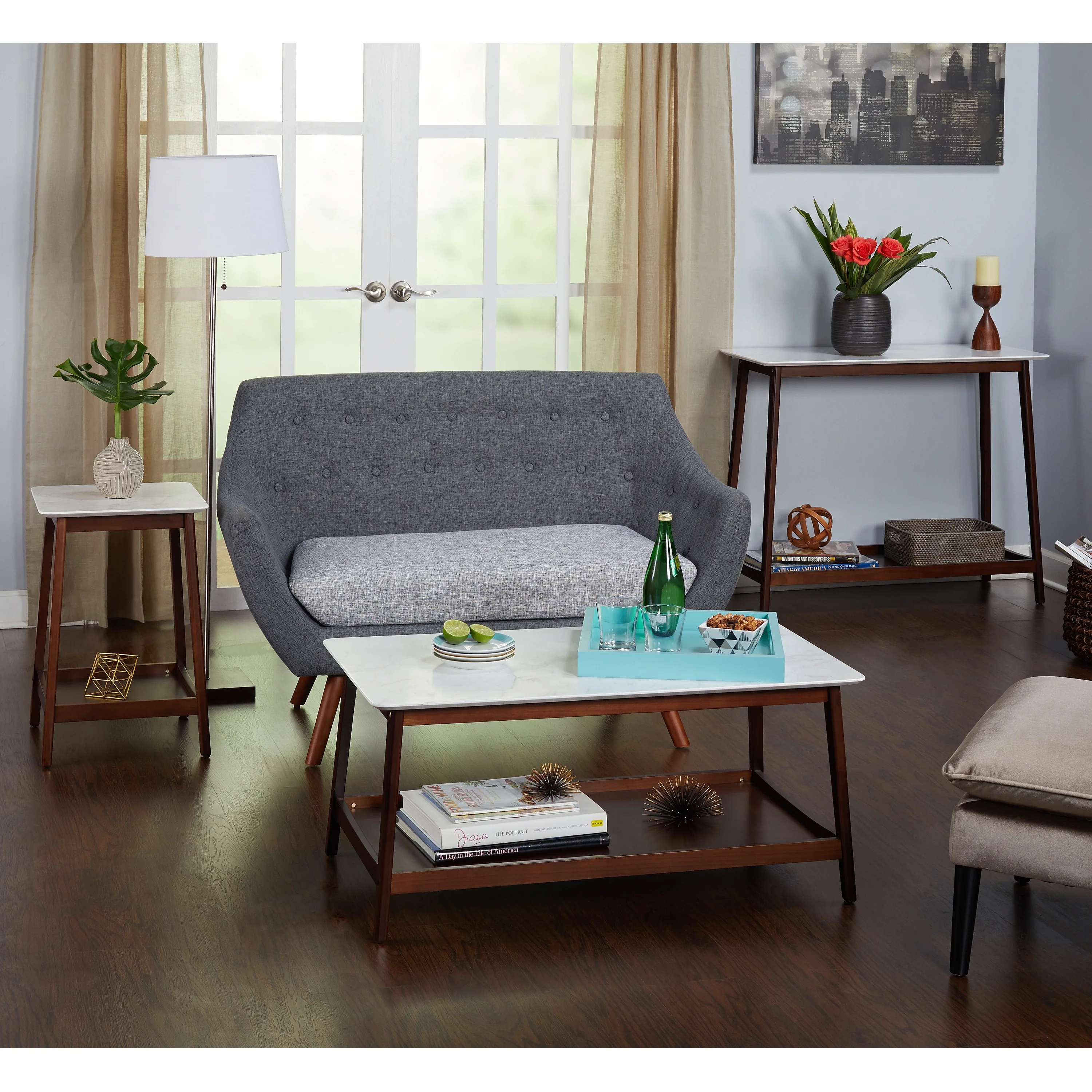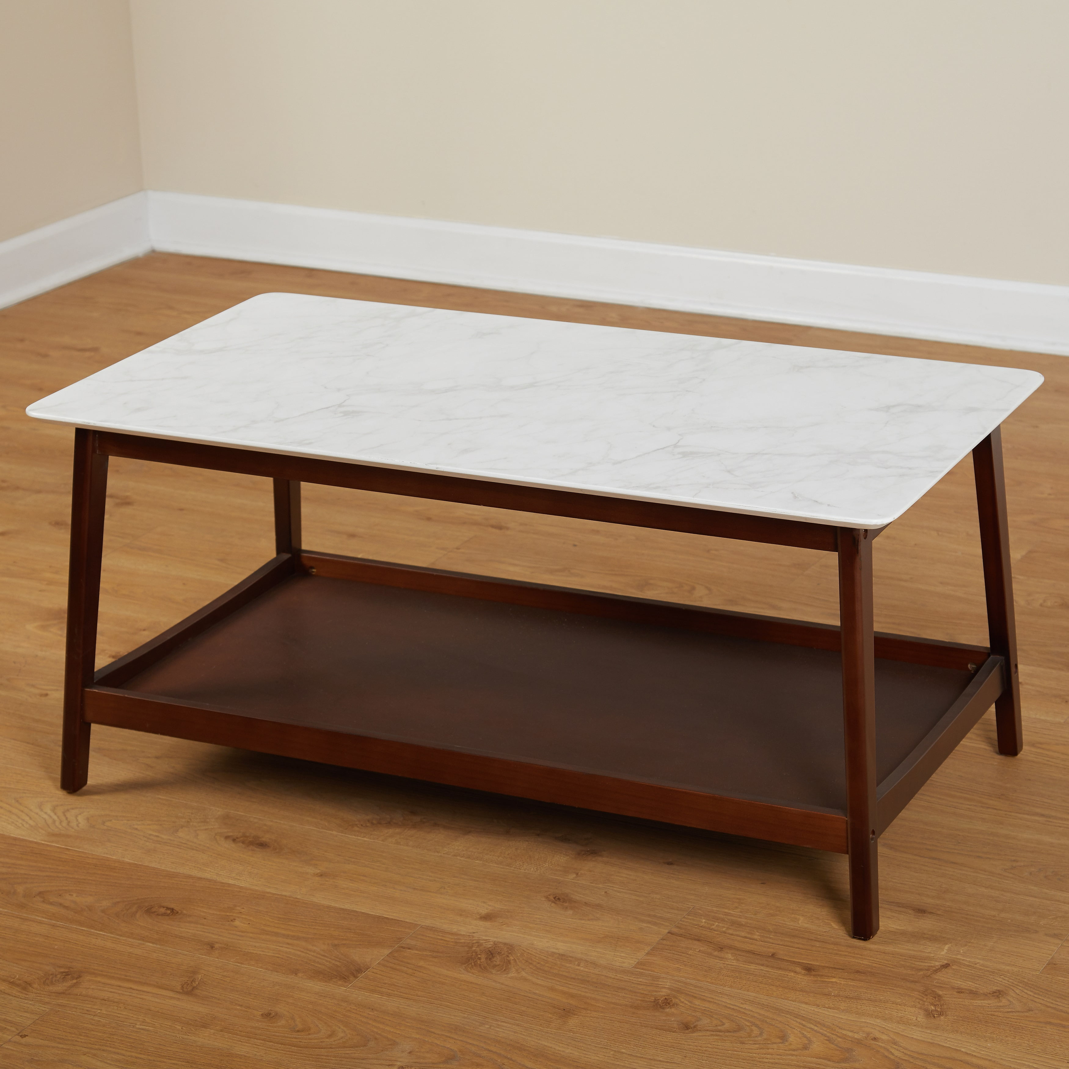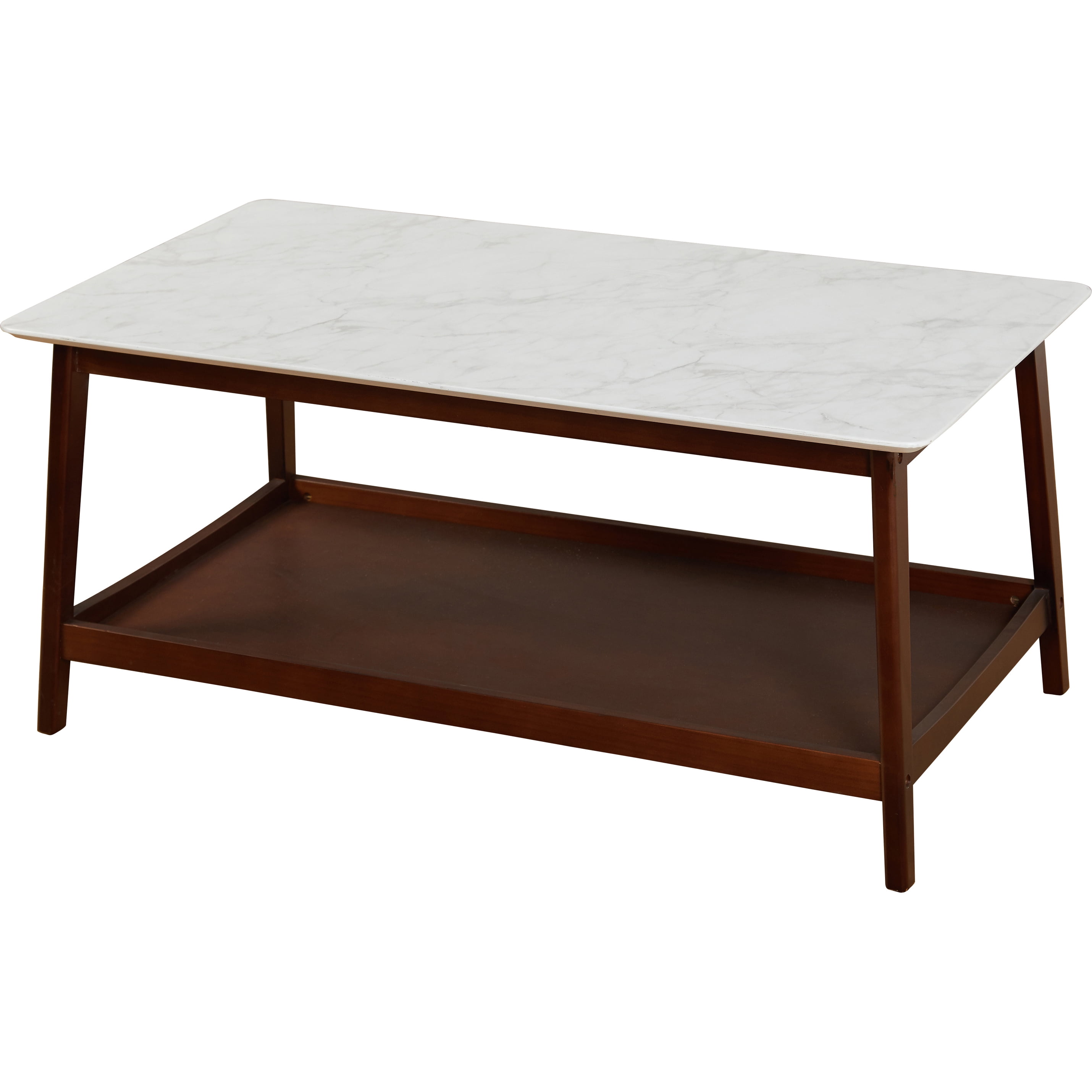 The Coffee Table adds a nice accent with an elegant touch to any living room or sitting area. Features a faux marble top with solid wood legs and bottom shelf in dark walnut finish.A large open shelf at the bottom not only adds to the design of the table but also to its functionality