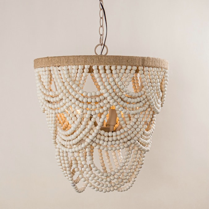 Dress your room with this unique take on the modern and classic chandelier. Crafted of iron and with natural wrapped details and cascading rows of white beads, this chandelier is sure to elements of texture and bohemian style to your space.
