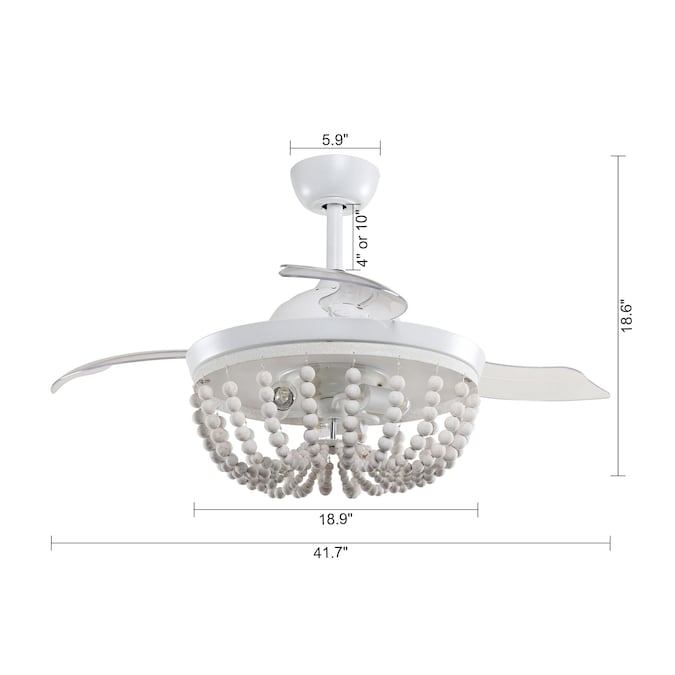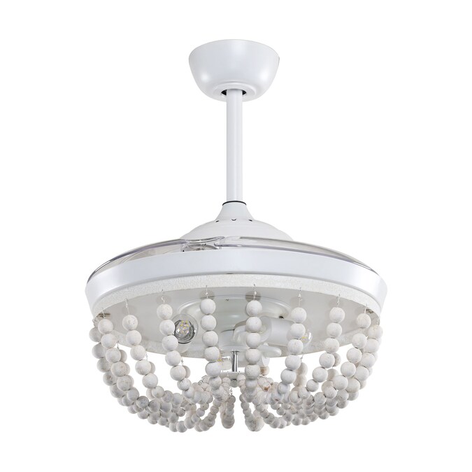 A fan for all seasons and styles, this white ceiling fan with light and remote control has a classic design that blends well with styles from modern industrial to rustic farmhouse. Its 3 blades retract when not in use, leaving only the large and attractive central light. This fan takes three lights for wonderful illumination surrounded by artful and interesting wood beads for a delightfully distinctive look. The remote control conveniently controls all of its settings and options,including a timer.