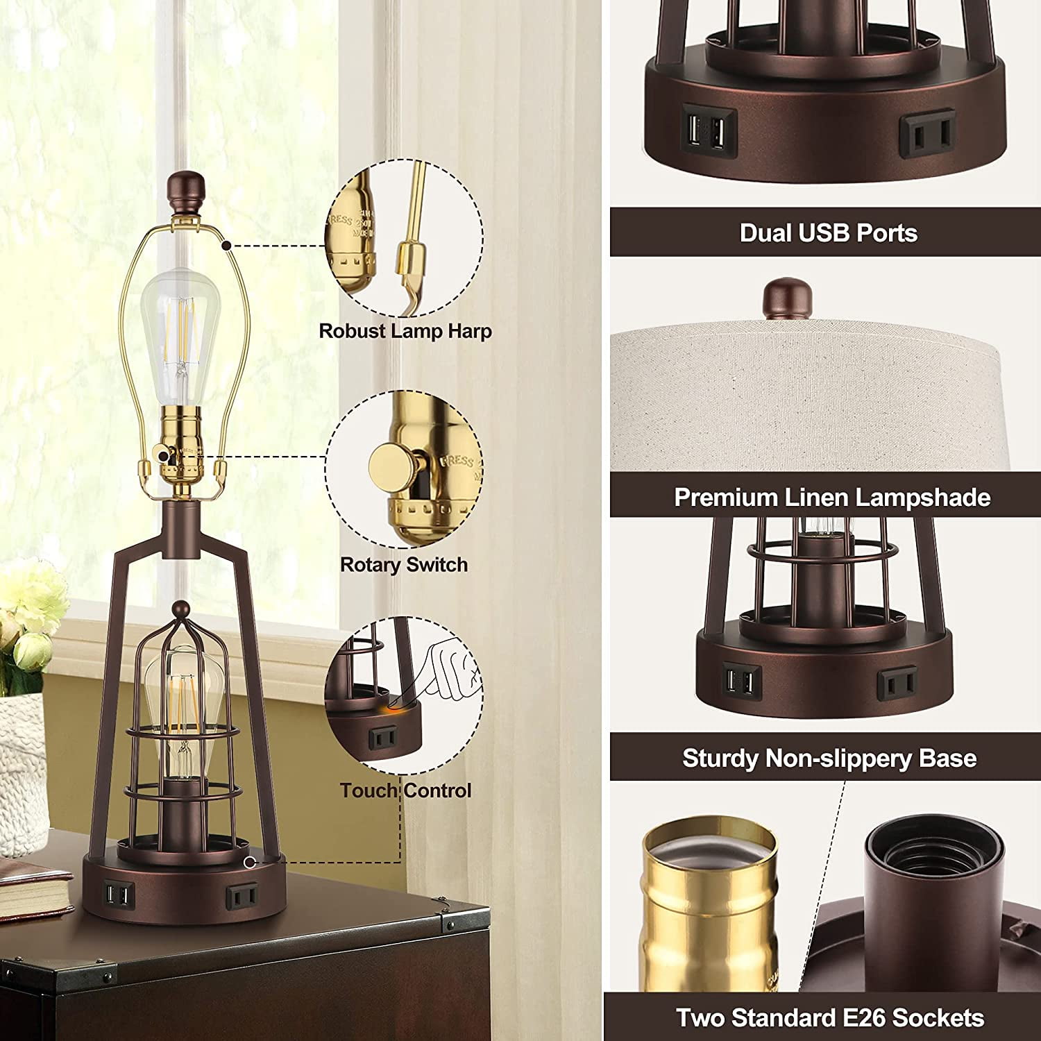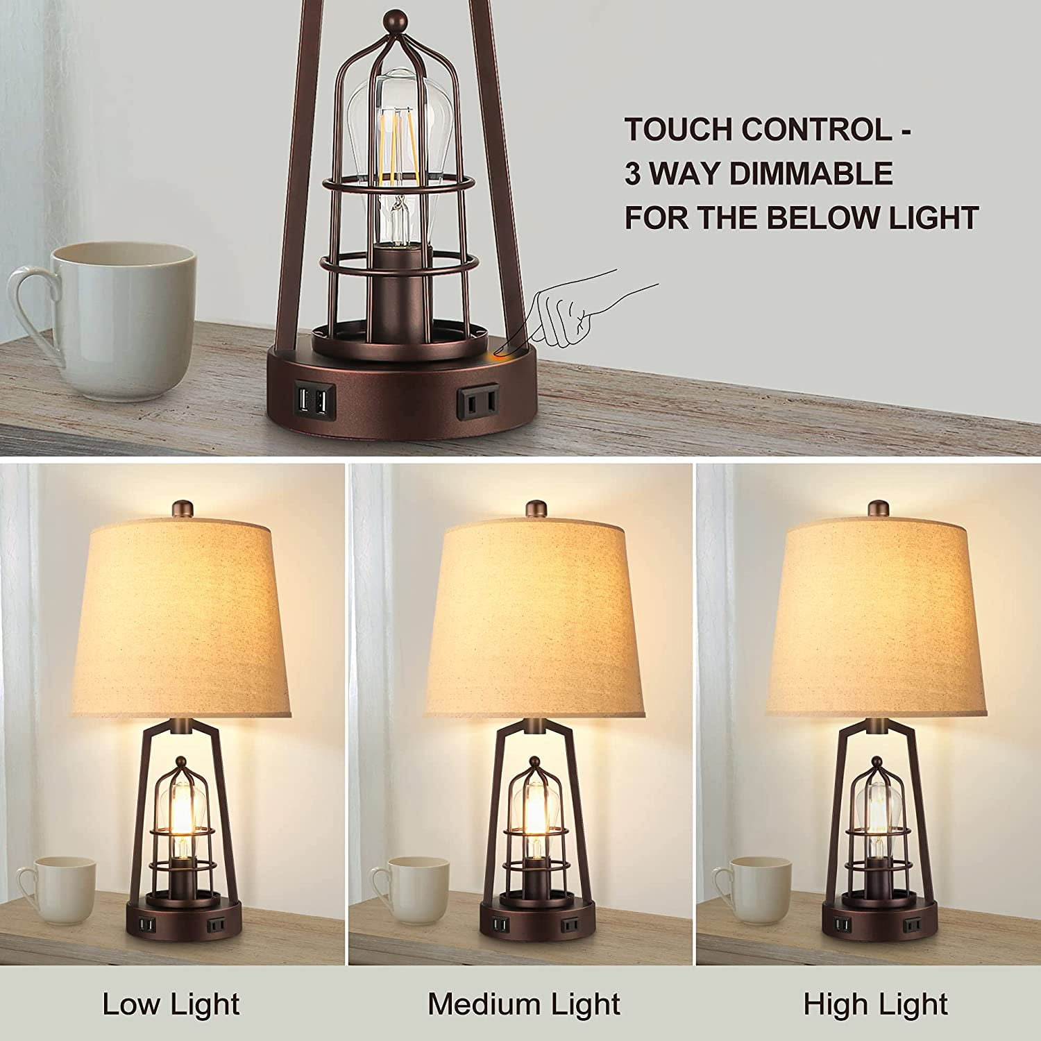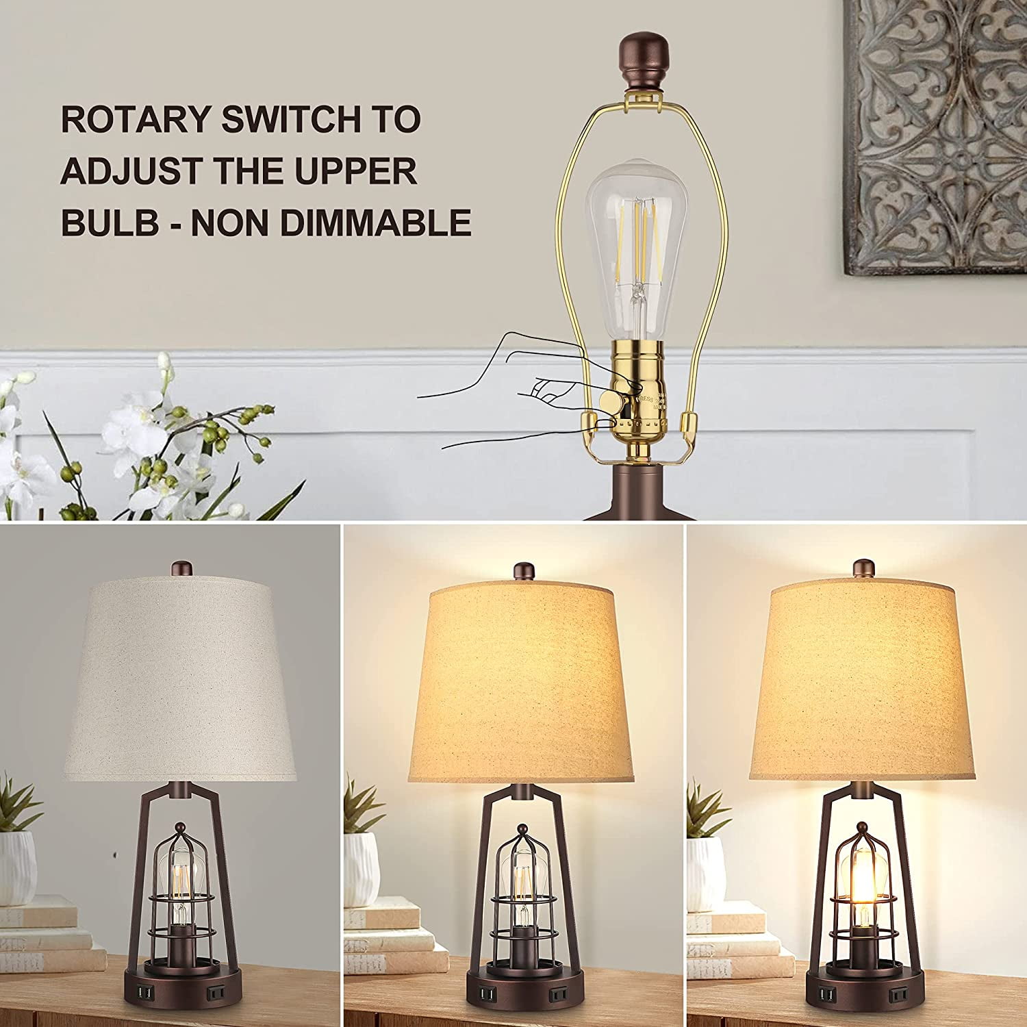 Farmhouse bedroom table lamp: The fabric lampshade of table lamps is matched with the brown industrial-style metal lamp stand, with a 2700k Edison warm light bulb, creating a unique farmhouse lamp that boasts both industrial and retro style. Compared with ordinary bedside lamps, our unique upper and below lighting can illuminate your space to a larger extent, bringing you a surprising lighting experience Innovative Two Switches: The upper and below lights are respectively controlled by the upper rotary switch and the light body touch, providing you with a variety of lighting options. According to your needs, the 3 modes you can choose are to turn on only the upper light, the lower light, or both lights. Placed in the study, the bright light is quite convenient for your reading, and the soft light through the fabric shade allows you to read without fatigue 2 USB fast charging AC outlet: Designed on this bedroom table lamp are extremely practical. You can easily charge 3 devices meanwhile, which is convenient for you to use a mobile phone, tablet, laptop, kindle reader, or other electronic devices while lying on the bed or sofa. What’s more surprising is that the USB ports can work normally no matter if the light is on or off Four st58 LED bulbs included: Four free st58 LED bulbs as a bonus in the package to enhance your shopping experience, which saves the trouble of purchasing additional compatible bulbs! The bulbs emit 2700k 800 lumens of warm light, consume only 6w, and provide the brightness equivalent to 60w incandescent, which are environmentally friendly and greatly save electricity bills. What’s most important is that the bulb has no flicker, no dizziness, and matches with the elegant fabric lamp shade making the glow softer to protect your eyes efficiently Sturdy premium construction – The nightstand lamp set of 2 is made of high-quality alloy coated with a layer of baking paint, elegant, and beautiful but also anti-rust. The rotary switch and harp are made of durable metal. We also add a load-bearing block to the base inside to enhance the stability of the touch lamp base without shaking or slipper. This farmhouse table lamp’s brown tones and elegant frame make the rustic lamp suitable for a bedroom, office, foyer, family room, or living room