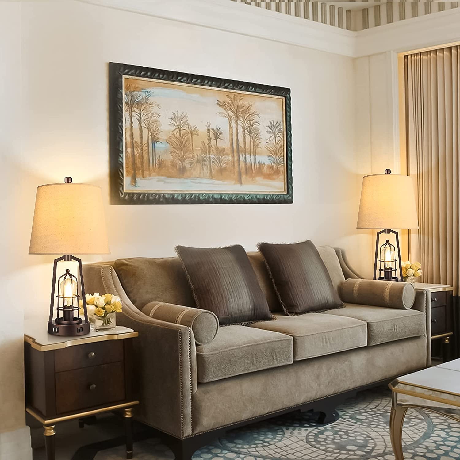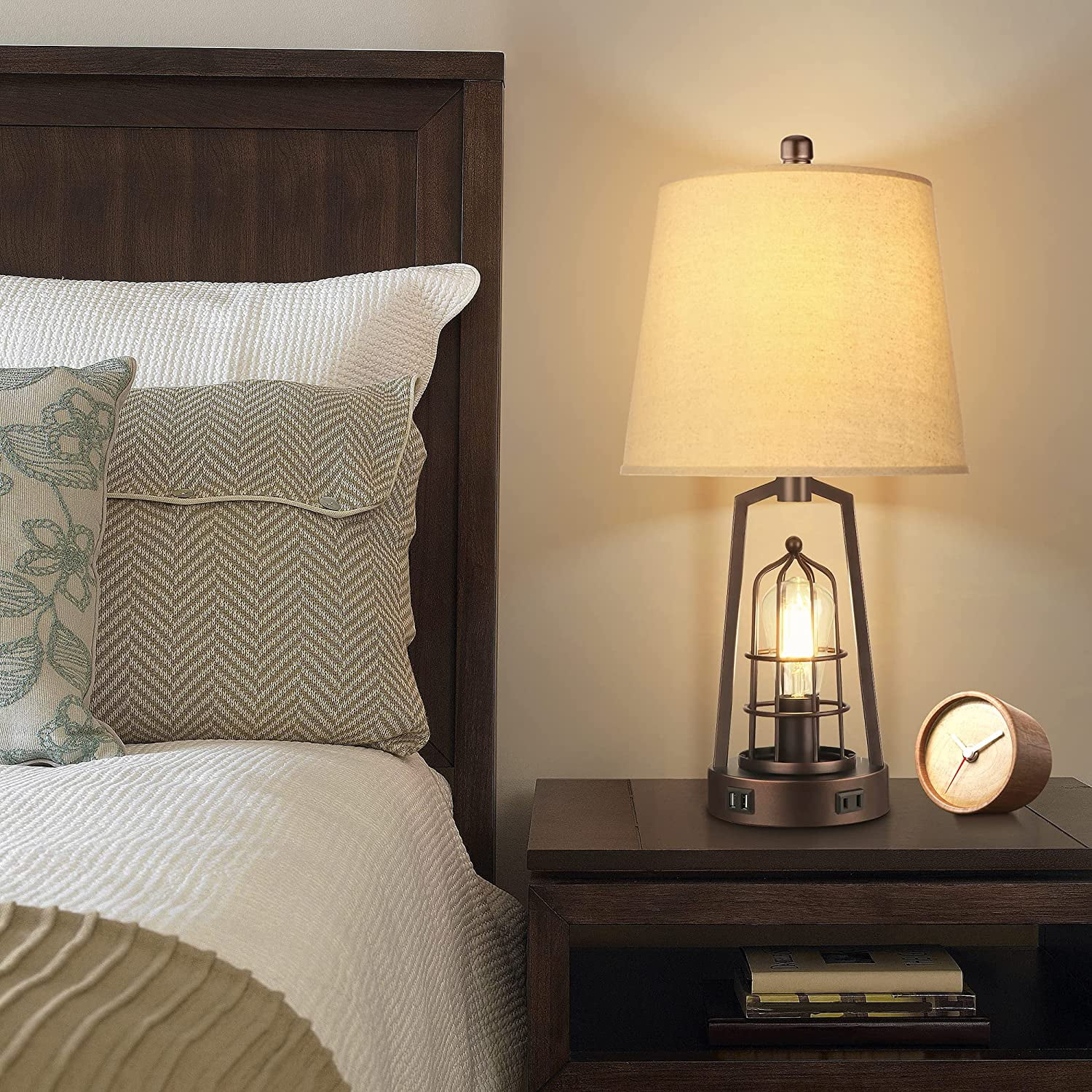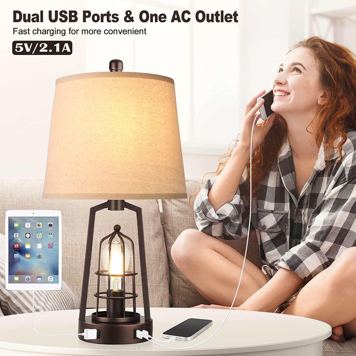 Farmhouse bedroom table lamp: The fabric lampshade of table lamps is matched with the brown industrial-style metal lamp stand, with a 2700k Edison warm light bulb, creating a unique farmhouse lamp that boasts both industrial and retro style. Compared with ordinary bedside lamps, our unique upper and below lighting can illuminate your space to a larger extent, bringing you a surprising lighting experience Innovative Two Switches: The upper and below lights are respectively controlled by the upper rotary switch and the light body touch, providing you with a variety of lighting options. According to your needs, the 3 modes you can choose are to turn on only the upper light, the lower light, or both lights. Placed in the study, the bright light is quite convenient for your reading, and the soft light through the fabric shade allows you to read without fatigue 2 USB fast charging AC outlet: Designed on this bedroom table lamp are extremely practical. You can easily charge 3 devices meanwhile, which is convenient for you to use a mobile phone, tablet, laptop, kindle reader, or other electronic devices while lying on the bed or sofa. What’s more surprising is that the USB ports can work normally no matter if the light is on or off Four st58 LED bulbs included: Four free st58 LED bulbs as a bonus in the package to enhance your shopping experience, which saves the trouble of purchasing additional compatible bulbs! The bulbs emit 2700k 800 lumens of warm light, consume only 6w, and provide the brightness equivalent to 60w incandescent, which are environmentally friendly and greatly save electricity bills. What’s most important is that the bulb has no flicker, no dizziness, and matches with the elegant fabric lamp shade making the glow softer to protect your eyes efficiently Sturdy premium construction – The nightstand lamp set of 2 is made of high-quality alloy coated with a layer of baking paint, elegant, and beautiful but also anti-rust. The rotary switch and harp are made of durable metal. We also add a load-bearing block to the base inside to enhance the stability of the touch lamp base without shaking or slipper. This farmhouse table lamp’s brown tones and elegant frame make the rustic lamp suitable for a bedroom, office, foyer, family room, or living room