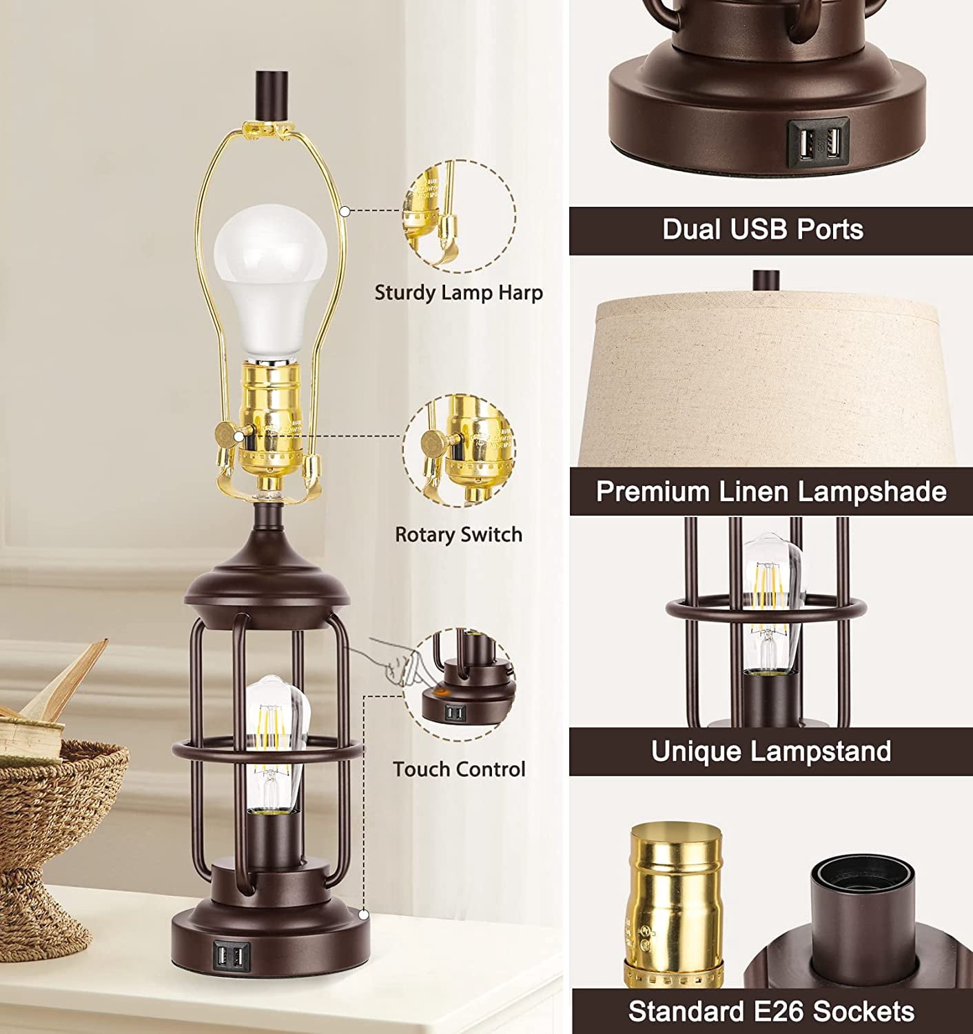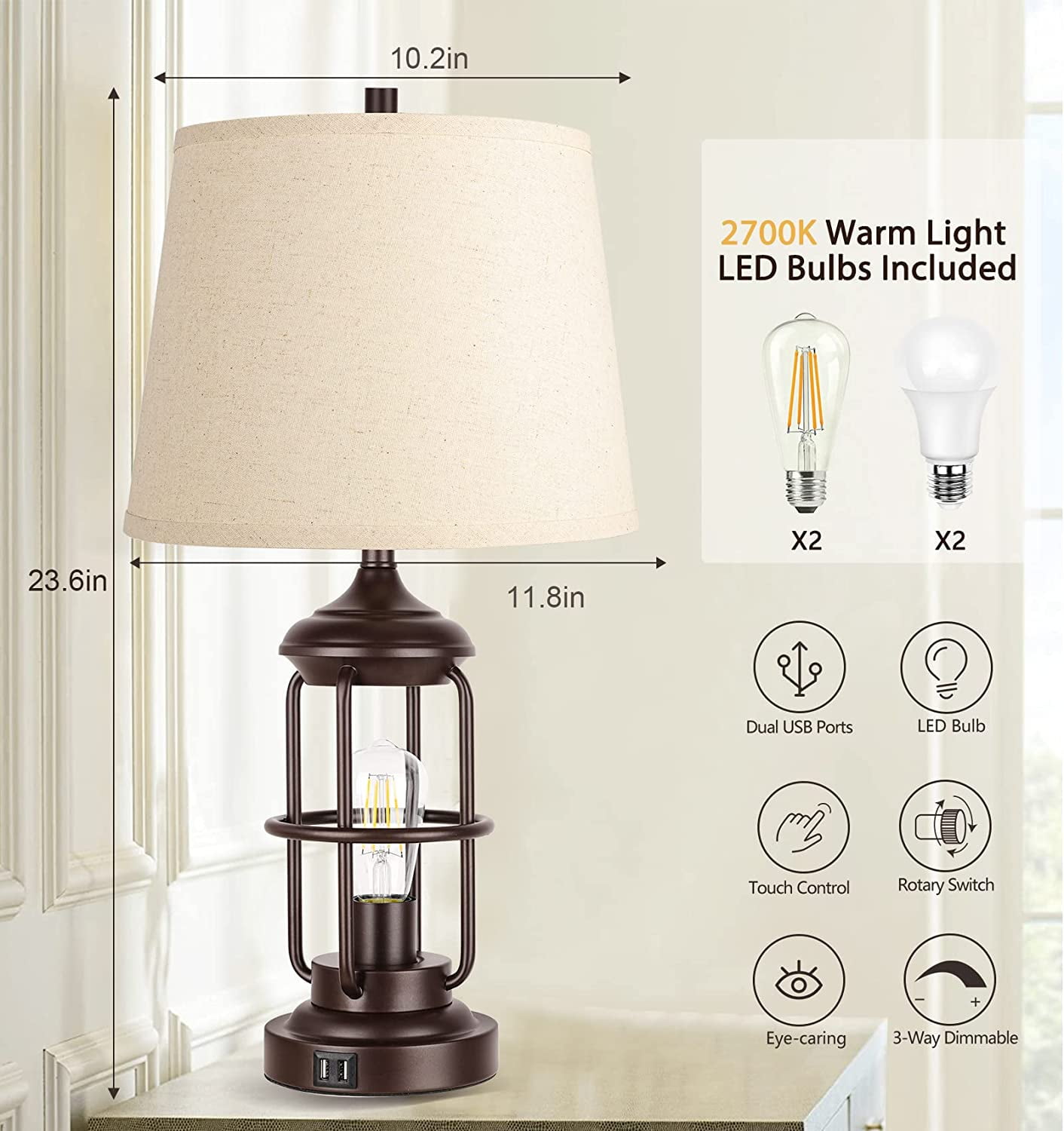 Features: Rustic Industrial 2-light Design: A bedroom light set of 2 with 2-night lights gives you more lighting options. The 2-piece bedroom table lamp set’s fabric lampshade is paired with a brown industrial-style metal lamp frame and 2700K warm light to create a unique farmhouse lamp with both industrial and retro styles. The metal pillars and layered design on the lamp stand allow the night light’s light to be seen, adding an antique retro atmosphere to your home Noiseless Touch Control Rotary Switch: Just tap any metal part of the lamp base to turn the touch light on and off or adjust the bottom night light (low/medium/high). Turn the rotary switch clockwise to control the top bulb. It is also possible to turn on 2 lights independently at the same time to illuminate your family when you gather together. Or just turn on the top bulb to accompany your baby to sleep, or just turn on the bottom bulb to light up the space for you to read Built-in 5V 2.1A Dual USB Ports: The lamp base of each living room table lamp is designed with 2 USB ports for charging your electronic devices, saving you the energy and time of looking for other ports, and keeping the side table tidy. Whether the lights in your living room are on or off, you can charge your electronic devices when the country lamp is powered on Warm Light LED Bulbs For Eye Protection: 4 ultra-energy-saving 2700K LED bulbs – 2 a19 bulbs for the top light and 2 st58 bulbs for the bottom light, which greatly saves your electricity bill. No flicker, no dizziness, with elegant fabric lampshade, softer light, and effective eye protection Well-made and Sturdy Structure: The bedside table lamp set of 2 is made of high-quality alloy and coated with a layer of baking paint, which is elegant, beautiful, and rustproof. The rotary switch and harp are made of durable metal. We also added a load-bearing block inside the base to enhance the stability of the touch light base and prevent it from shaking or slipping. This farmhouse table lamp’s brown hue and elegant frame make a rustic lamp perfect for a bedroom, office, foyer, family room, or living room