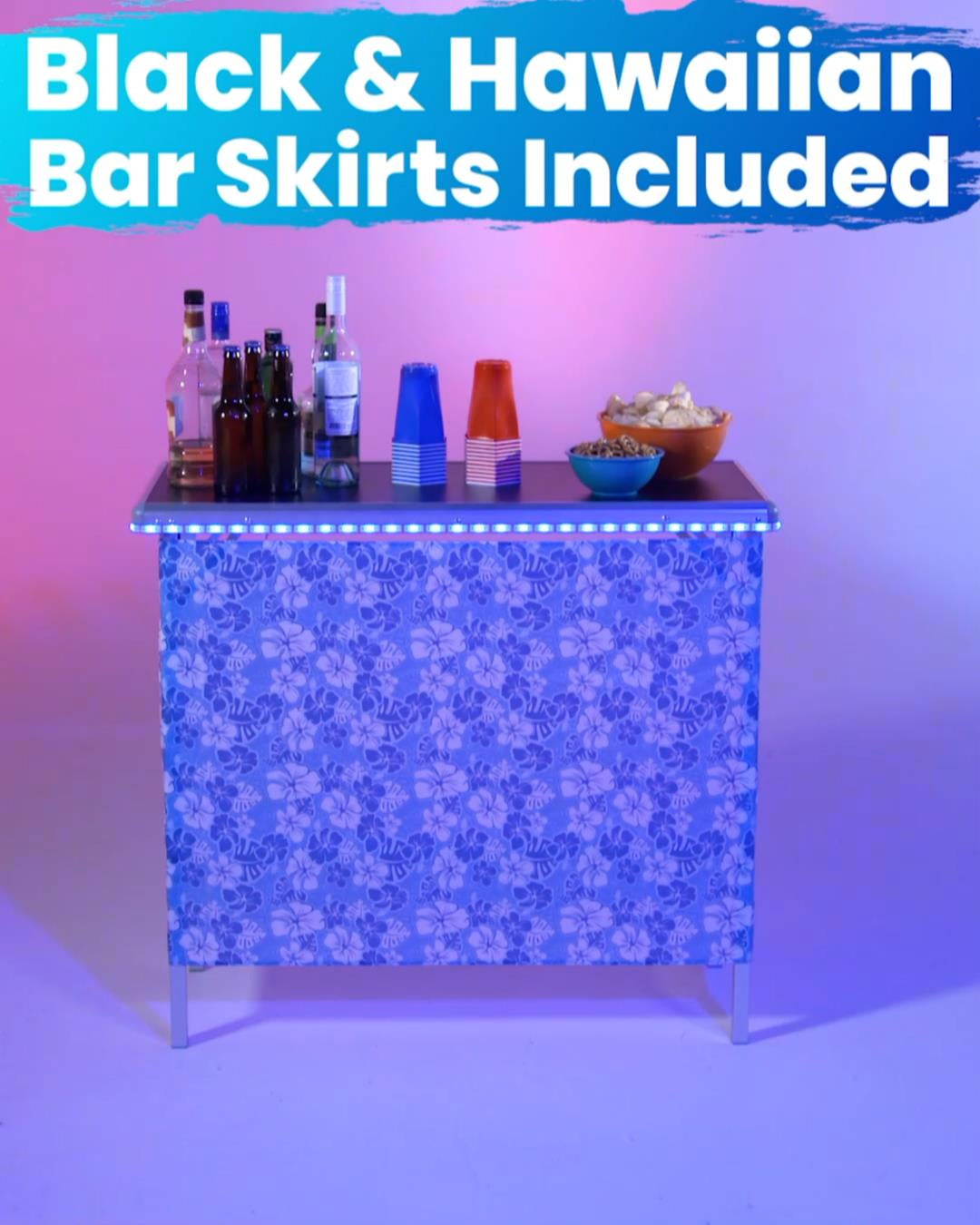 The Party Bar Portable Bar is a must-have at any tailgate party or event where drinks are to be enjoyed. The folding LED Party Bar is super portable, lightweight, rigid, and completely functional. The bar sets up quickly and with ease. The thick, heavy duty bar shelf rests on top of each leg brace creating additional stability and storage space for cups, ice, garnishes, etc. It’s best to put heavier items on the ground under the shelf. Attach the front/side skirt that fits your party atmosphere. Attach the black skirt for a formal/neutral event or bring the tropics to your party at any location with the Hawaiian bar skirt. The Portable Party Bar comes with a nylon carrying case with shoulder straps for convenient portability and also keeps your Party Bar protected while in storage. The color-changing LED glow lights add an awesome lighting effect to your portable Party Bar. Easily visible in daylight and extra bright in the dark, these battery-powered LED glow lights put the ‘Party’ in Party Bar!
