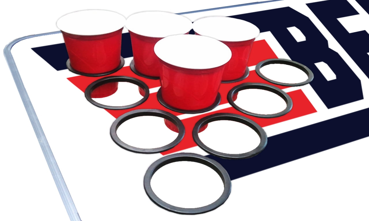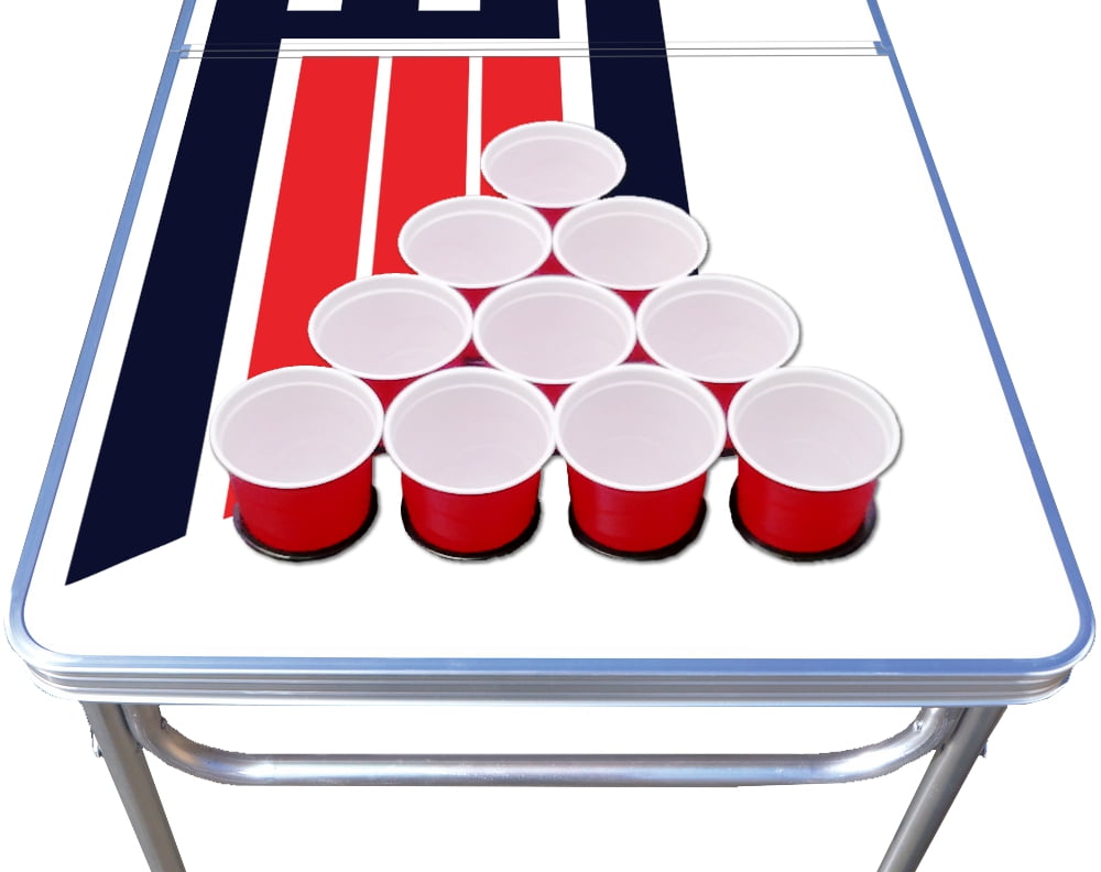 Party Pong Professional Beer Pong Table with Cup Holes, Blue, 6-Count Features actual holes to keep game cups from sliding and spilling Wax finish deflects liquids and protects the table Easily folds into a carrying case with latch and handles Includes attached pong ball holder with (6) party pong balls