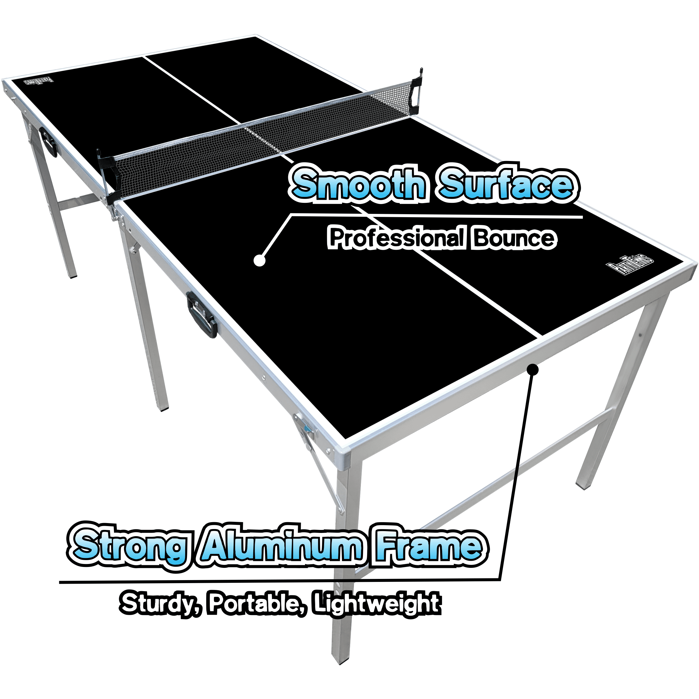The PartyLife Mid Size 6 ft x 3 ft Folding Portable Table Tennis Ping Pong Table & Game Set is the Ultimate 3′ x 6′ Table Tennis Table and your ticket to hours of thrilling gameplay! Are you ready to elevate your table tennis experience to the next level? Look no further than our brand-new 3′ x 6′ Table Tennis Table, designed with precision and passion to deliver unbeatable fun and excitement for players of all skill levels. Don’t be fooled by the smaller, space-saving size! This table plays just as well as a full size table. In fact, the kids especially love this size! The PartyTennis table tennis table features superior build quality, crafted with the best materials. PartyTennis tables ensure durability and stability, allowing for intense rallies and fast-paced matches. The high-quality playing surface guarantees consistent ball bounce. These tables are designed for both indoor and outdoor use. UV-resistant materials ensure that it can withstand the elements and provide years of enjoyment. The 3′ x 6′ dimensions provide ample space for intense competition while maintaining a compact footprint. When the game is over, our table easily folds up for convenient storage. It’s perfect for small spaces or for those who want to keep their table protected from the elements when not in use. No assembly required! We’ve included everything you need to get started: a net, paddles, and pong balls. Please select the table model that aligns with your desired table options before adding to your cart.