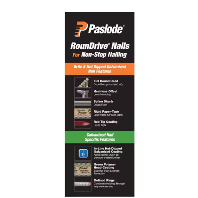 For ultimate tool performance, use only genuine Paslode® 30º framing nails. Strips won’t break, even in rainy weather. Paper tape collation means no flying debris. Paslode’s Hot Dipped Galvanized Plus nails offer premium corrosion in all pressure treated lumber such as ACQ and MCQ.