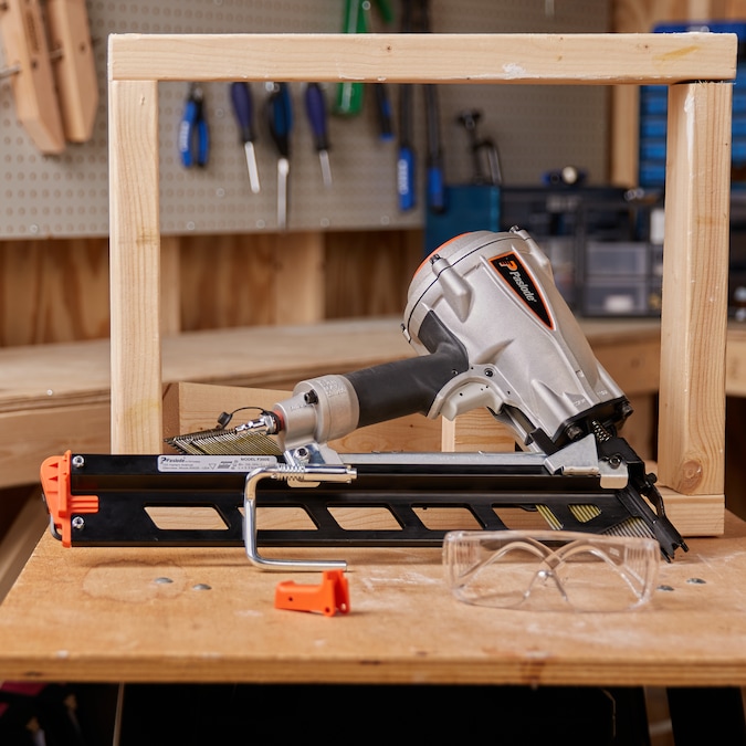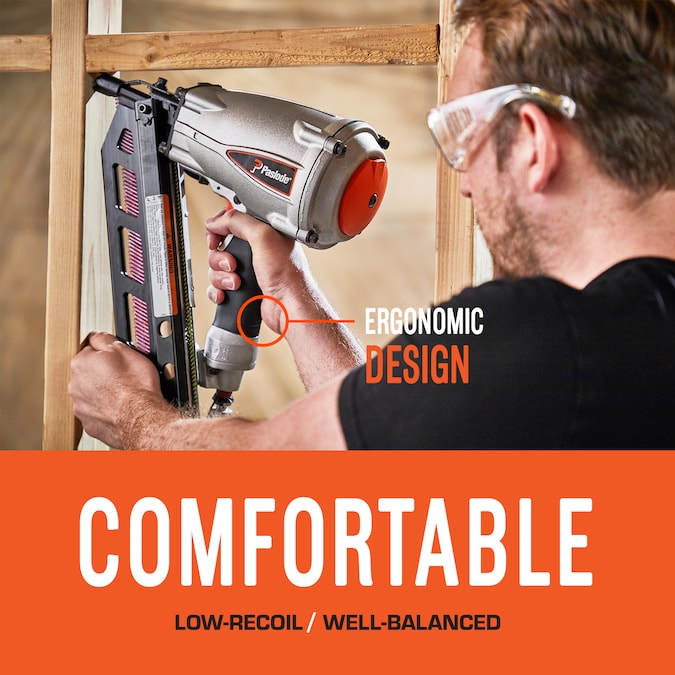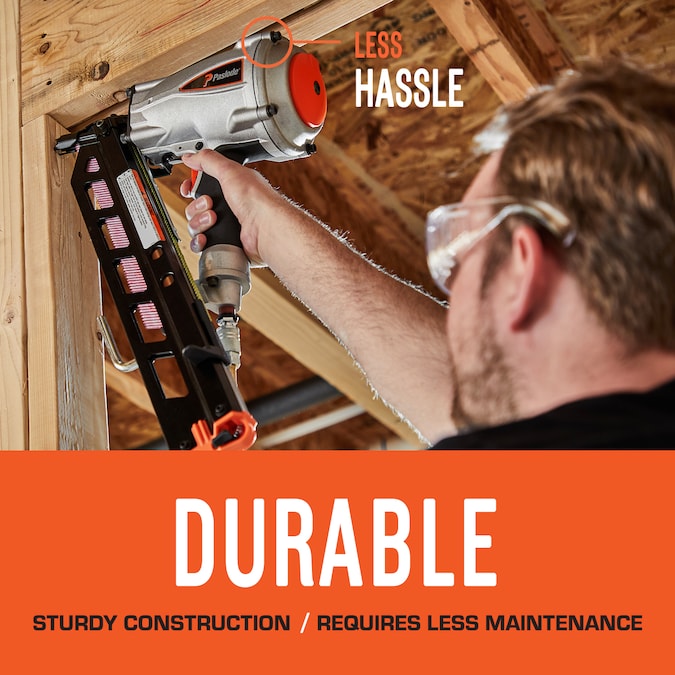 With the Paslode PowerMaster Plus framing nailer system, you’ll have the job done in no time. Heavy-duty jobs require a heavy-duty nailer with a powerful performance in a lightweight design. That’s why the pros turn to the proven performance, durability and driving power only a Paslode pneumatic framing nailer can provide. This low-recoil nailer offers a center of gravity close to the trigger for great balance and less arm fatigue. When used with Paslode framing nails, this nailing system’s heavy duty power can help you frame walls faster to bring jobs in on time, every time.