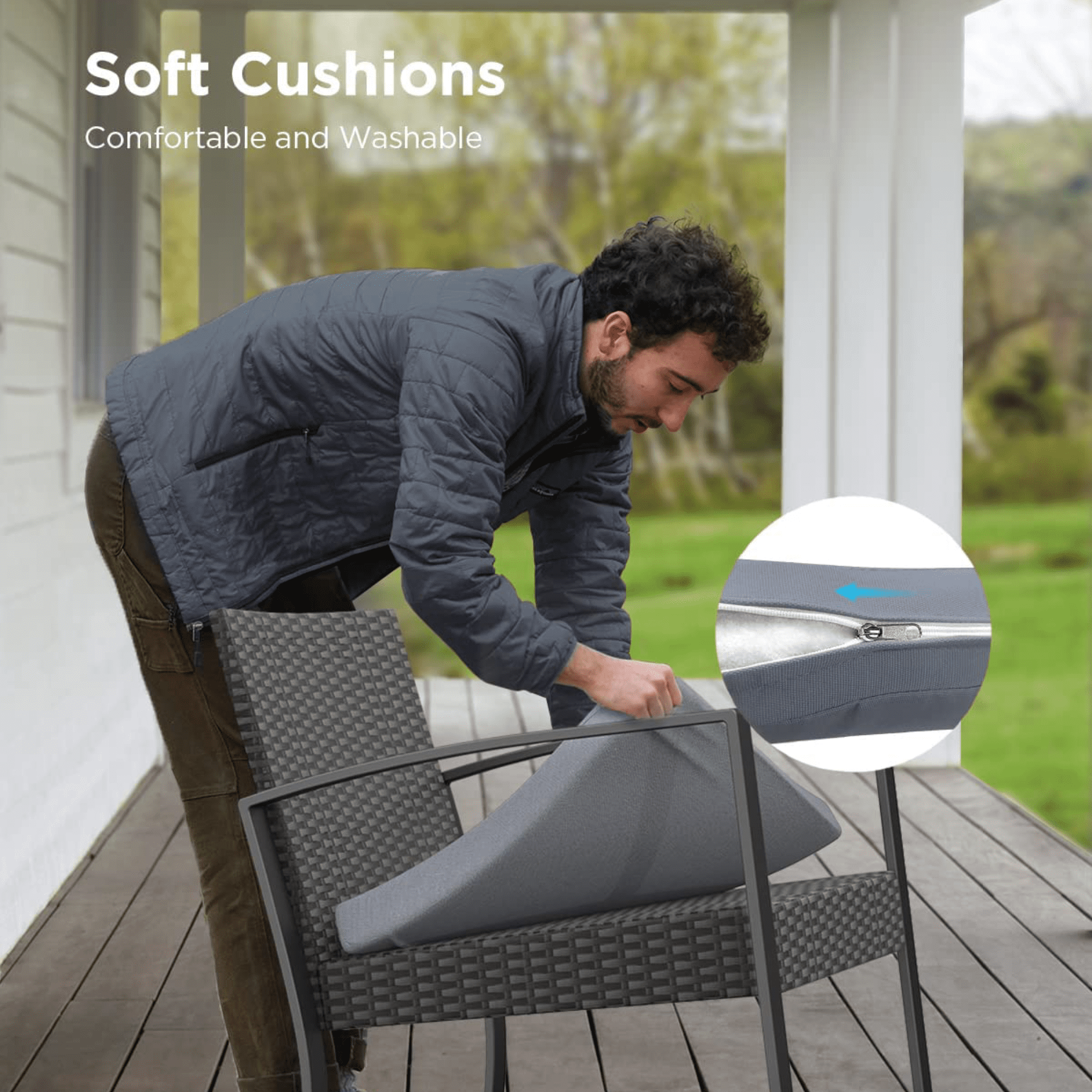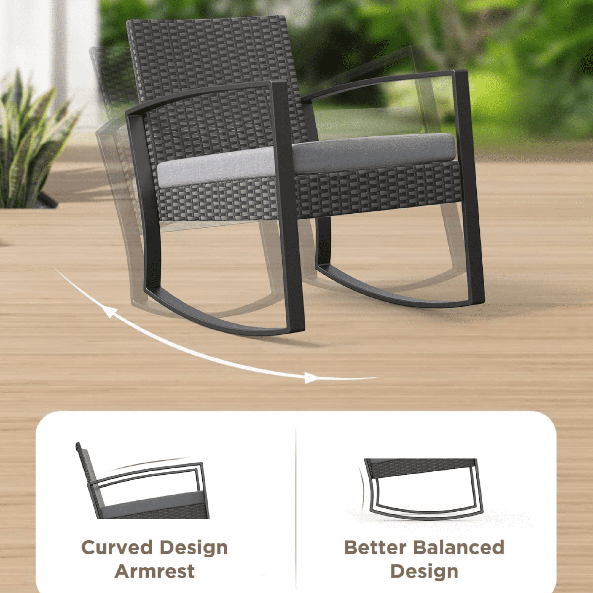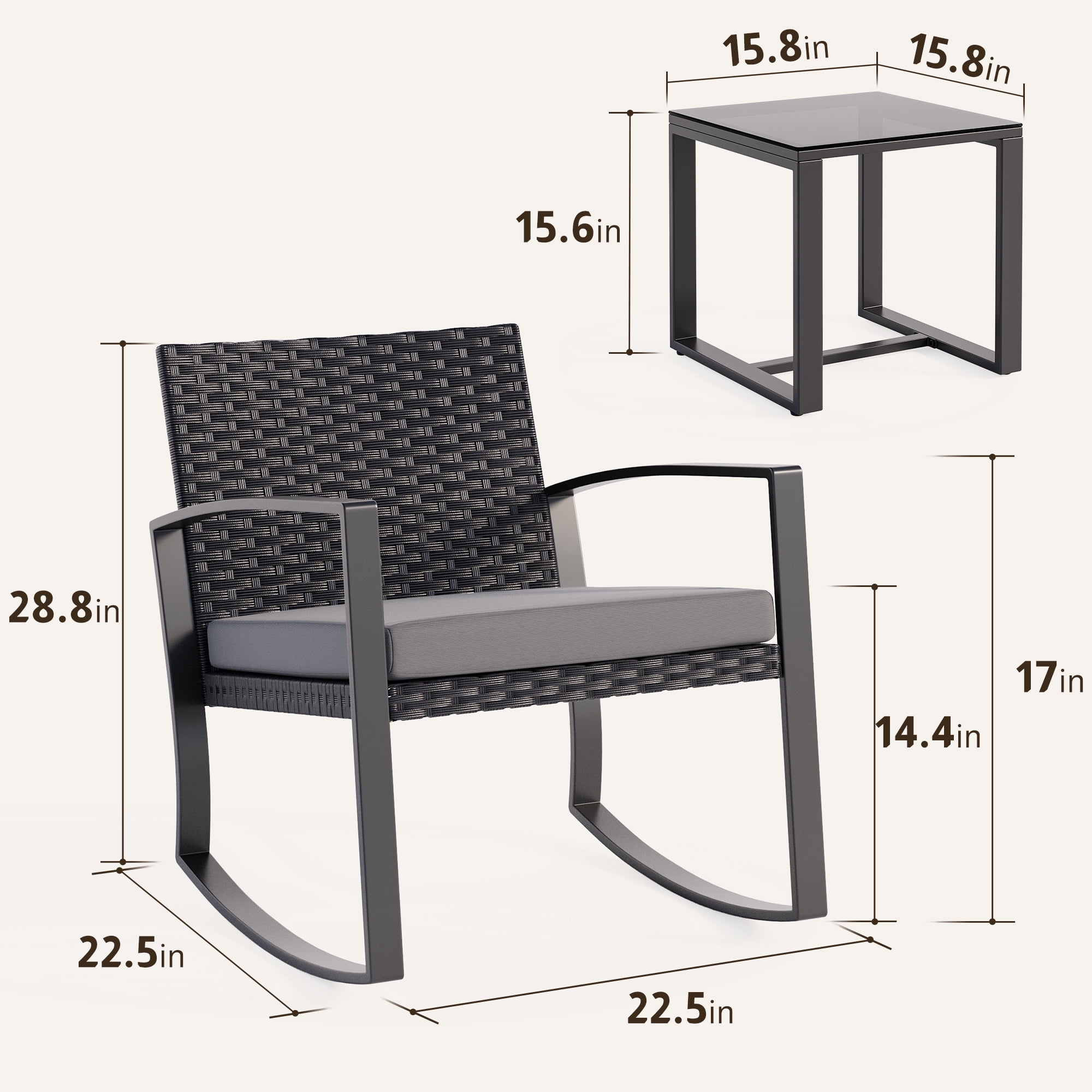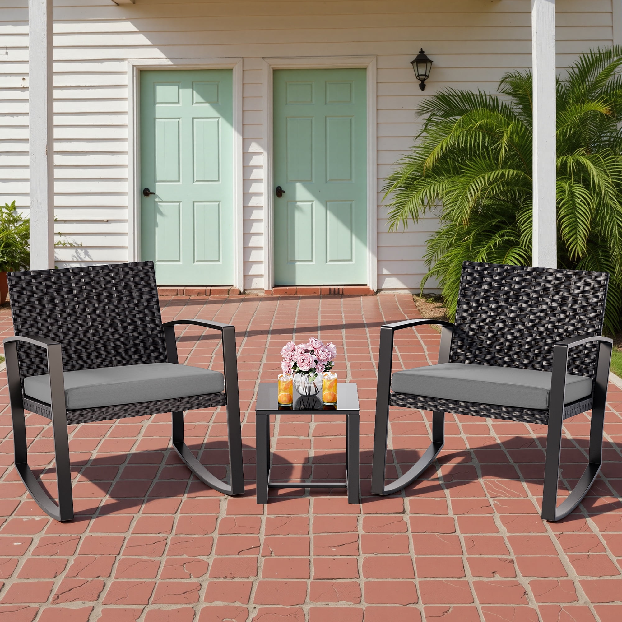 Patio Furniture Set, Lofka 3 Pieces Outdoor Porch Furniture Set with Rocking Chairs and Glass Table for Balcony & Garden, Gray Cushion