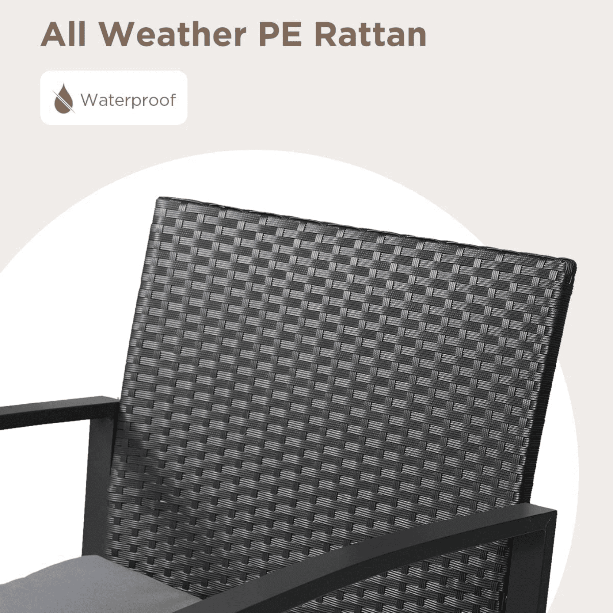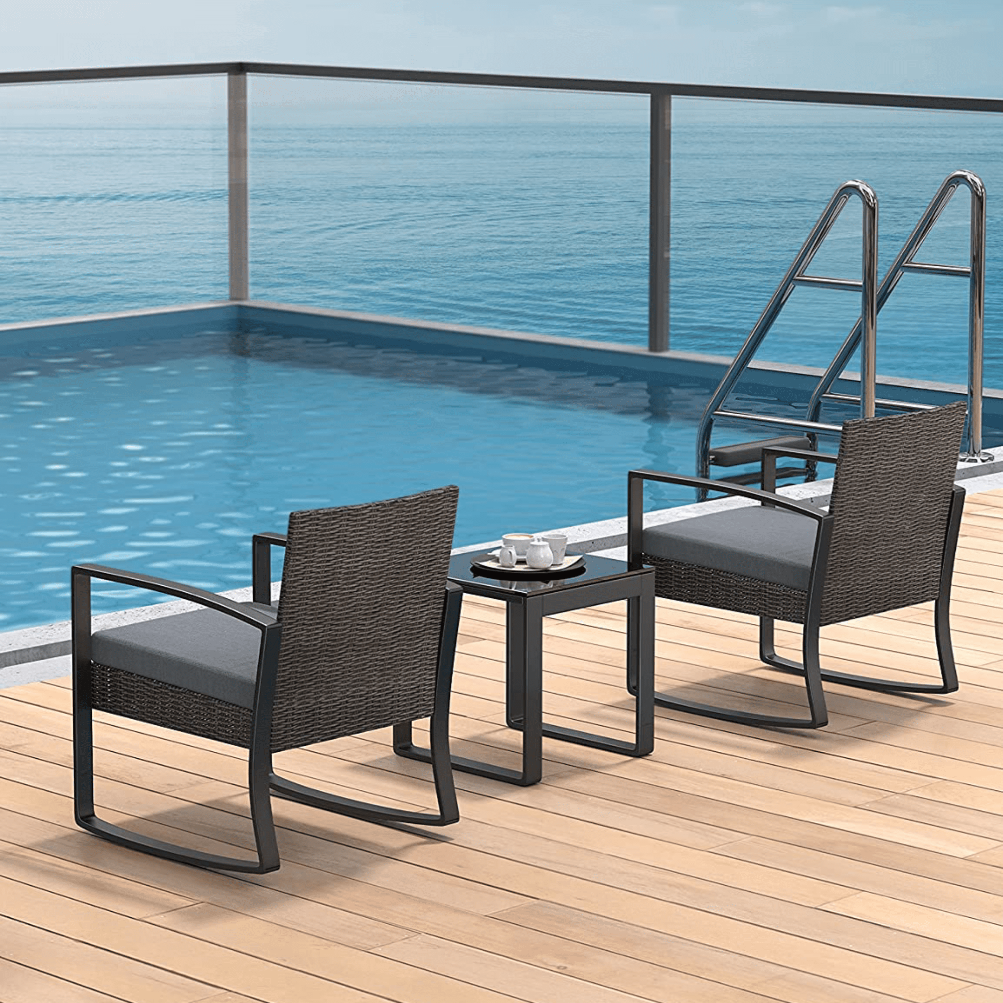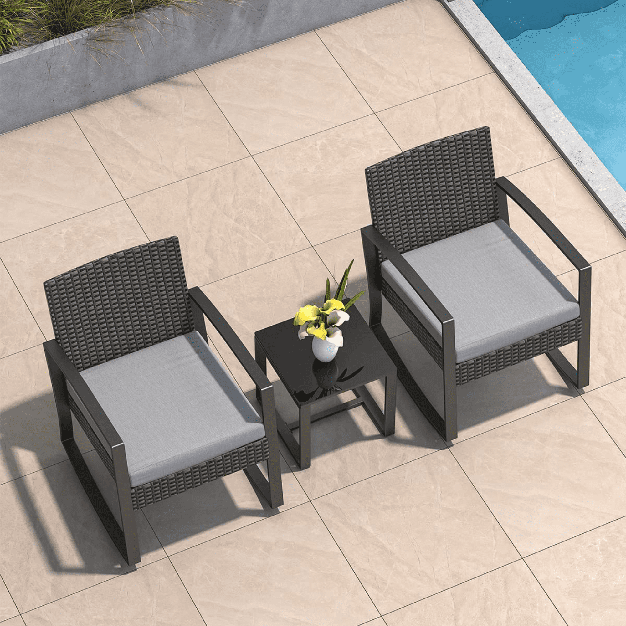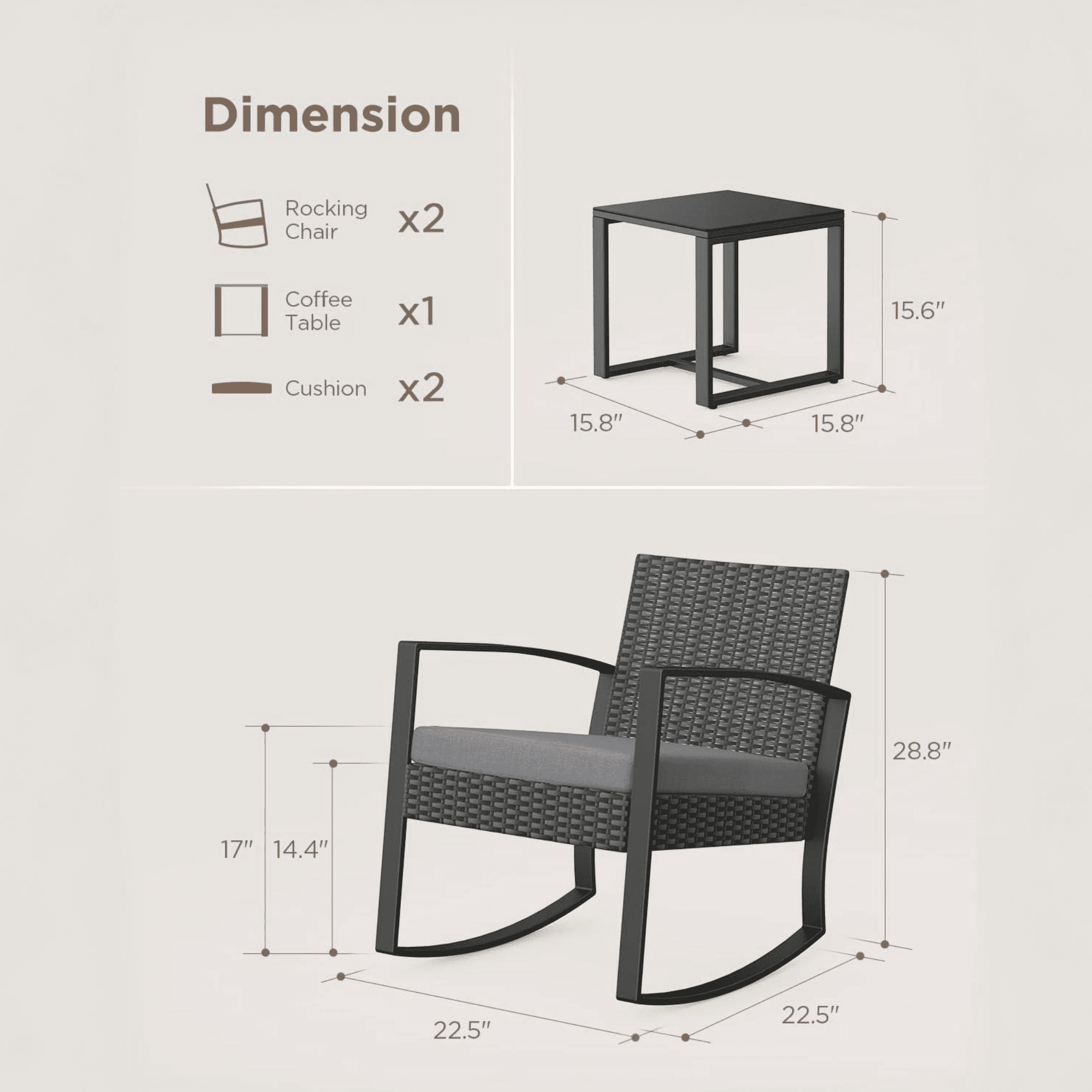 Transform Your Patio, Transform Your Life! Key Features Durable PE Rattan Construction: Crafted from high-quality PE rattan, this patio set is engineered to endure various weather conditions, delivering years of delightful outdoor relaxation. Sturdy Frame: Designed with a robust frame that ensures stability and security, allowing you to enjoy peace of mind during your outdoor gatherings. Comfortable Cushioning: Each chair is equipped with breathable fabric and plush sponge cushioning, providing exceptional comfort for extended lounging sessions with family and friends. Tempered Glass Coffee Table: The patio rocking chairs set includes a stylish coffee table made with tempered glass, offering easy maintenance and resistance to water, making it perfect for outdoor use. Easy Assembly: Enjoy a hassle-free setup with our straightforward assembly process, allowing you to get your new patio set ready for enjoyment in no time at all! UV-Resistant Material: Both the PE rattan and tempered glass are designed to resist the damaging effects of UV rays, ensuring that your patio set retains its beauty and functionality for years. Specifications Rocking Chairs Dimension: 33.8″ (L) x 22.5″ (W) x 22.5″ (H) Coffee Table Dimension: 16″ x 16″ x 16″ (L x W x H) Weight Capacity of Rocking Chairs: 280 lbs each Weight Capacity of Coffee Table: 125 lbs Material: PE rattan, Tempered Glass, and Metal Color: Gray Cushion Transportation Information Shipping Details: We’re excited to ship your order! We’ll arrange for shipping on the same day or the next day after you place your order (only on business days). Address Changes: We ship quickly, so please double-check your address after placing your order. If you need to make changes, just send us the correct address, and we’ll sort it out for you.