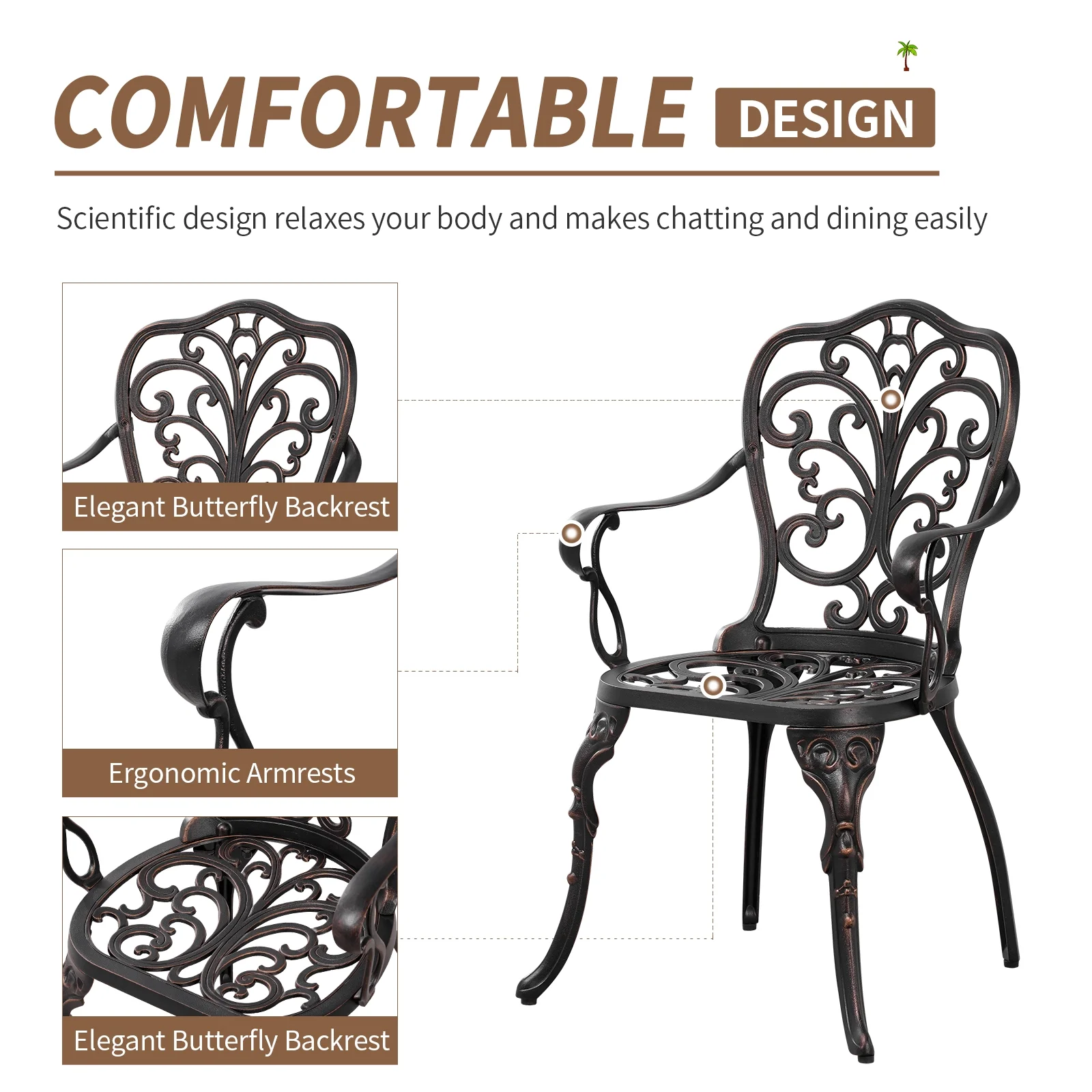 Durable Cast Aluminum Bistro Set: 3 piece bistro set outdoor is made of durable cast aluminum material. It is very solid, durable, light and easy to move. It is very suitable for family dinner and a beautiful landscape of your garden 3 Piece Patio Table and Chairs Size :Patio table size:Φ24″ x H26″ , patio chair size: D20″ x W20.5″ x H35″,bistro table maximum bearing capacity: 90kg/200lbs, Bistro Chair maximum bearing capacity: 179kg/396lbs All Weather Outdoor Bistro Set :The small outdoor table and chairs have a rust proof coating on the surface, which can be used all day without fading and aging. It is an ideal choice for the front porch, balcony and deck. With 1.97 inch umbrella hole, it can put a patio umbrella (not included) for sun shading and rain Ergonomically Designed Bistro SetThe back and seat of the patio bistro sets are hollow, which can promote air circulation and prevent heat and moisture accumulation. Handrails are designed according to ergonomics to reduce muscle tension; The tavern set is equipped with an adjustable leveling device on each foot to adapt to uneven ground, which will not easily cause shake or tilt problems and generate noise Widely Applicable and Easy to Assemble:This 3 piece bistro table set cast aluminum suits is applicable to any space of porch porch, front court, garden pool, terrace, courtyard, backyard, deck or balcony; It is very easy to assemble with detailed assembly manual and complete accessories. If you have any questions, 24-hour customer service will serve you
