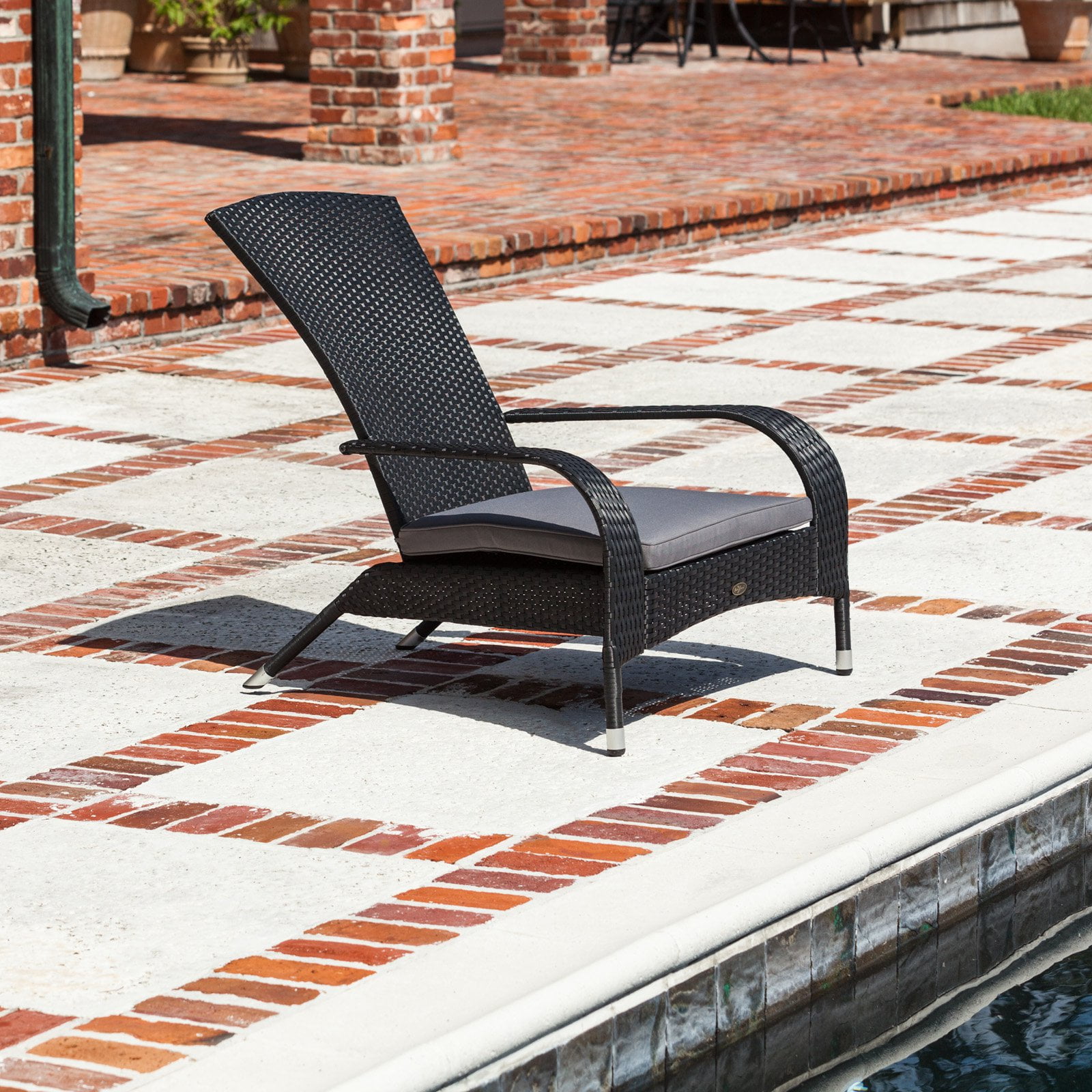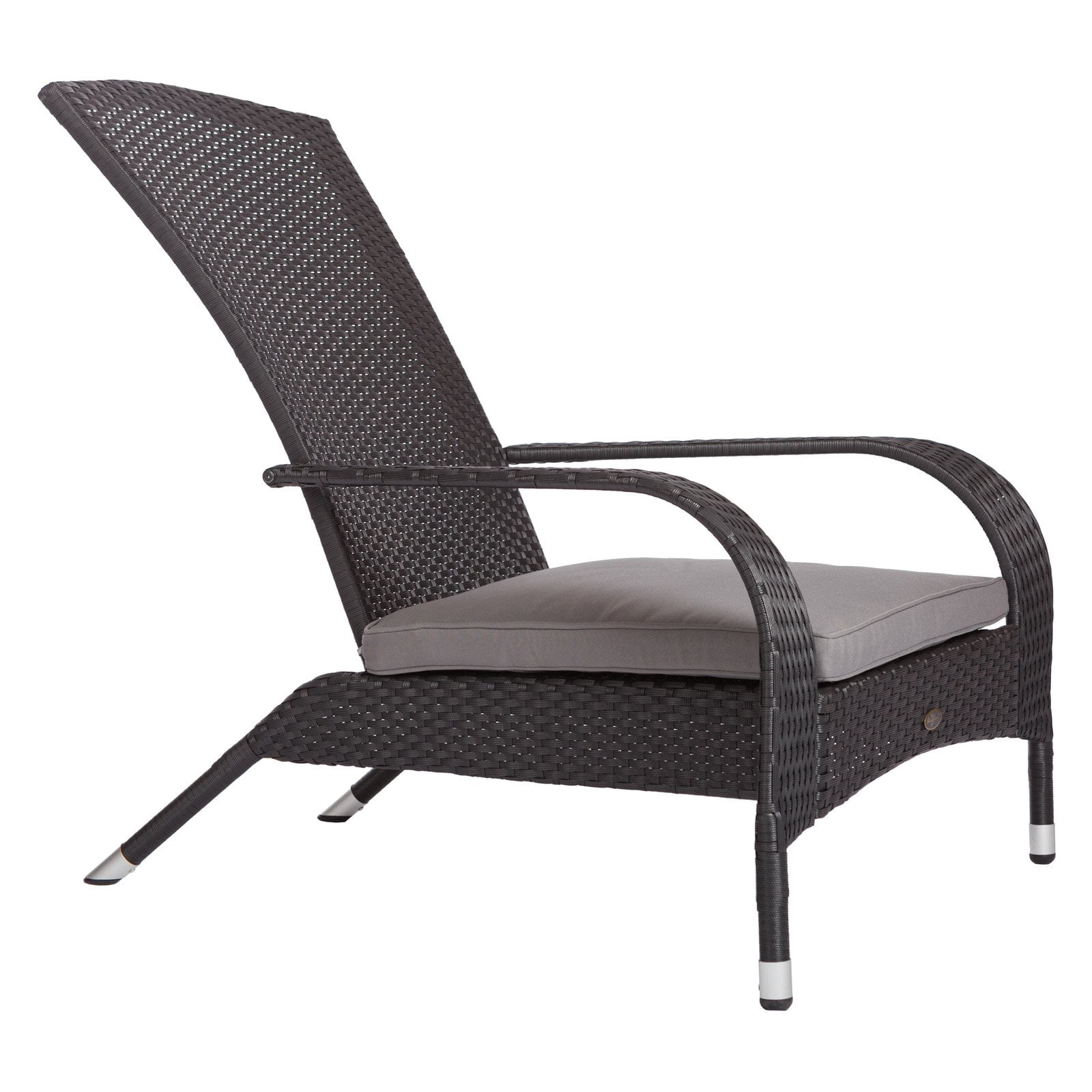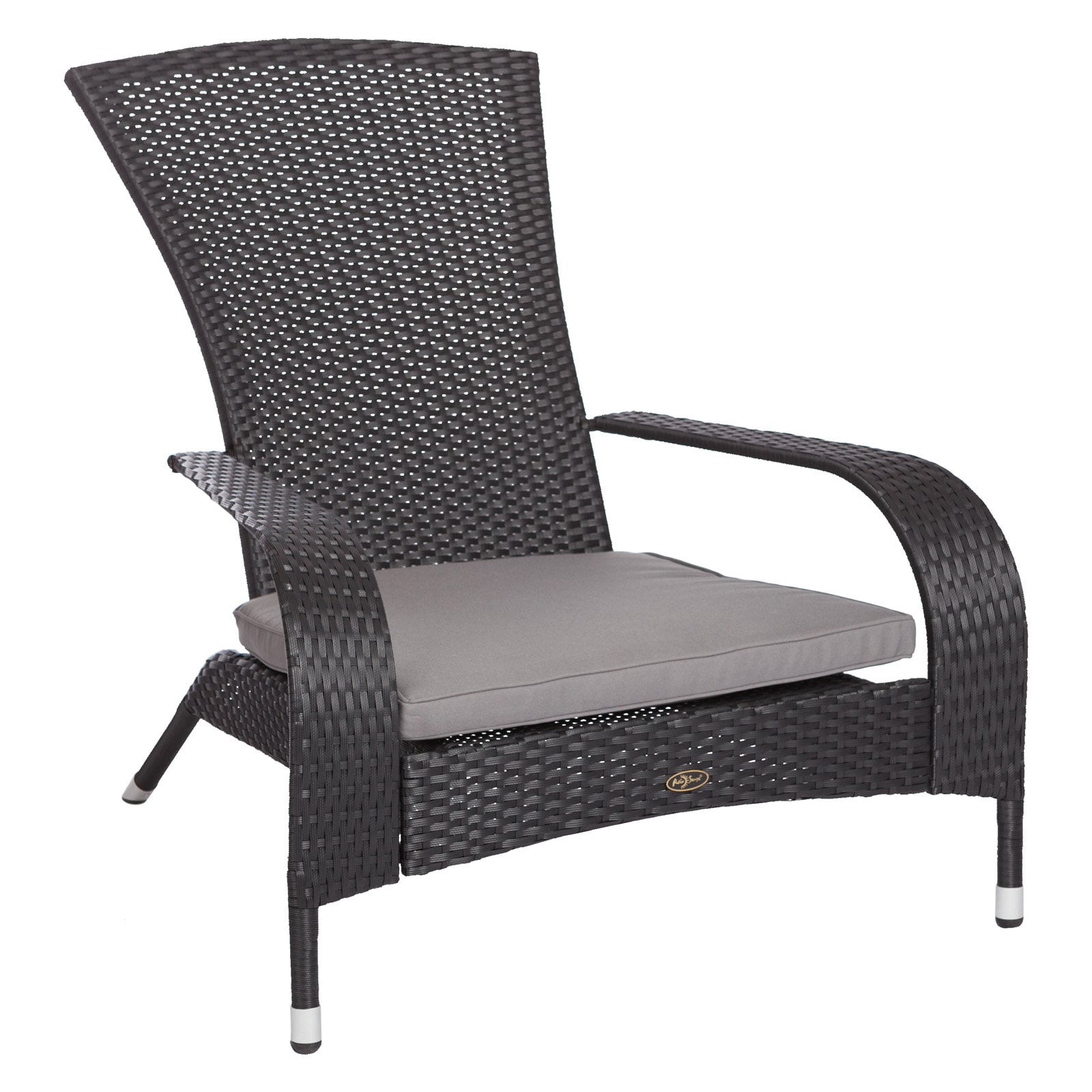 Dimensions: 35W x 34D x 35H in. Constructed from all-weather wicker Chic black finish Includes gray outdoor-ready cushion Adirondack-style chair Maintenance-free design ideal for year-round use Durable yet lightweight for easy portability