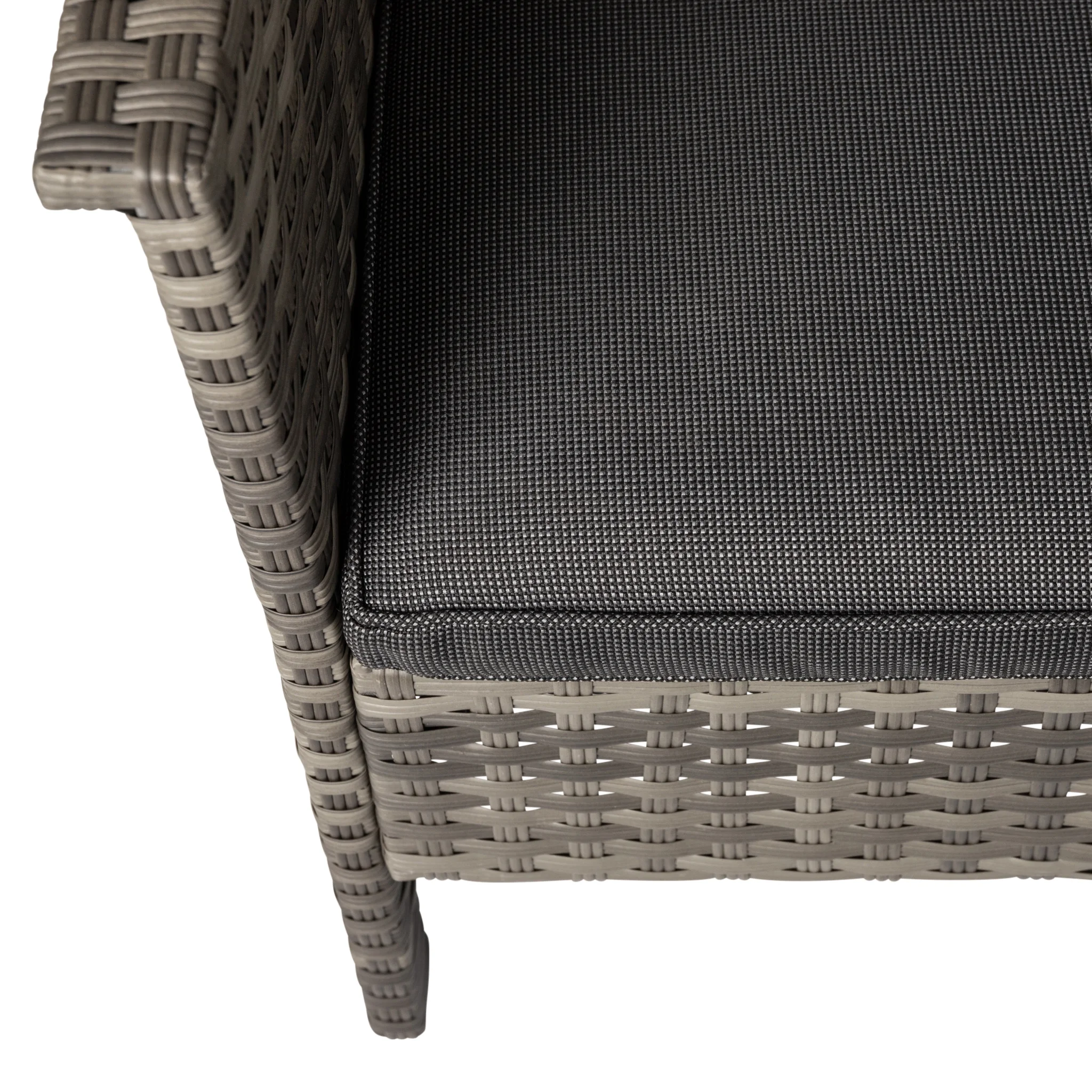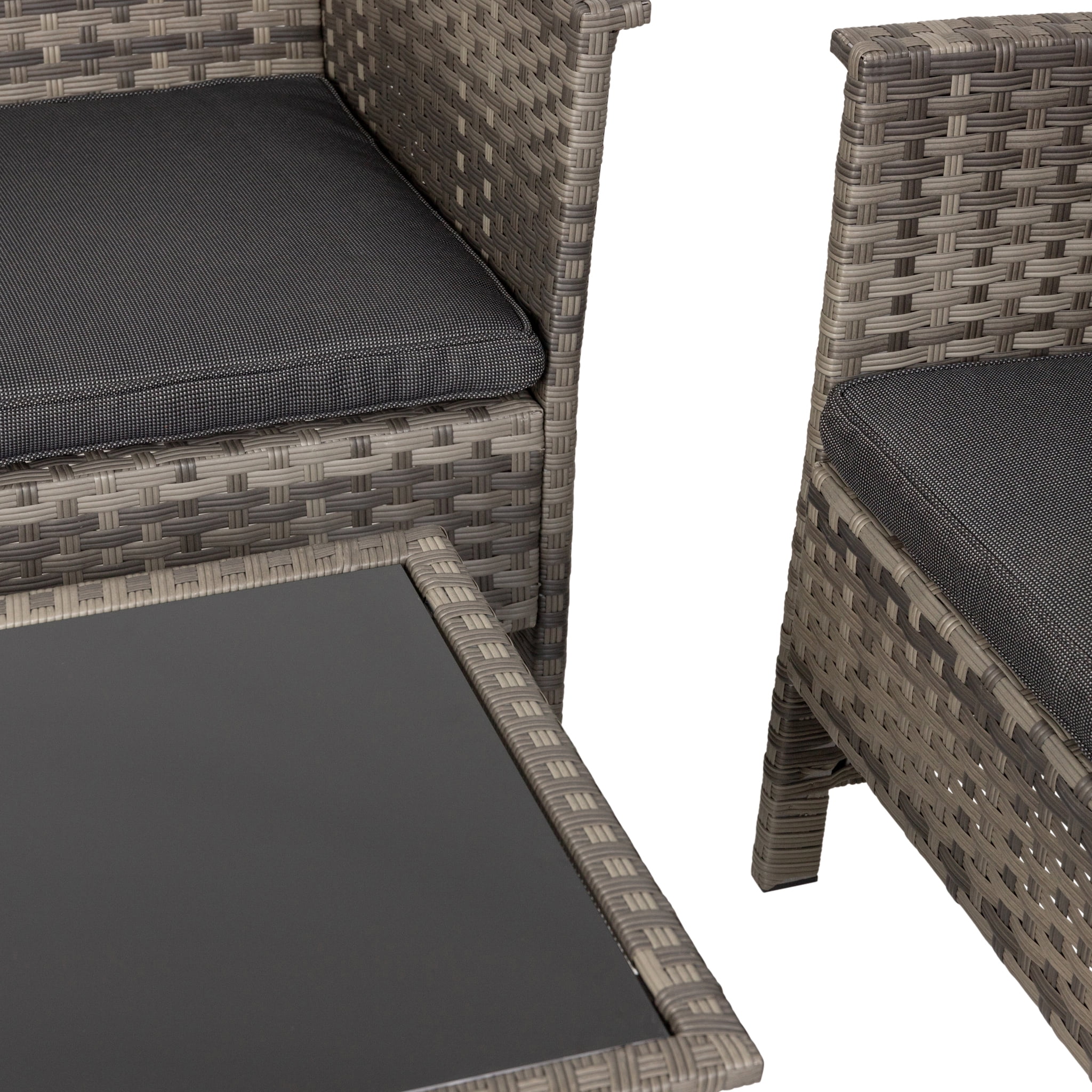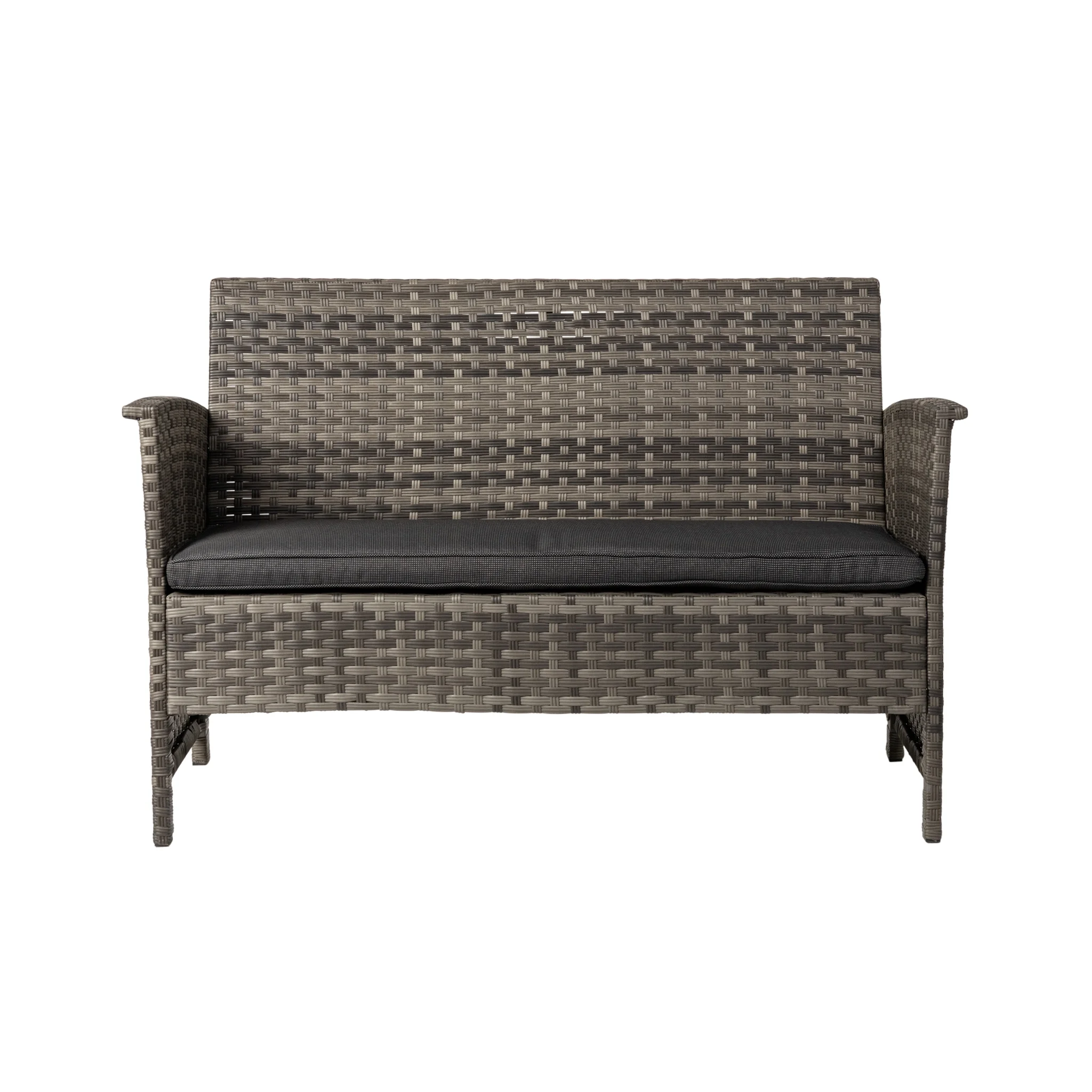Resin wicker with steel frame and outdoor cushions Weathered gray and charcoal gray finish Modern styling Loveseat dimensions: 46.5W x 25.25D x 29.5H in. Chair dimensions: 25.25W x 25.25D x 29.5H in. Coffee table dimensions: 31W x 18D x 15.75H in.
