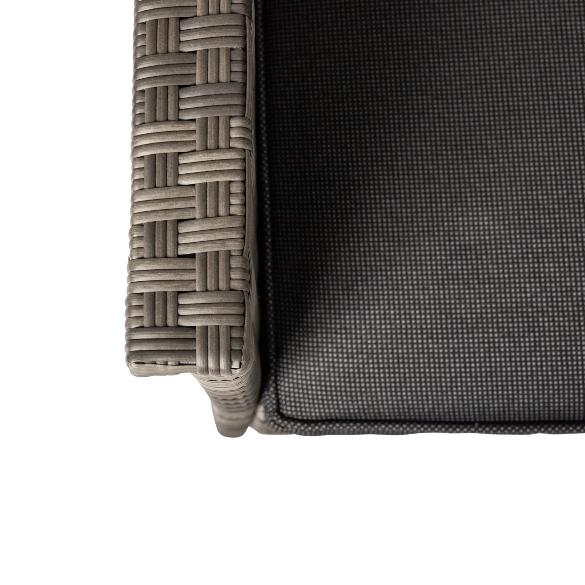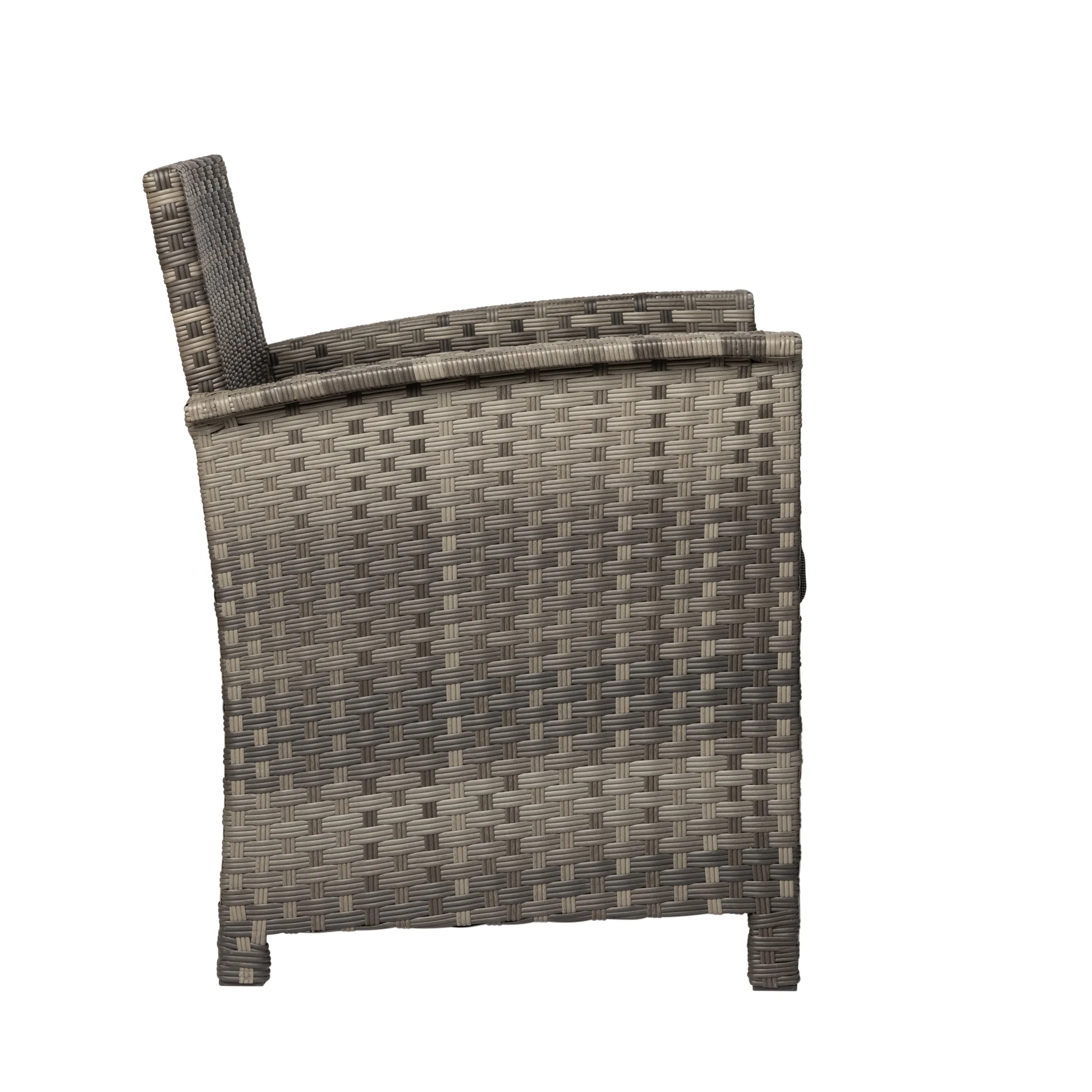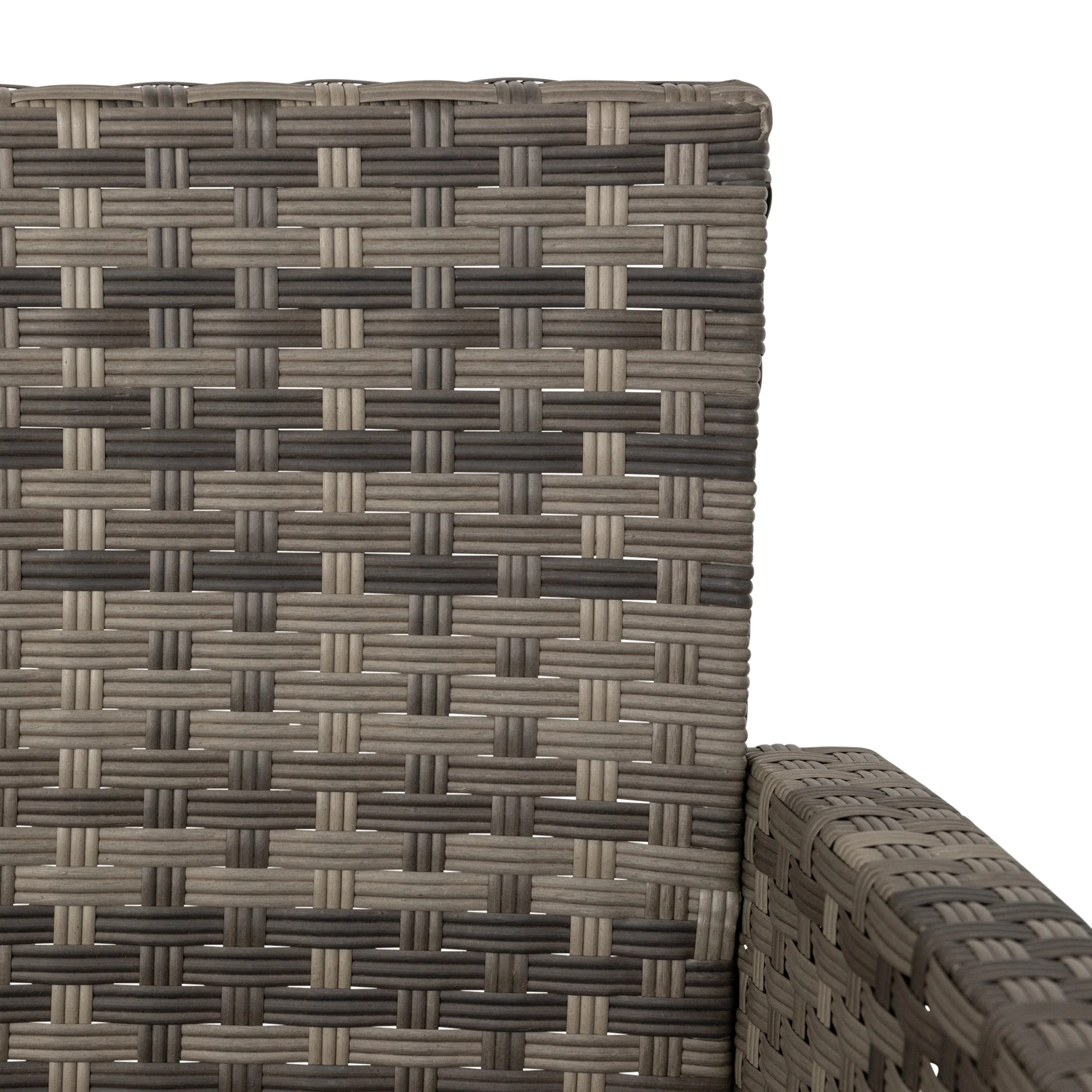 Resin wicker with steel frame and outdoor cushions Weathered gray and charcoal gray finish Modern styling Loveseat dimensions: 46.5W x 25.25D x 29.5H in. Chair dimensions: 25.25W x 25.25D x 29.5H in. Coffee table dimensions: 31W x 18D x 15.75H in.