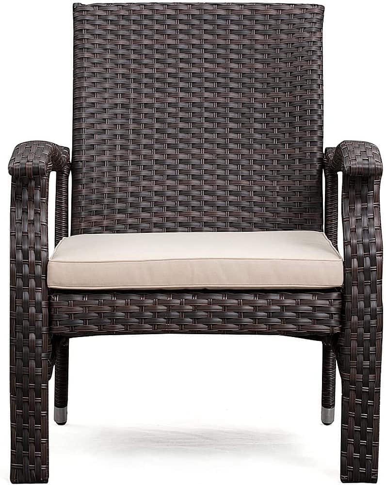 The Patio Sense Miles Outdoor Square Wicker 3 Piece Patio Set is constructed of all-weather wicker and includes comfortable beige cushions. The lightweight yet durable armchairs and glass-topped occasional table are perfect for enjoying an evening on the patio or relaxing poolside. The attractive mocha finish is the ideal accent for any patio. This wicker set can be used year-round and provides a maintenance-free outdoor seating experience.