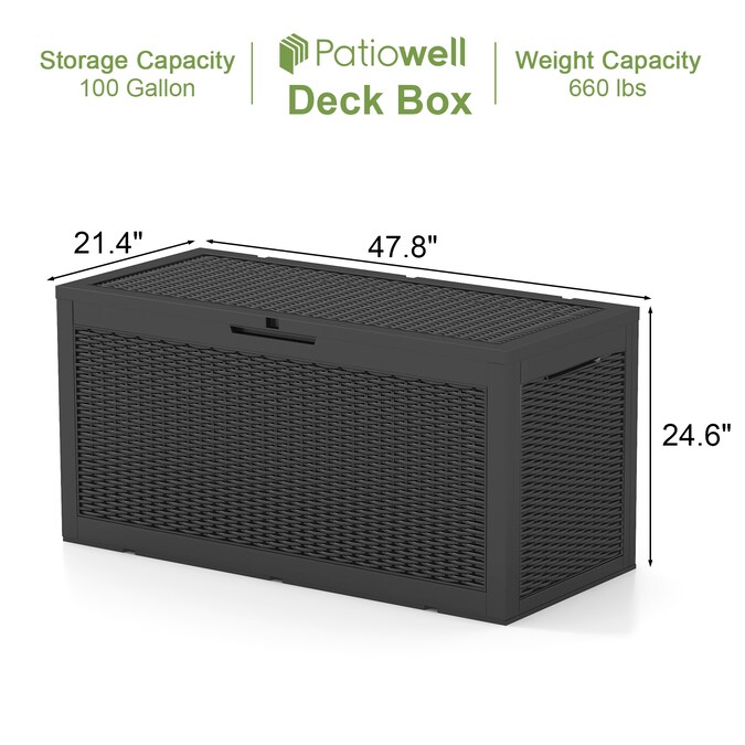 - Super Storage Space: The deck box’s total dimensions are 47.8-in L x 21.4-in W x 24.6-in H, with a storage capacity of 100 Gallons.