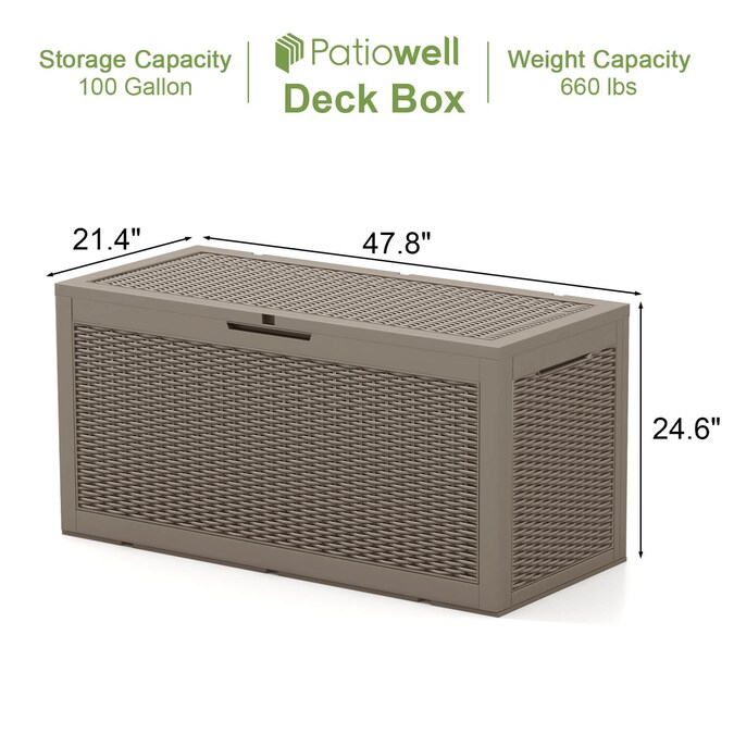 - Super Storage Space: The deck box’s total dimensions are 47.8-in L x 21.4-in W x 24.6-in H, with a storage capacity of 100 Gallons.