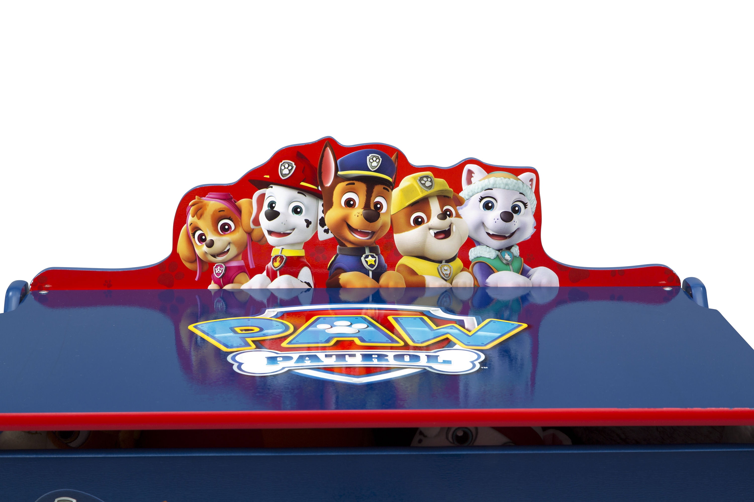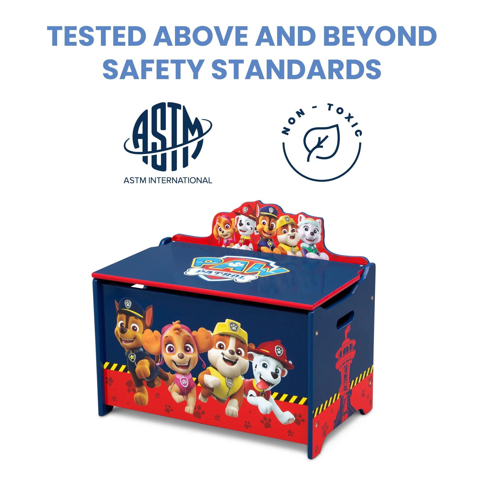 Rescue the playroom or bedroom from clutter with this Nick Jr. PAW Patrol Deluxe Toy Box by Delta Children. Perfect for keeping your little one’s toys, dress up clothes or games organized, this sturdy storage piece features a spacious interior and durable wood construction with rounded corners, smooth edges and a slow-closing lid for your little one’s safety. Adorned with colorful graphics of Chase, Marshall, Rubble, Skye and Everest, it showcases all your child’s favorite pups from PAW Patrol. About PAW Patrol: From Marshall the firedog to Chase the police pup to Skye, who flies high in her copter, each pup brings unique personality and skill to the team, modeling the importance of teamwork and good citizenship. They all have special Pup Packs on their backs to help them handle anything – from rescuing kittens to saving a train from a rockslide! No matter how big the adventure, the PAW Patrol always has time for a game, a laugh, and an ear scratch from Ryder.
