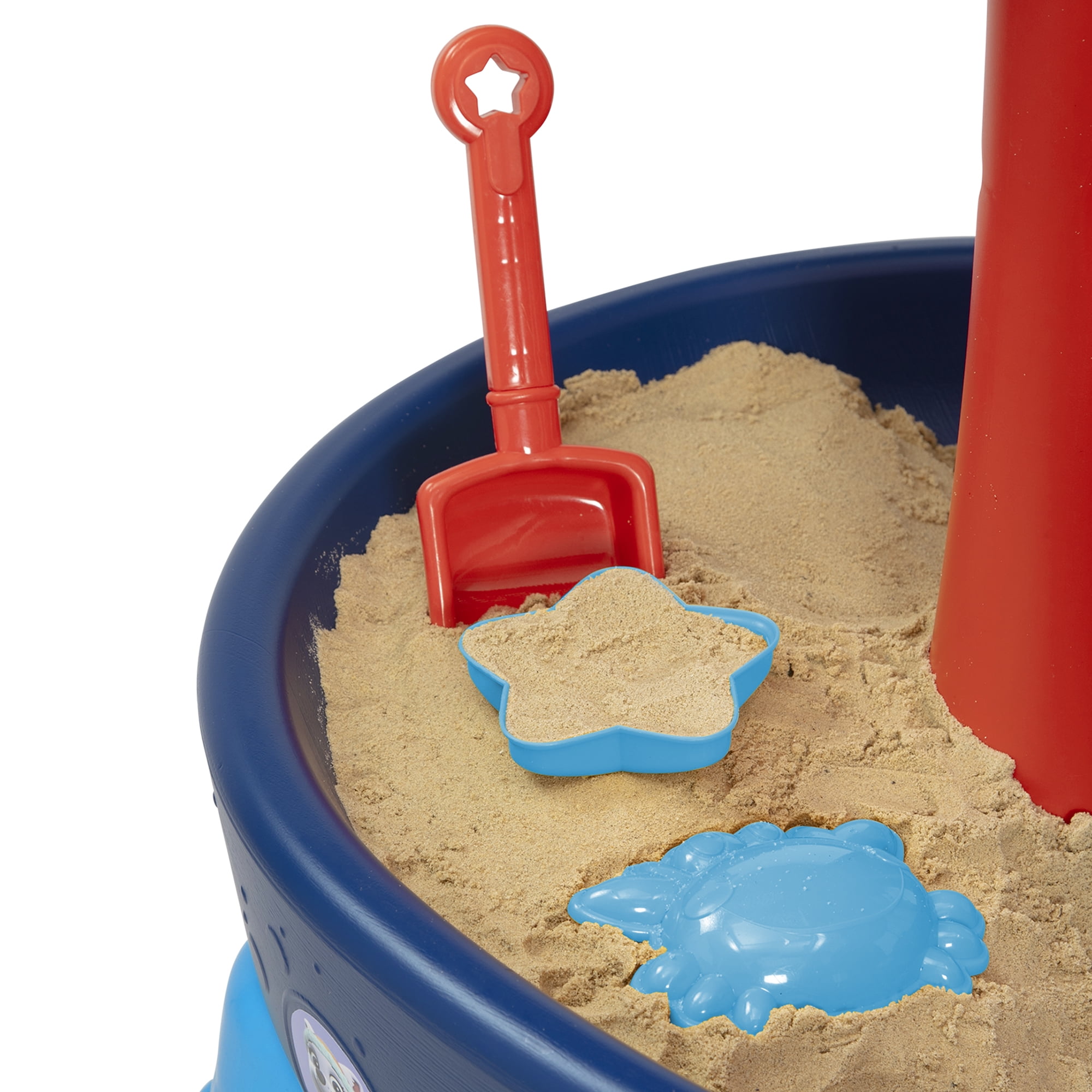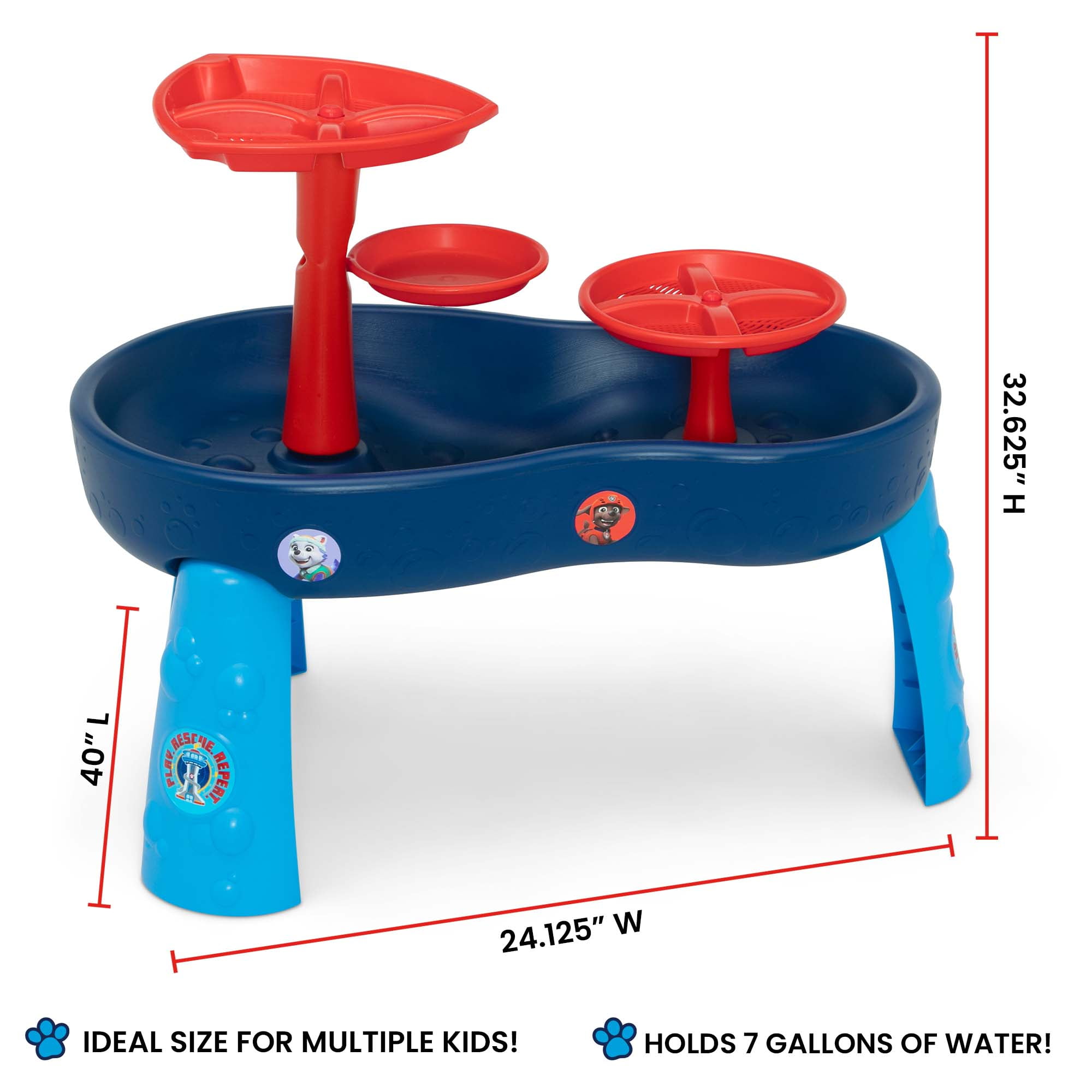 MULTI-USE ACTIVITY TABLE: This 3-Tier Water Table can be used as a water table, sand or sensory table | Abundant sand and water table accessories and multiple play stations for several kids encourages sharing and taking turns with others LEARN THROUGH PLAY: Kids will improve motor skills, sharing skills and their imagination as they explore all this table has to offer | Fill basin with water, snow, sand, beans or rice to create a sensory play area indoors or outdoors, any time of year FOR PAW PATROL FANS: Kids will be amazed by the rotating PAW Patrol shield waterfall feature and spinning waterfall discs | Colorful weather-resistant PAW Patrol stickers decorate the water table WHAT’S INCLUDED: 11 sand and water toys are included with this table | Set includes a bucket, watering can, 2 shovels, 2 scoopers, 3 sand molds and 2 character toys that can also be used as squirt toys SIZE: 24.125”W x 40”L x 32.625”H | Recommended for ages 2+ | Holds up to 7 gallons of water SIZE: 24.125”W x 40”L x 32.625”H | Recommended for ages 2+ | Holds up to 7 gallons of water