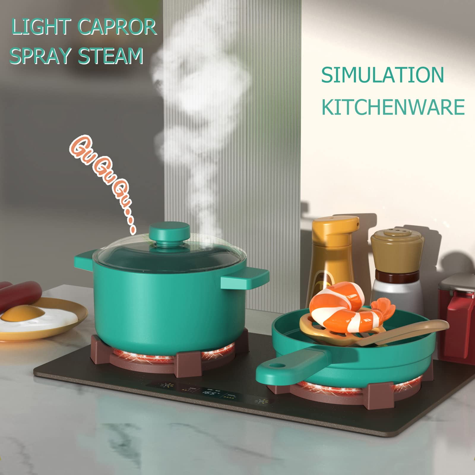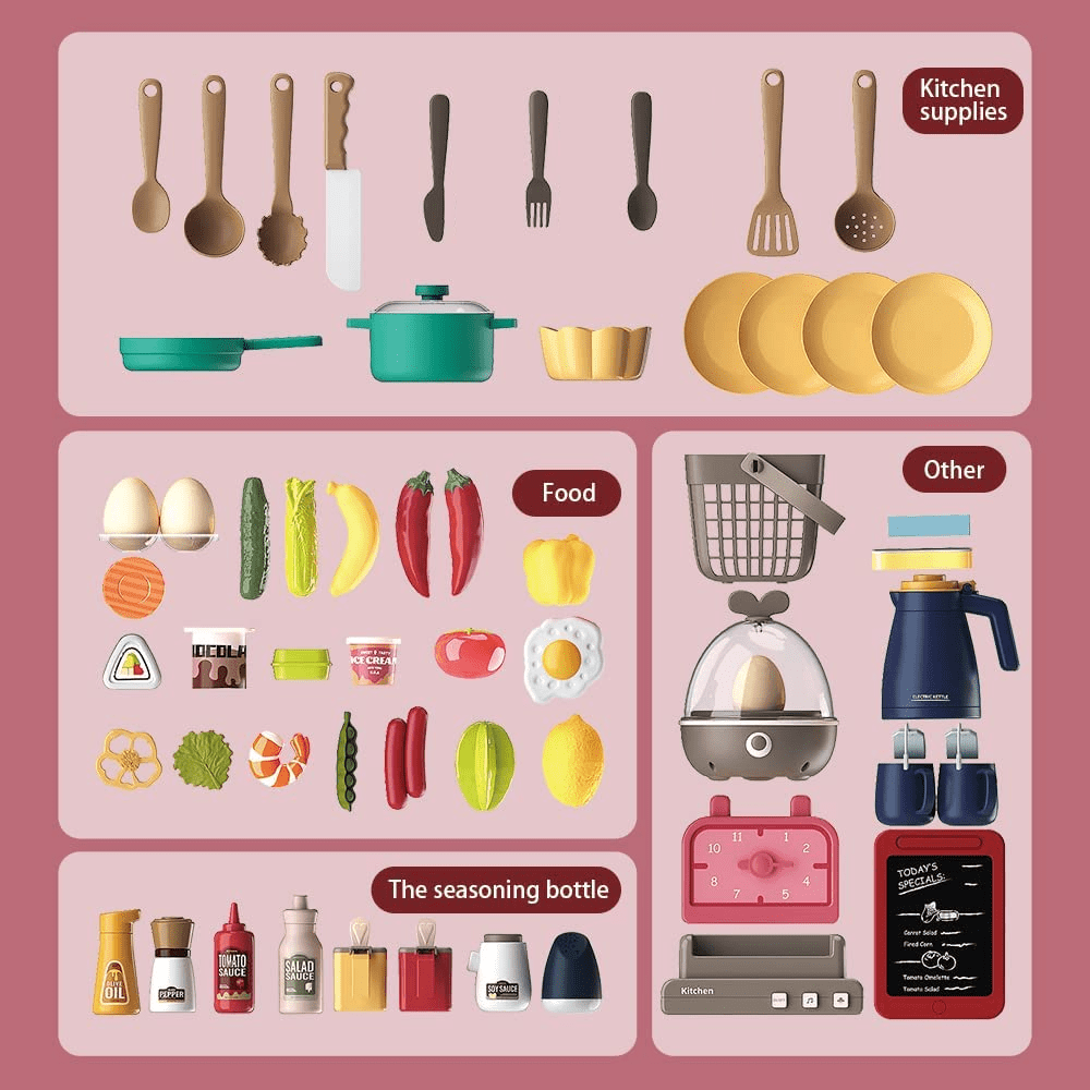 【Large Kids Pretend Kitchen Toy】 – The size of children’s kitchen toy set is: 33*8.6*24in. 63-Piece Play Kitchen Accessory Set included electronic stovetop,play sink with running water,rotatable egg steamer,oven,refrigerator,Mini blackboard and kinds of kitchen accessories.Various cooking utensils for your little one to have countless hours of fun and play. 【Real Kitchen Experience】- Pretend stovetop burner features realistic electronic lights and sounds.Place the pot and pan on the stove,turn on the button, Spray will comes out while your kids cooking.Working lights,sizzling sounds,simulation of spray and play sink add to the pretend play fun! (need 8AA battery, not included) 【Water Circulation Design】- Just add water to the sink, and then manually press the faucet button to drain the water, you don’t need to add water repeatedly. Children can wash food or dishes by imitating real life situations. Fill the water dispenser with water and put it into the sink, and the water will flow out when you press the water dispenser switch. Large storage space and dish racks make storage easier. 【High-Quality Material】- Toy Kitchen Set is made of high-quality materials,easy to assemble, and the edges are smooth and burr-free,allowing children to play safely.Large storage space allows children to organize and store independently. 【Fun and Educational Kitchen Toy】- Kids Kitchen Playset is perfect gift,your child can role-play with friends and parents to strengthen interaction.Learn to recognize the color of vegetables and fruits while playing, exercise hands-on skills,hand-eye coordination,and communication skills.