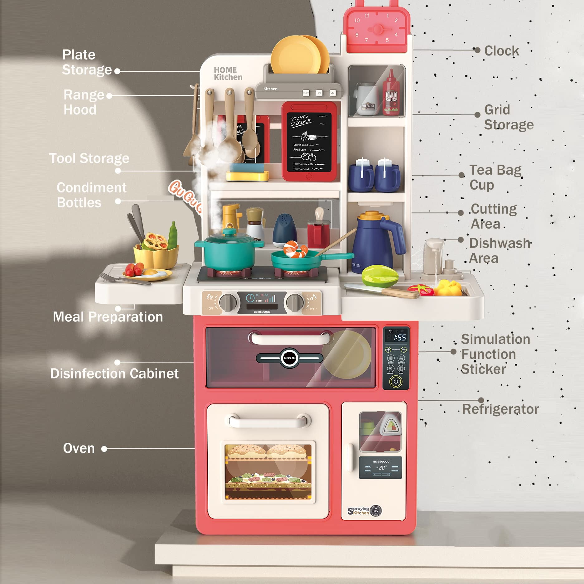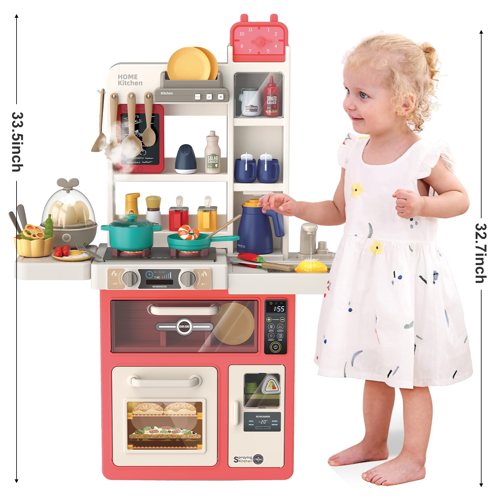 PayUSD Play Kitchen Set for Kids, 63 PCS 33Inch Pretend Play Food Toys Kitchen Set with Realistic Sounds & Lights, Play Sink, Simulation of Spray Kitchen Toys for Toddlers Girls Boys Gift, Pink